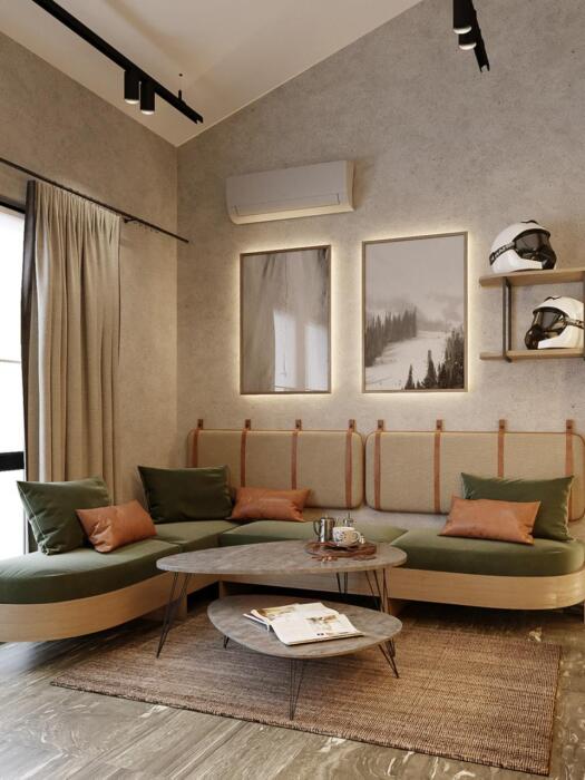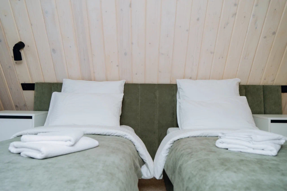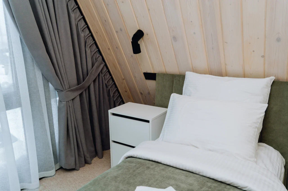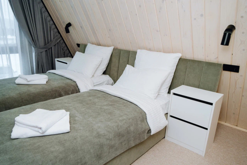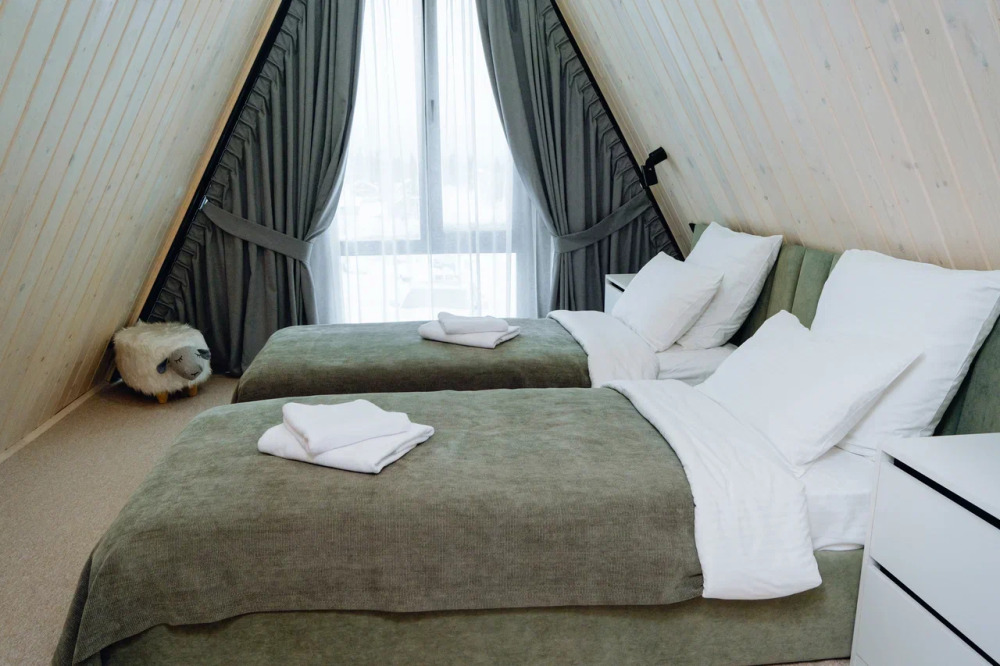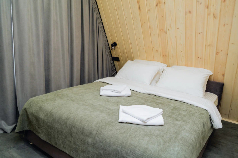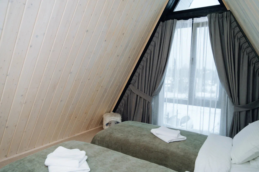 Номерной фонд представлен двухэтажными домиками в стиле а-фрейм с прекрасным видом на горы и огни курорта, рассчитанные для комфортного размещения на 6 человек. В каждом доме есть всё необходимое для комфортного и приятного отдыха: стильный и лаконичный дизайн, удобная мягкая мебель, система кондиционирования. Чтобы быть в курсе всех новостей работает скоростной интернет. Санузел оснащён необходимой сантехникой, стиральной машиной, феном, набором полотенец, средствами по уходу за телом.