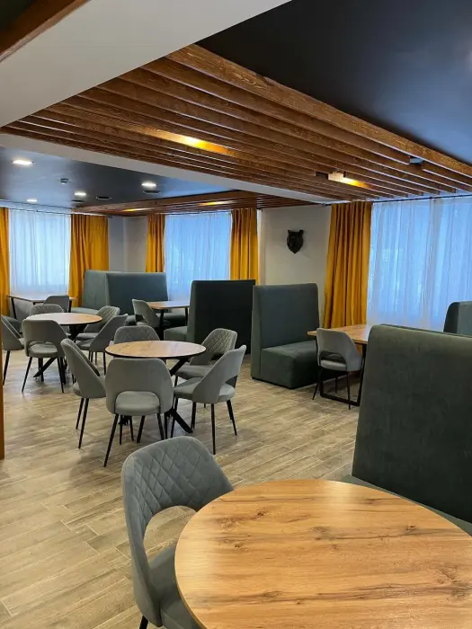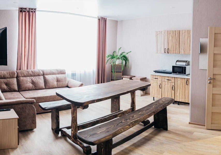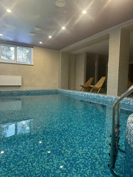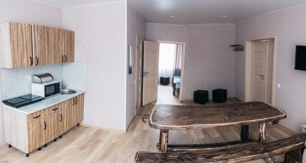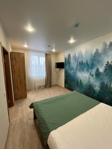 Мы находимся на второй линии, вдали от шума и дискотек, в окружении леса и абсолютной тишины, чтобы вы могли выспаться и насладиться уединением. Номера уютные с большими кроватями и большими окнами, выходящими на лес и гору Зеленая. Также, у нас на территории есть 2 бани из кедрового бруса и зимняя отапливаемая беседка. Летом у нас бассейн под открытым небом, летние беседки, спорт площадка и площадка для волейбола.