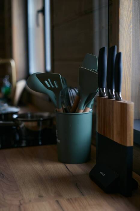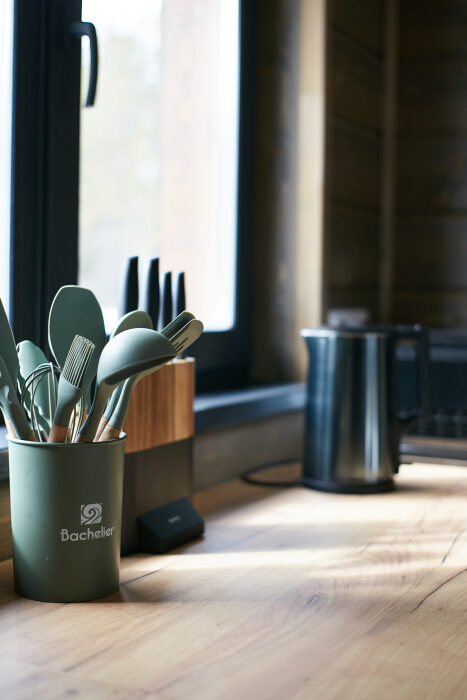 В наличии есть вся необходимая посуда - тарелки, стаканы, бокалы, фужеры, сковородки, кастрюли, столовые приборы, электрический чайник.