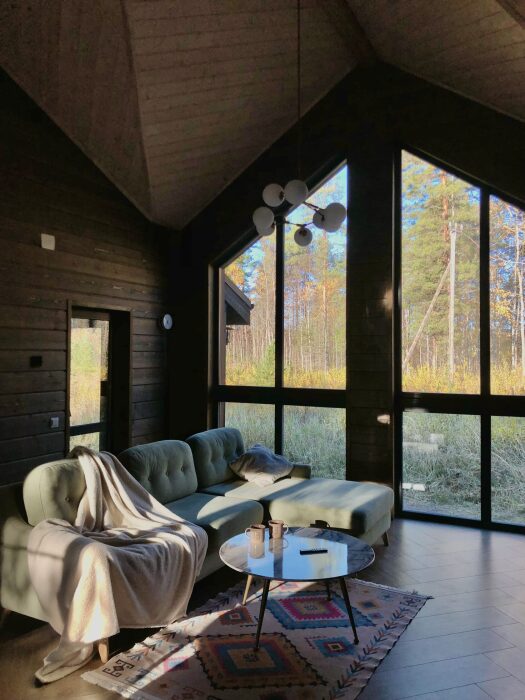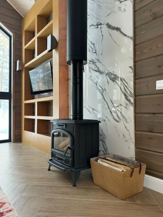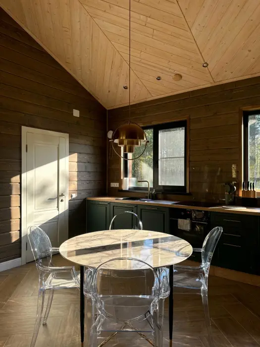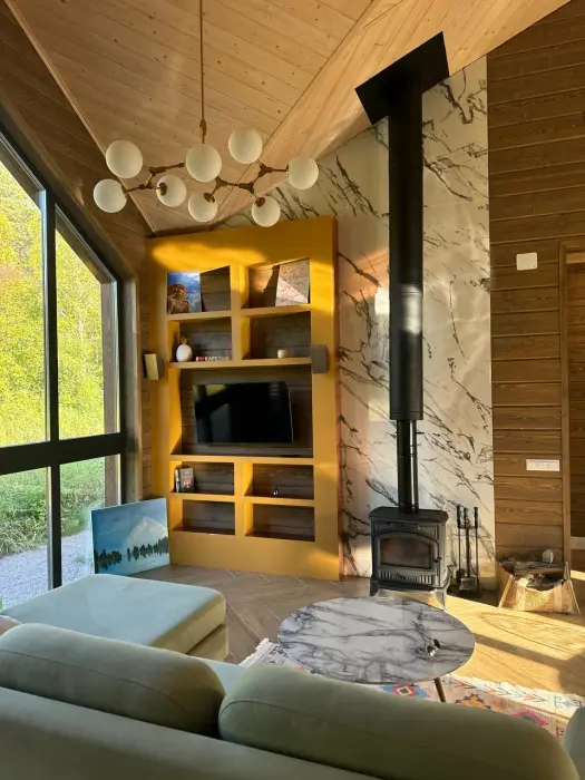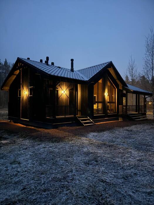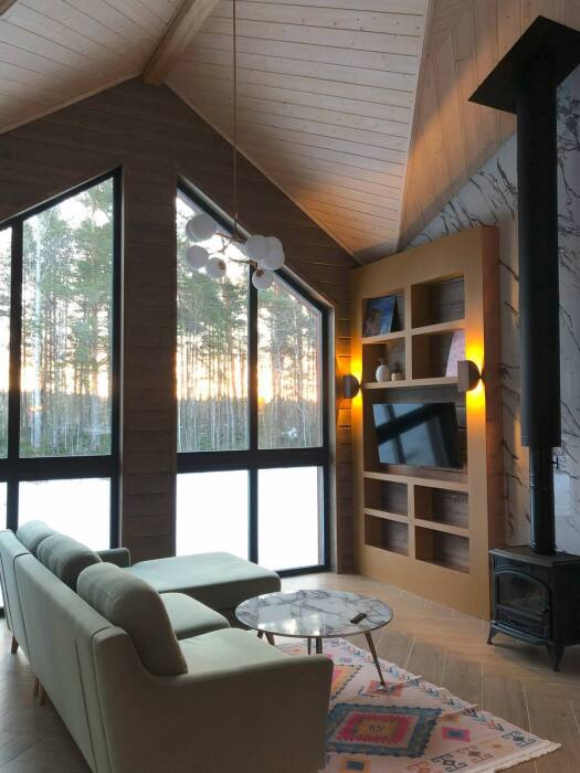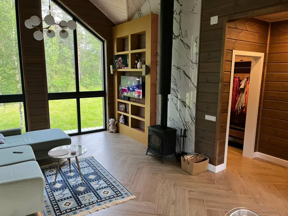 Дом включает в себя единое свободное пространство - гостиную, комфортный диван с полноценным спальным местом, камин на дровах, телевизор с плоским экраном и подключенным интернет ТВ, высокоскоростной Wi-Fi.