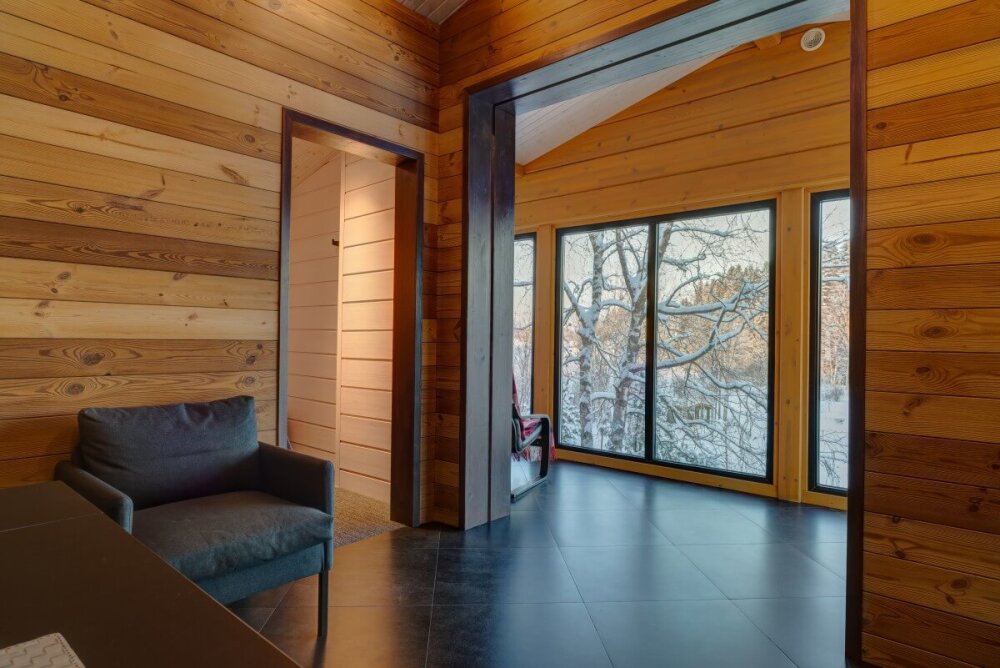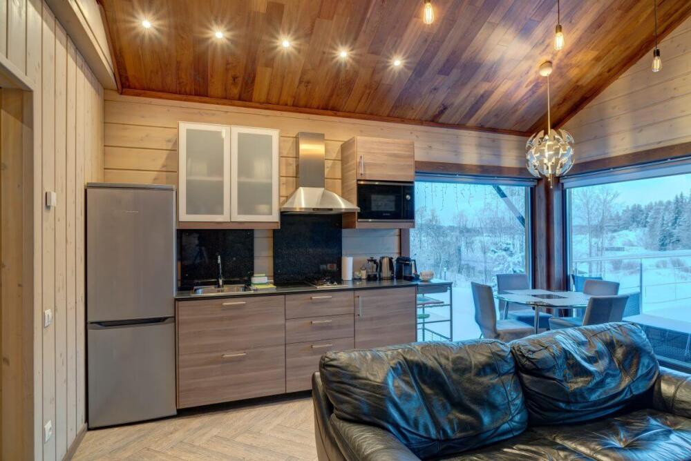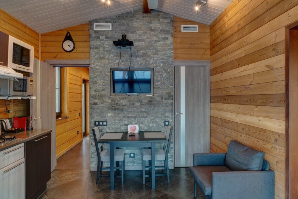 В коттедже есть 2 полноценные спальные комнаты, кухня соединена с гостиной зоной, где особую уютную атмосферу создают панорамные окна, камин и декоративная подсветка.