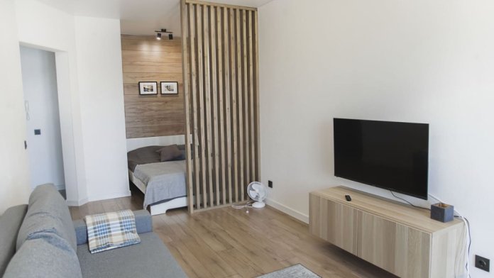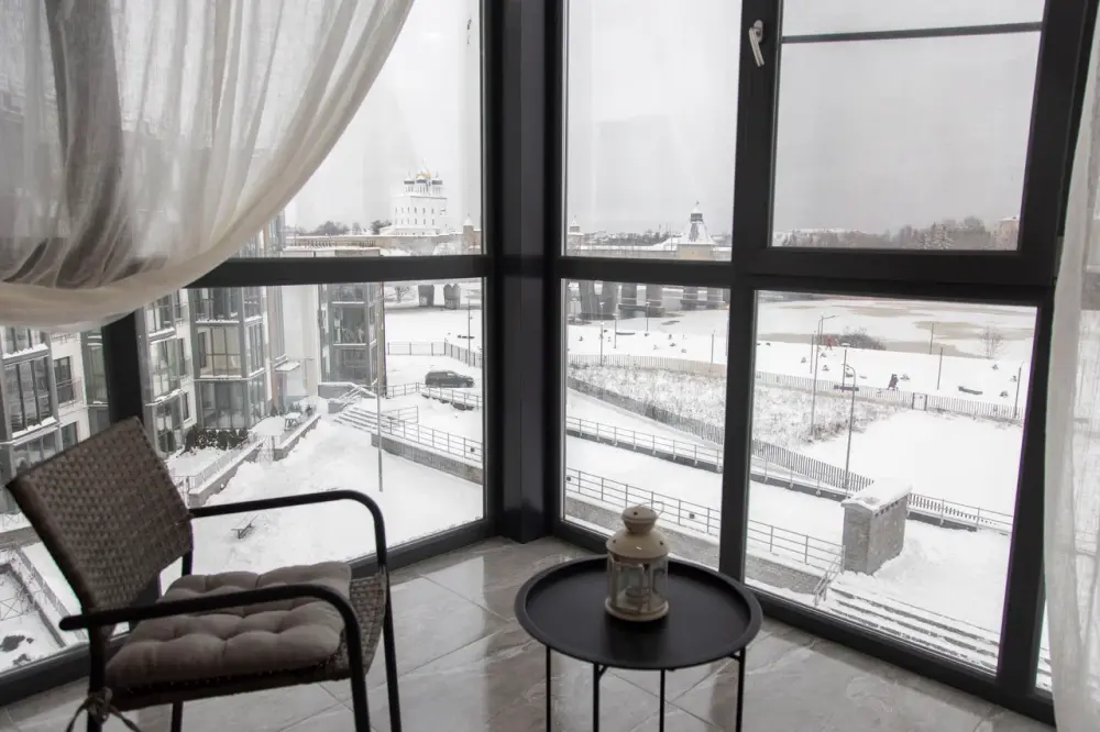 Апартаментов с балконом, подогревом полов, панорамным видом на Кремль и реку Великую. Есть доступ к Wi-Fi. Квартира находится на 4 этаже, в подъезде имеется лифт. Во дворе расположена большая детская площадка и парковка.