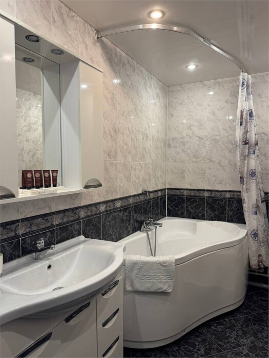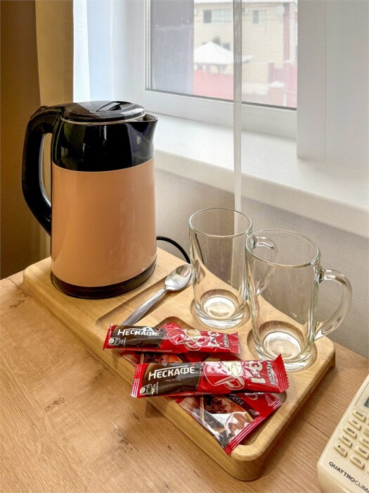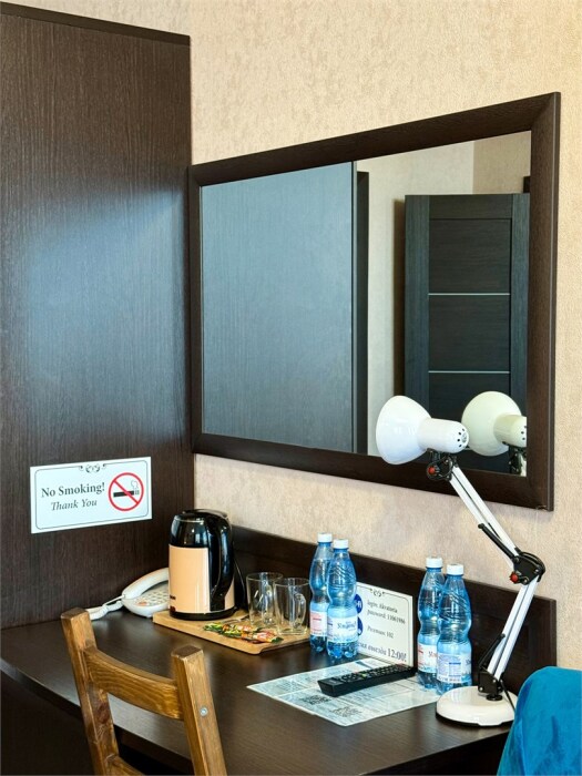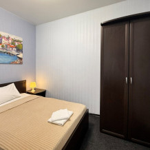 В нем есть все необходимое для комфортного проживания: односпальная кровать (80x200), рабочее место, жк телевизор со спутниковым тв, телефон и интернет, фен, душевая кабина, зеркала, предметы первой необходимости (гель для душа, шампунь, тапочки).
