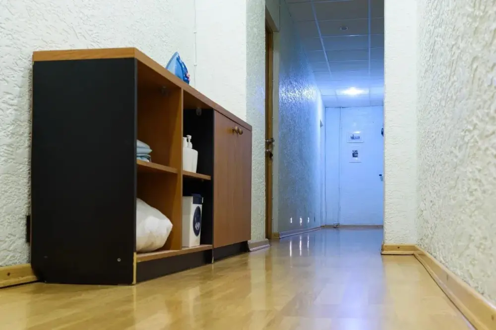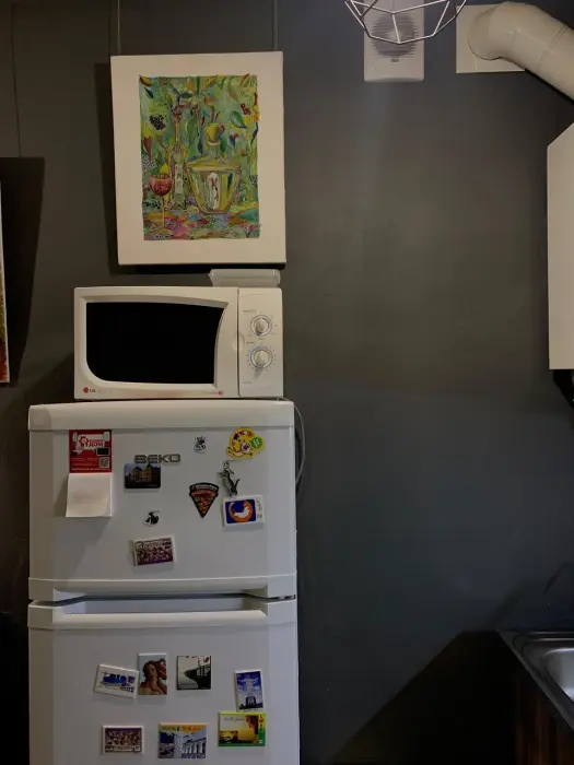 На территории имеется кухня и столовая зона. Бесплатно предоставляются продукты для завтрака (хлеб, молоко, масло, джемы, крупы), а также свежесваренный кофе, который можно пить в неограниченных количествах. В общей зоне расположены гладильные принадлежности (гладильная доска и утюг), вместительная сушилка для белья, стиральный порошок. Все это находится в общем доступе и предоставляется бесплатно.