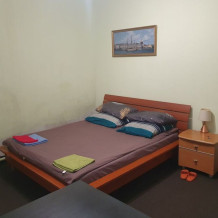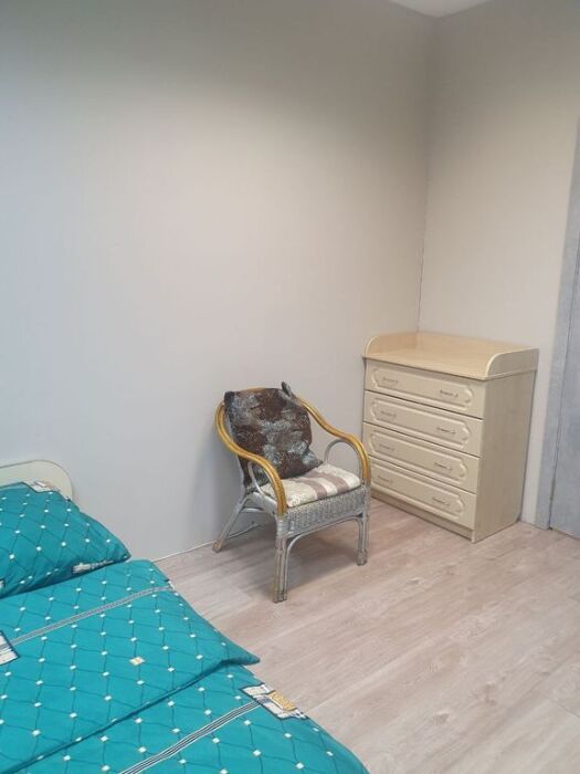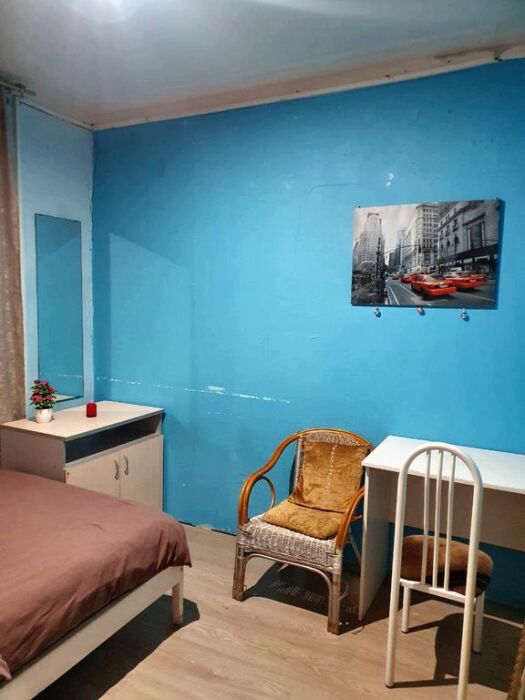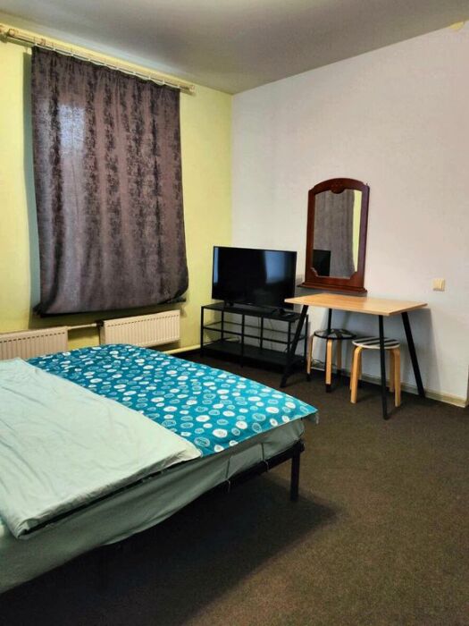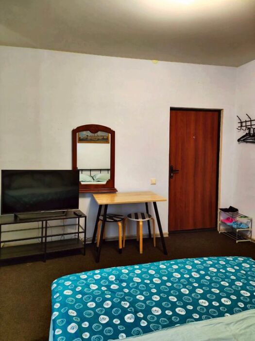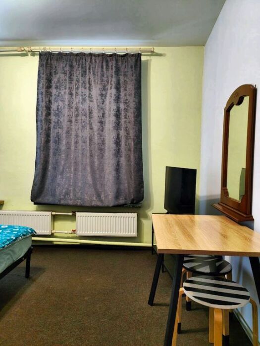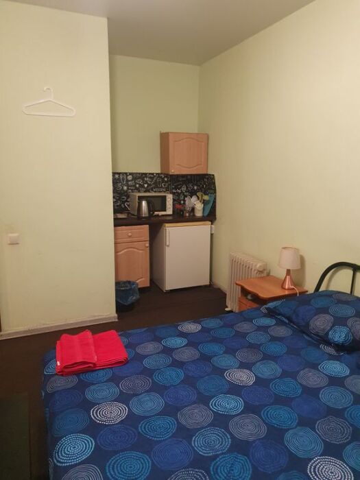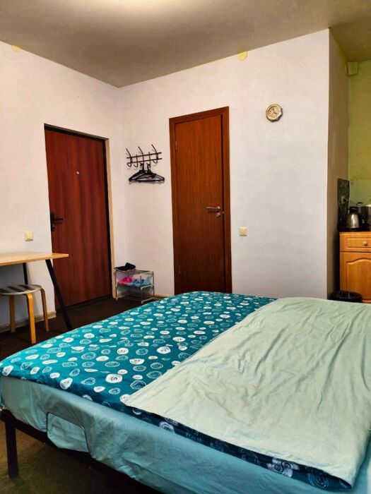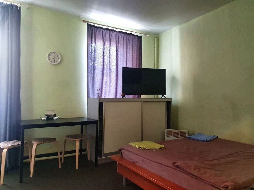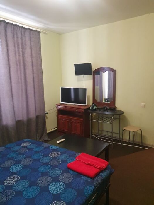 В комнате удобная полутороспальная кровать и чистое бельё, а так же обеденный стол и стулья, тумба для хранения вещей, светильник, обогреватель. Конечно же есть wi-fi.