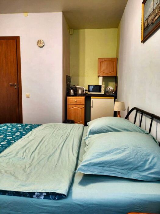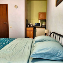 В каждой студии имеется свой санузел, зона кухни, телевизор, обеденный стол и удобная двуспальная кровать.
