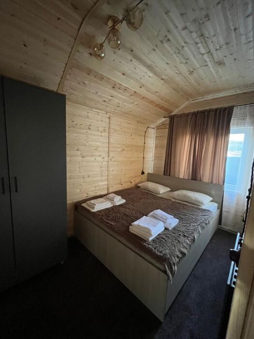 Вместимость 1 домика до 4 человек (2-спальная кровать и раскладной диван).