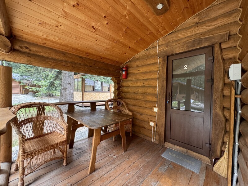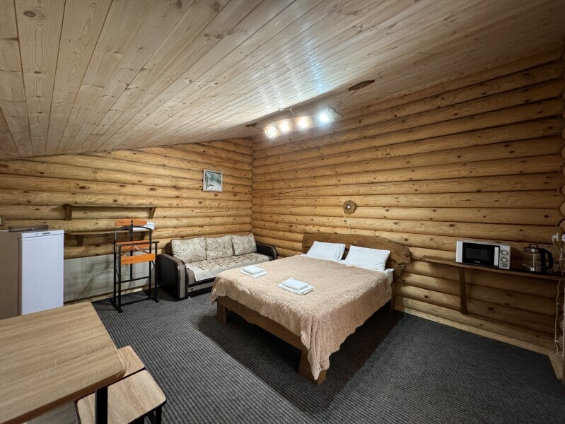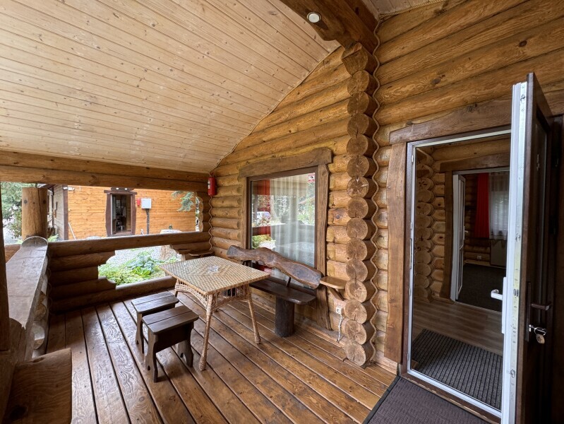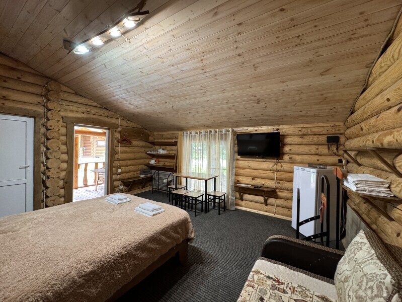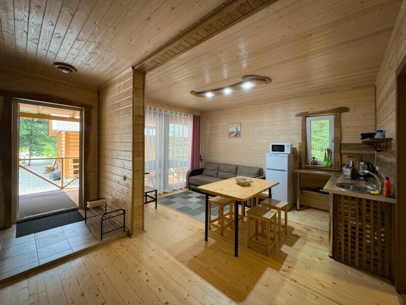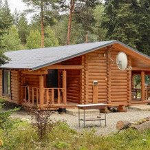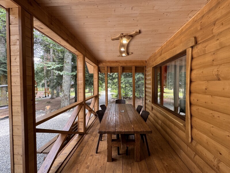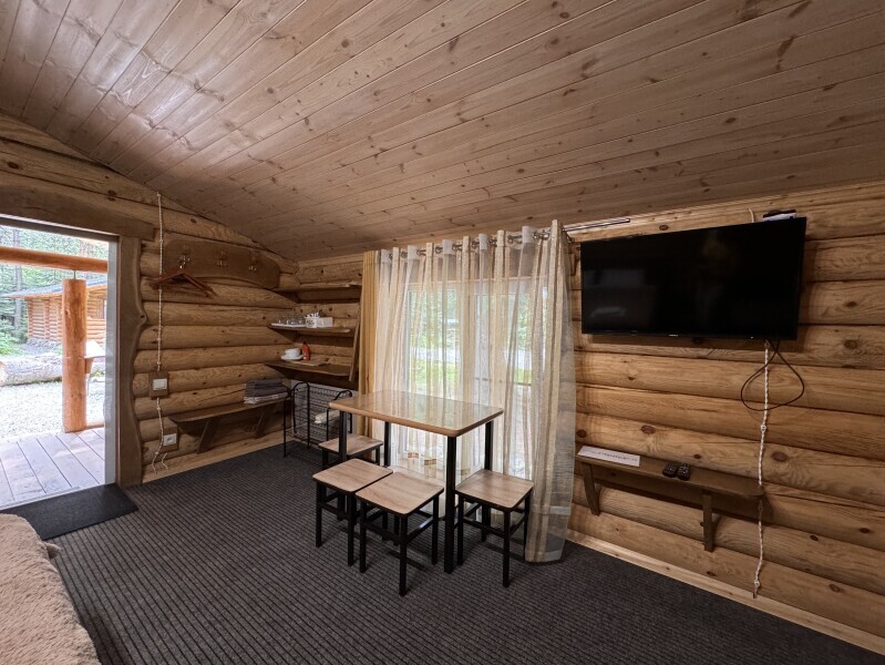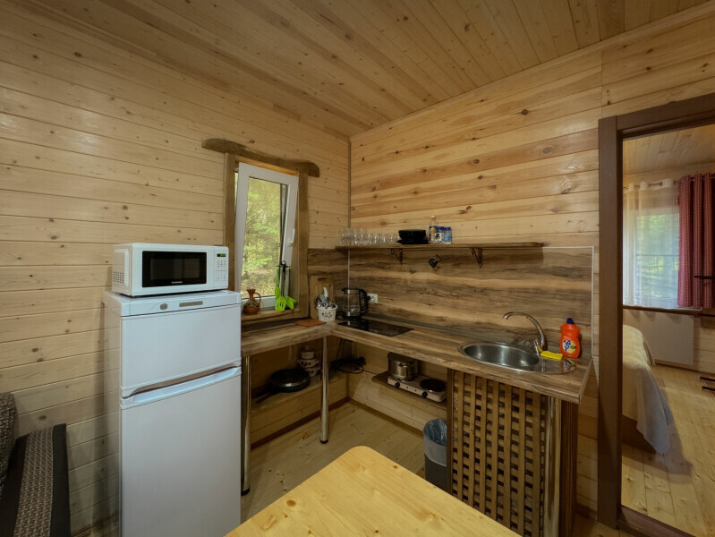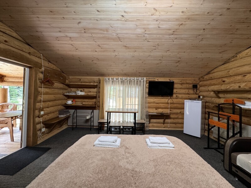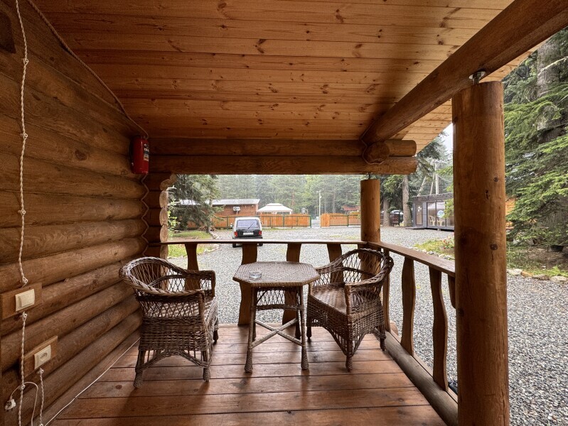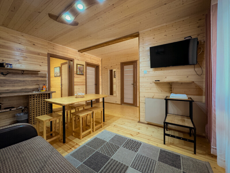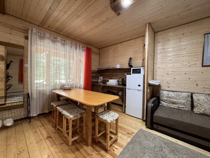 Деревянное шале имеет террасу с мебелью и мангальную зону. Внутри есть всё необходимое: бытовая техника, посуда, удобная мебель, постельное бельё, санузел, душ и полотенца.