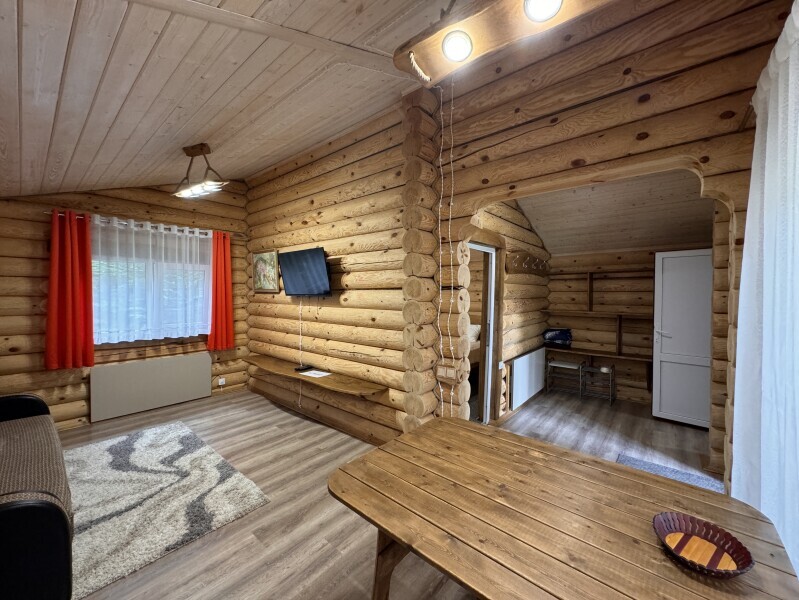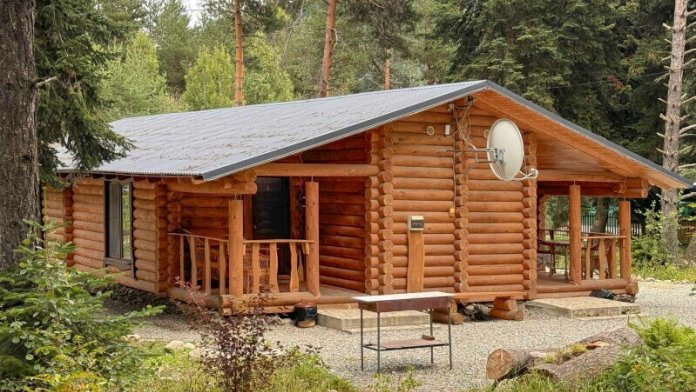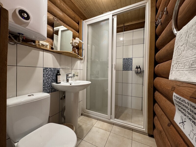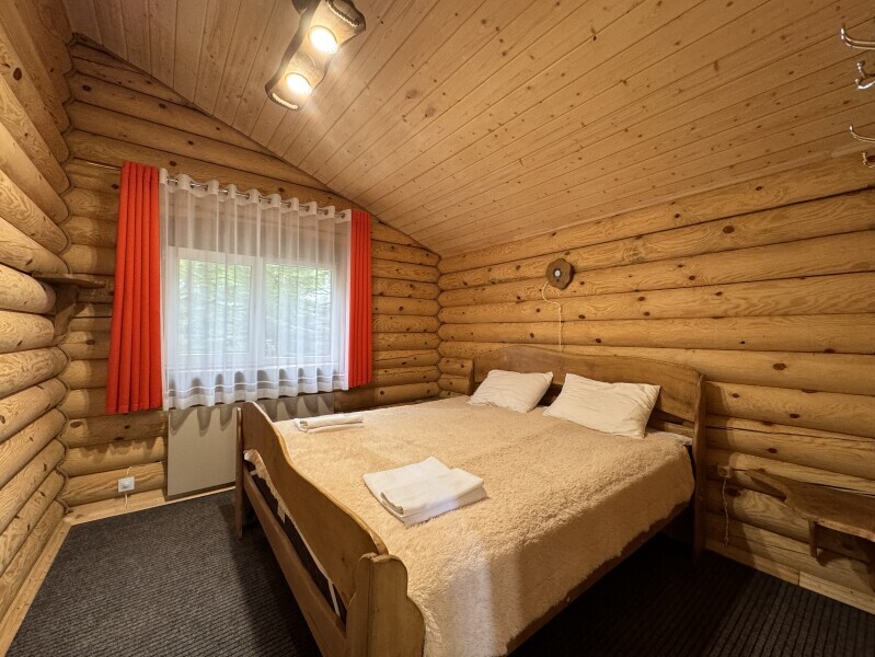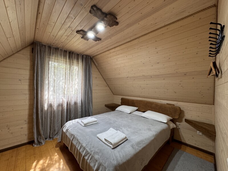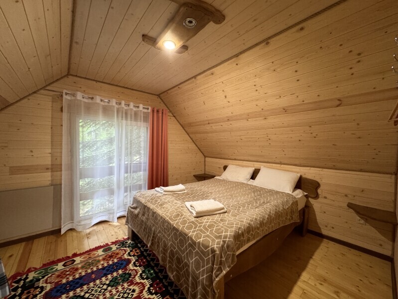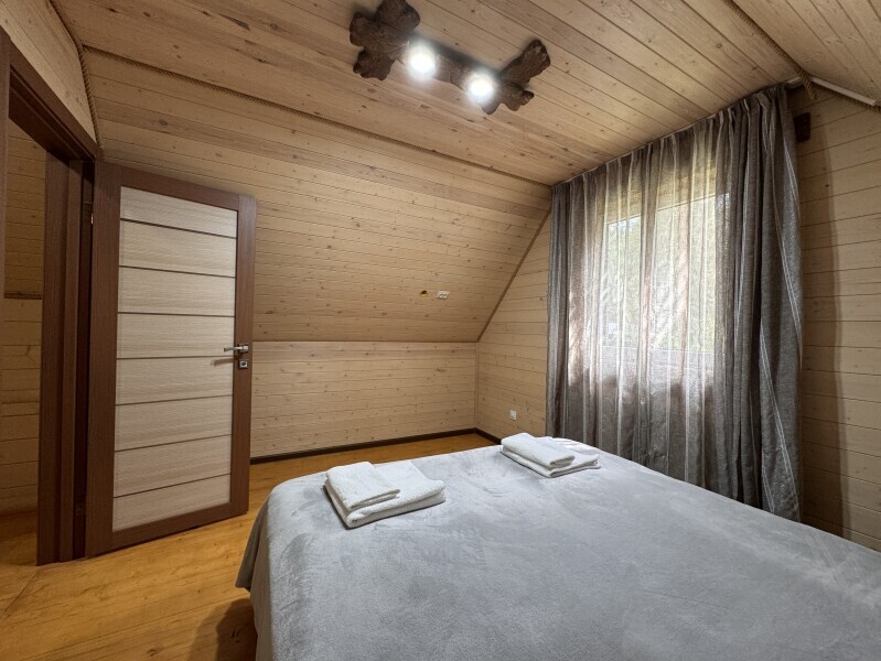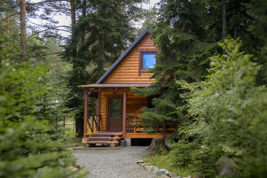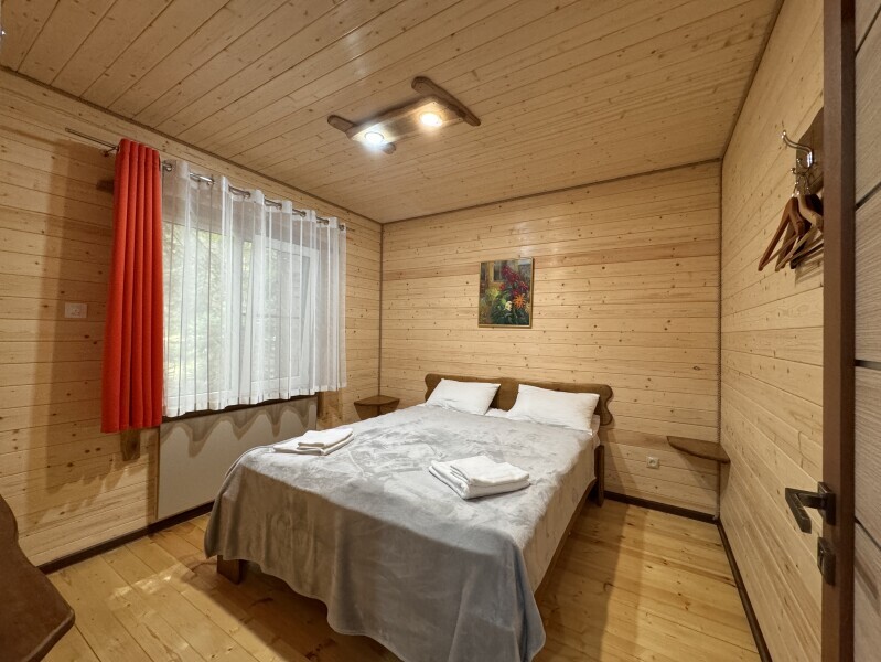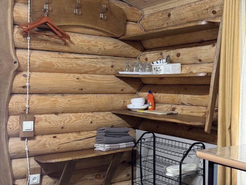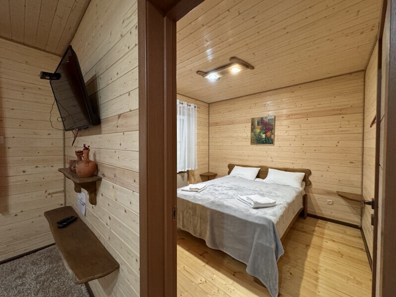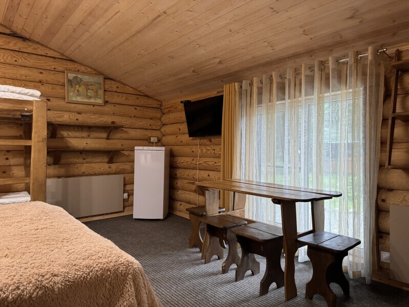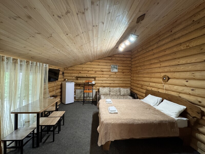 Деревянное шале имеет террасу с мебелью и мангальную зону. Внутри есть всё необходимое: бытовая техника, посуда, удобная мебель, постельное бельё, санузел, душ и полотенца.