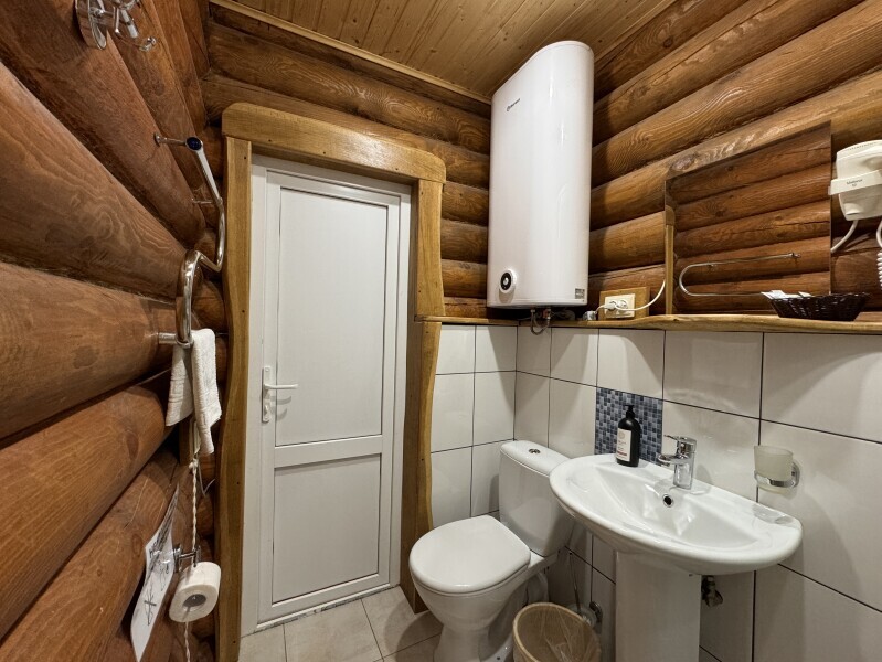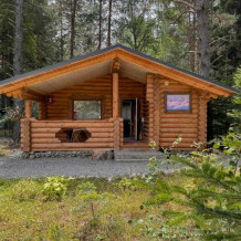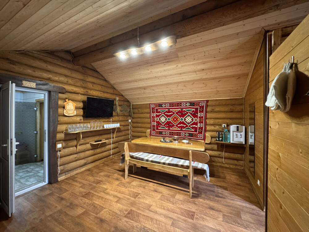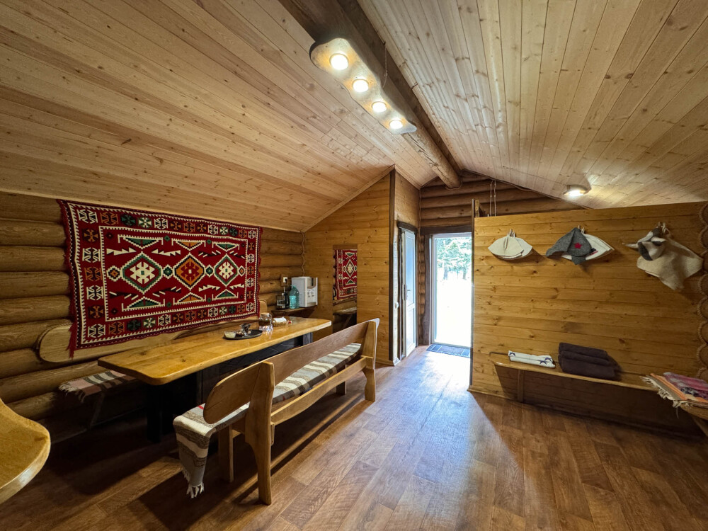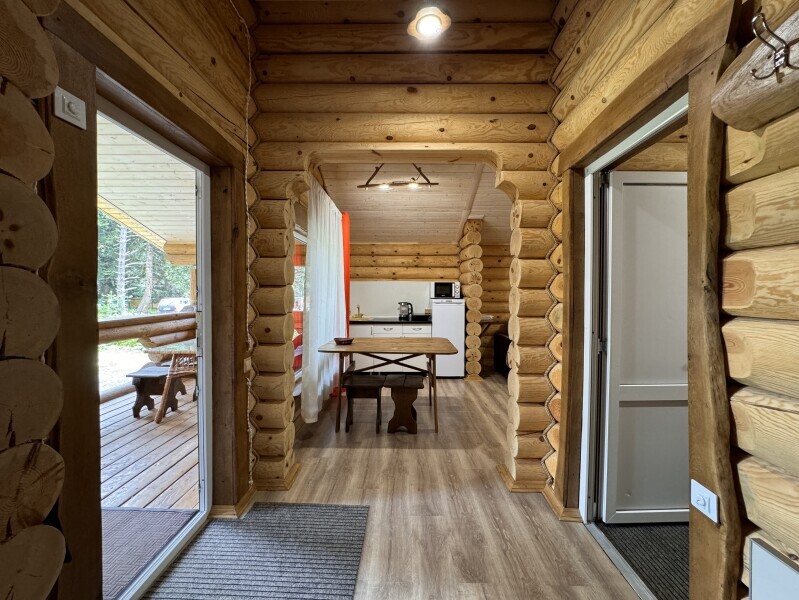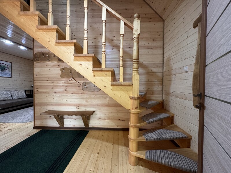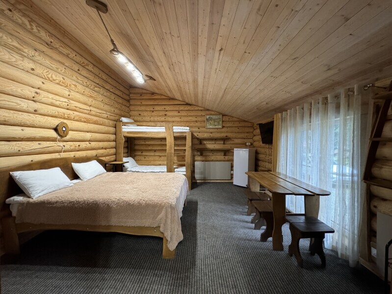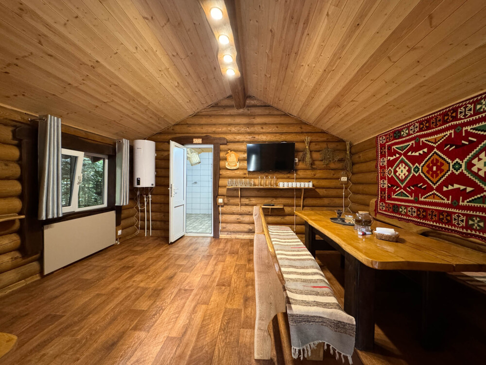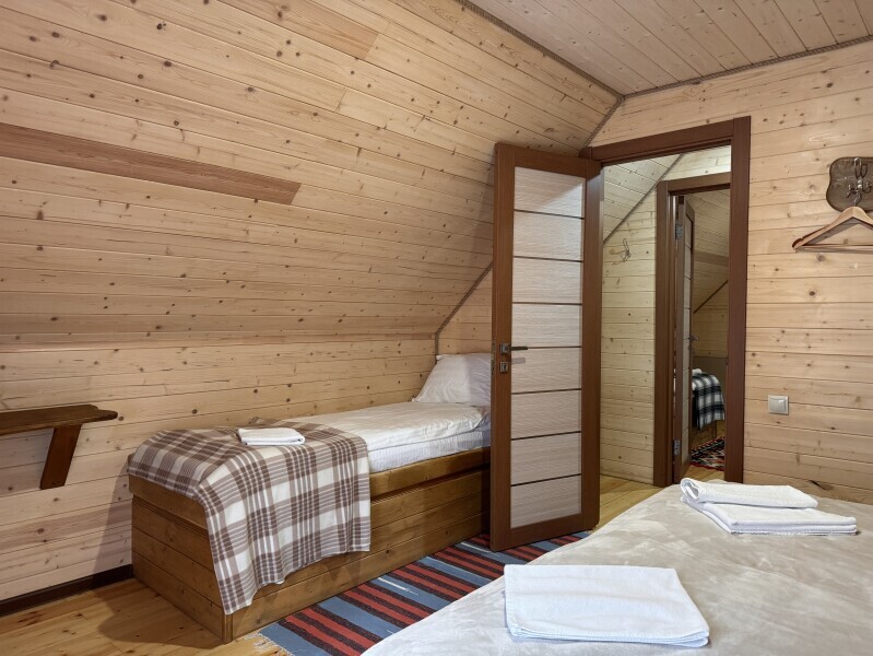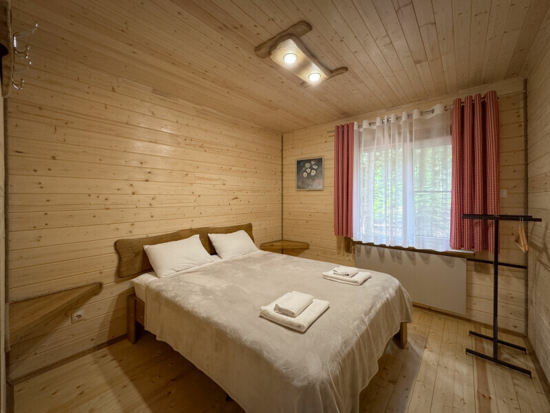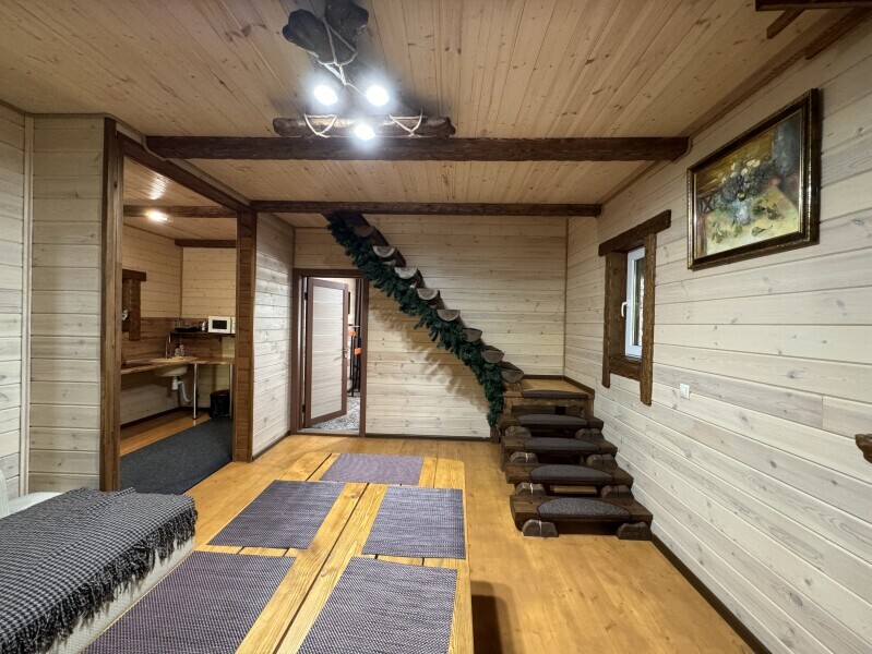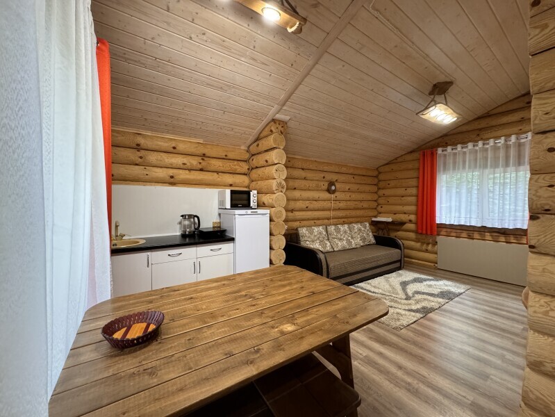 Деревянное шале имеет террасу с мебелью и мангальную зону. Внутри есть всё необходимое: бытовая техника, посуда, удобная мебель, постельное бельё, санузел, душ и полотенца.