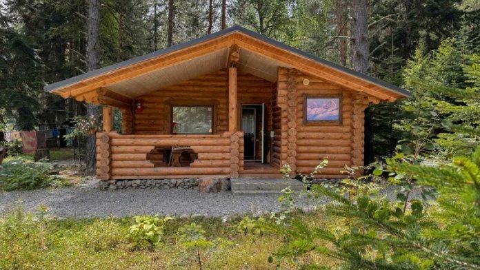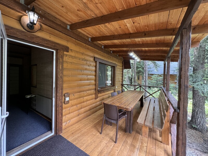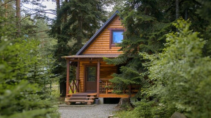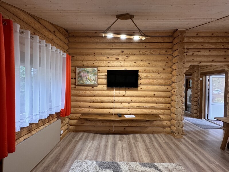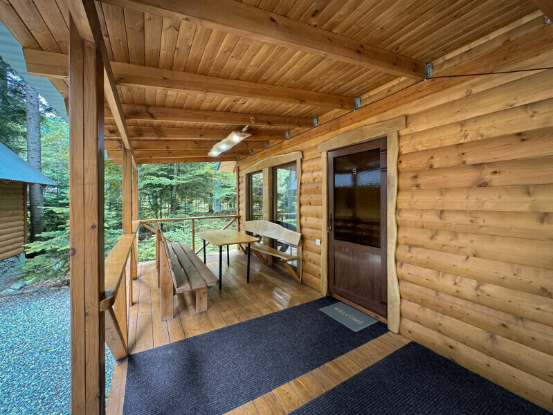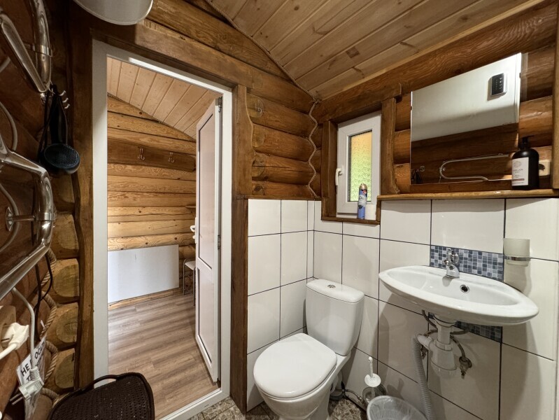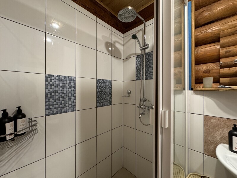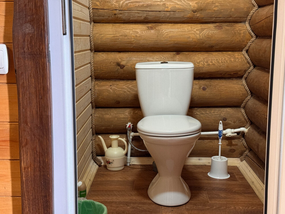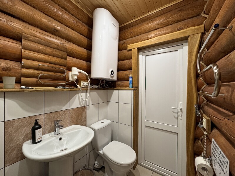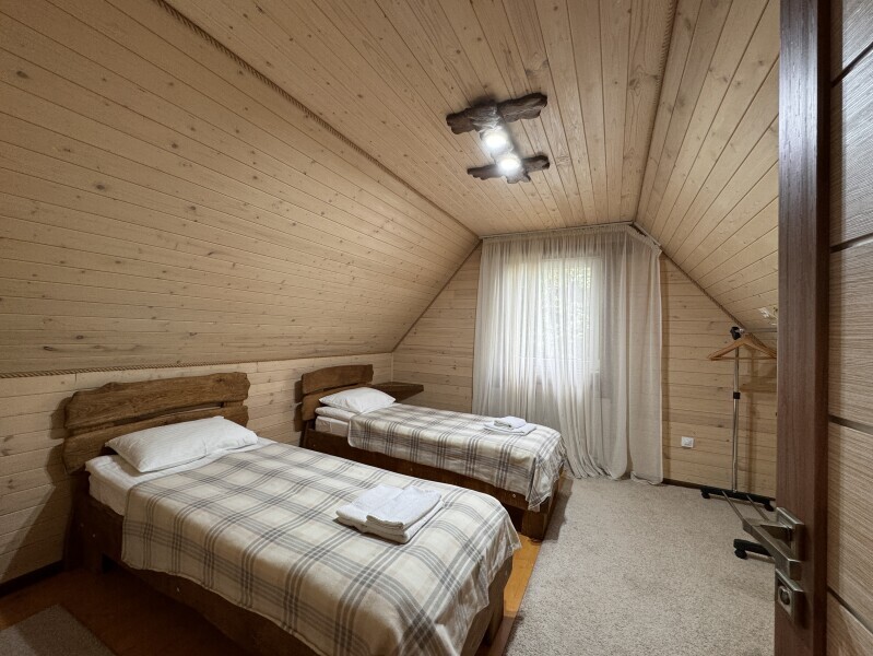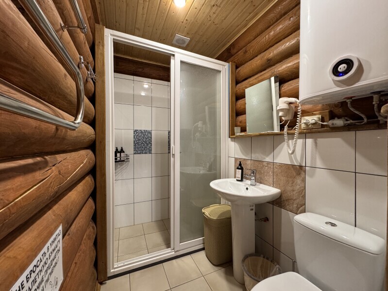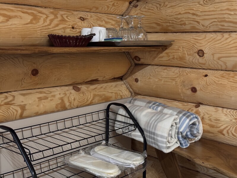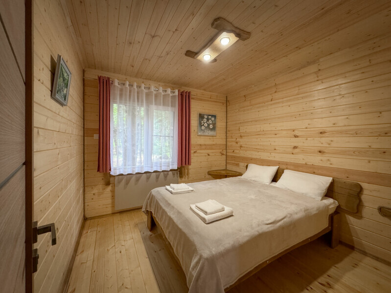 Деревянное шале имеет террасу с мебелью и мангальную зону. Внутри есть всё необходимое: бытовая техника, посуда, удобная мебель, постельное бельё, санузел, душ и полотенца.