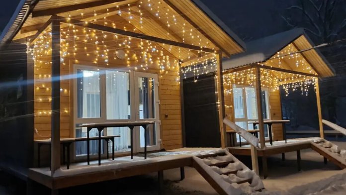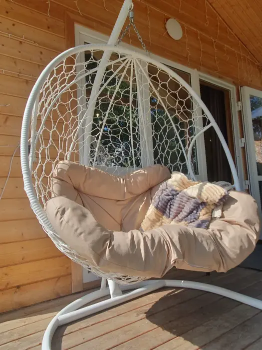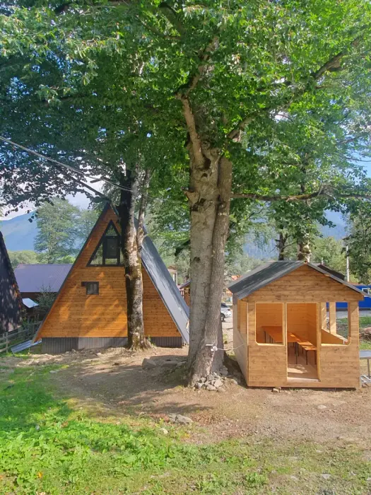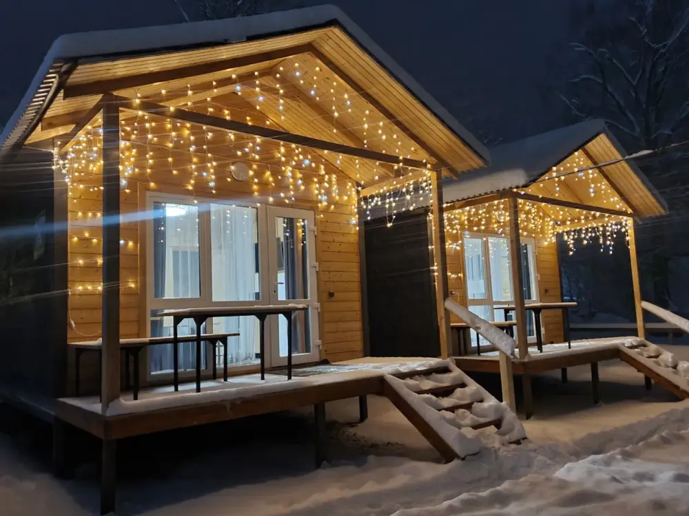 В домиках есть всё необходимое: большая кровать, диван, кухонный гарнитур и бытовая техника (микроволновая печь, мультиварка, чайник), а также посуда, фен, шампунь, полотенце и гель для душа.