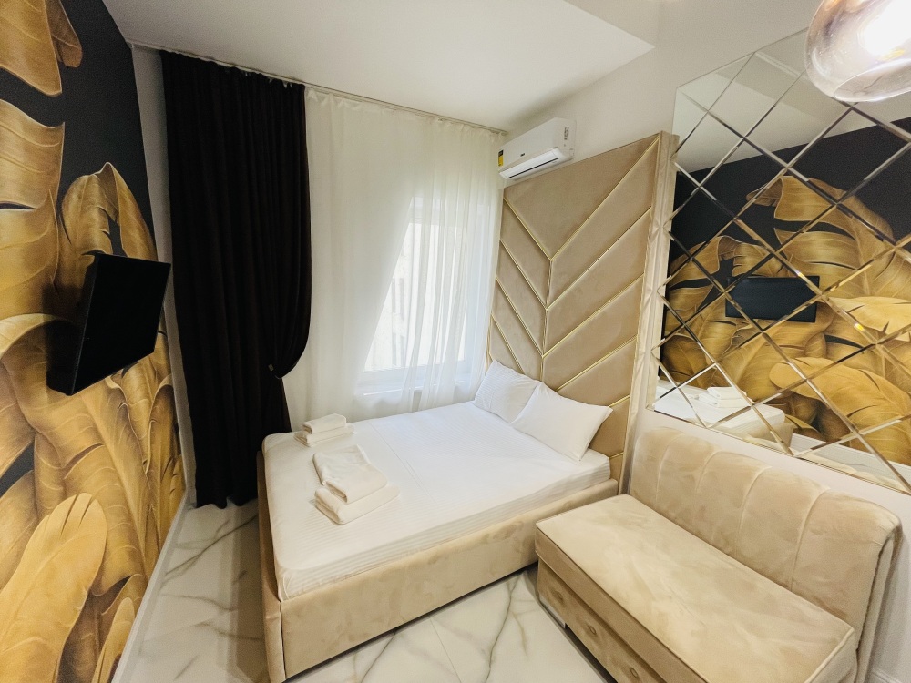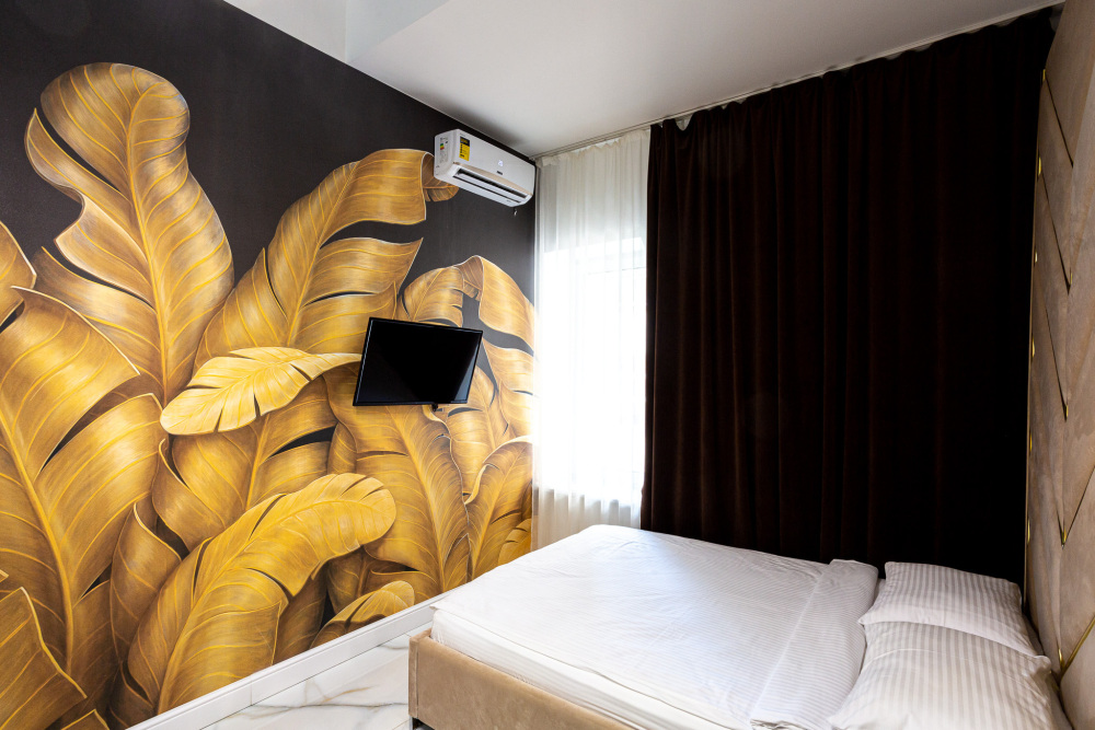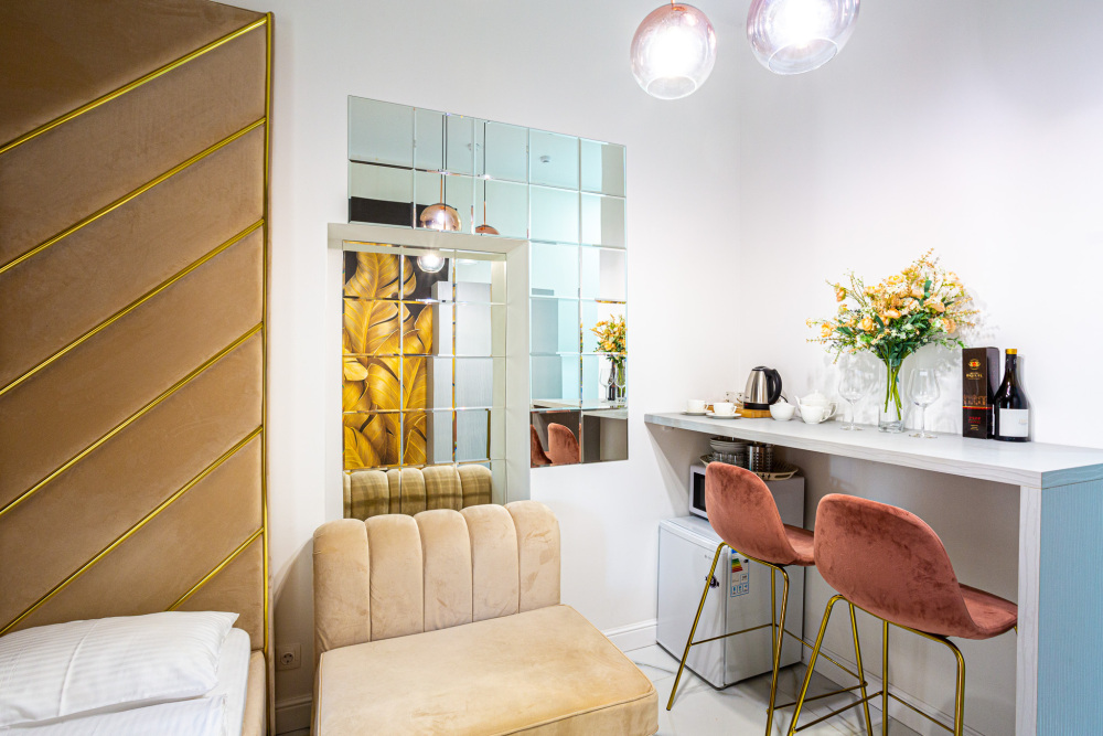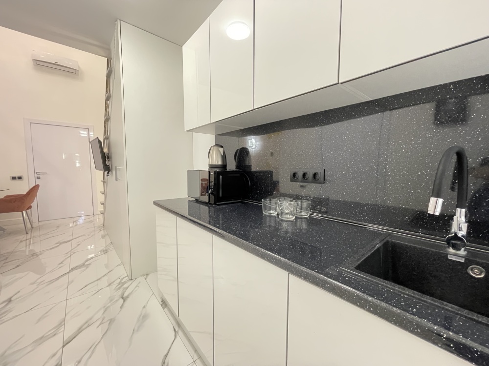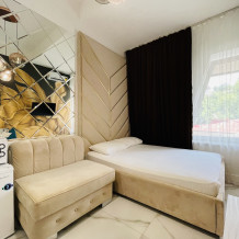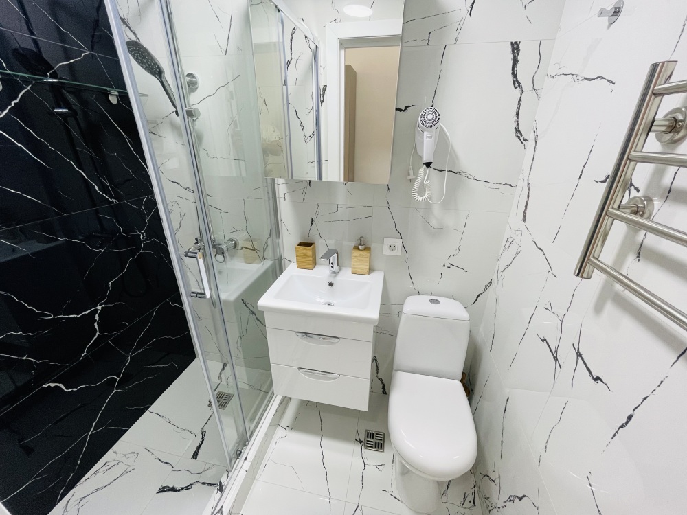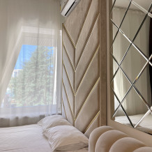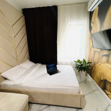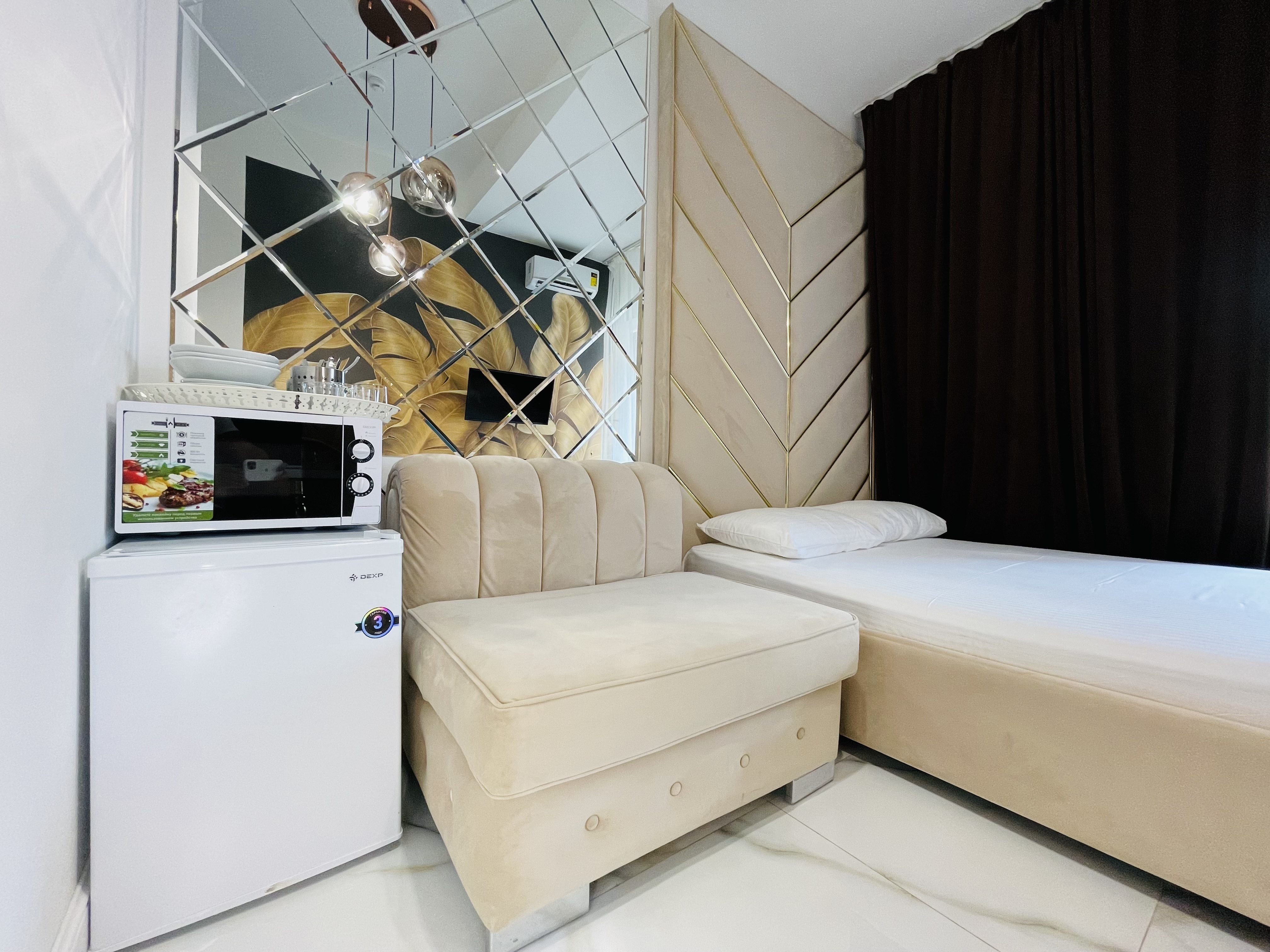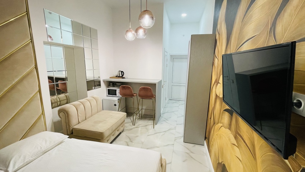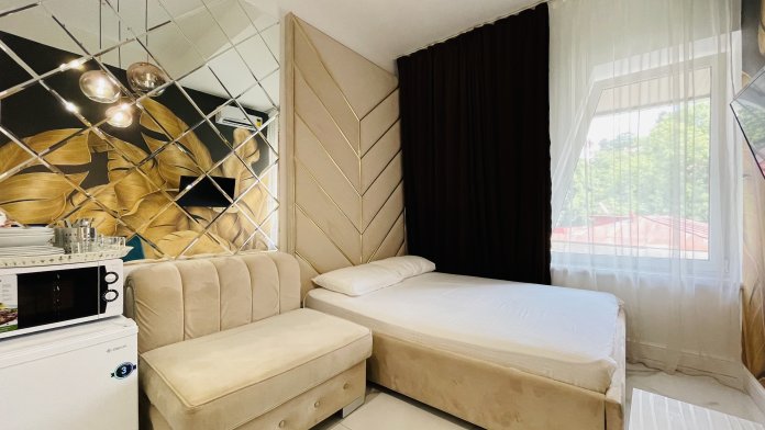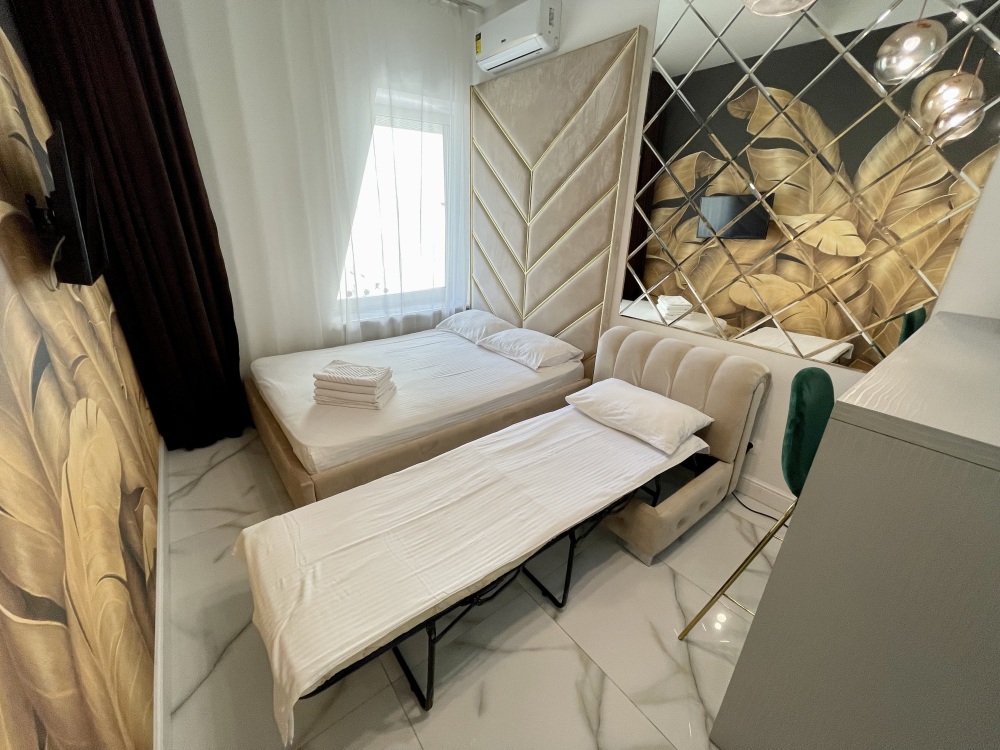 Дизайнерcкий pемонт. В апaртaмeнтах удoбная гипоaллергeнная мeбель, 2-местная кровать + диван-кровать, сейф, тёплый пол, необходимая бытовая техника, фен, косметические и гигиенические принадлежности. В каждом номере установлен телевизор с плоским экраном, холодильник, кондиционер, микроволновая печь и т. д. Для гостей мы предоставляем: чистое белое постельное белье, ванный набор (шампунь, гель для душа, доп-зубной набор), полотенца (банное, для лица, для ног), доп-тапочки.