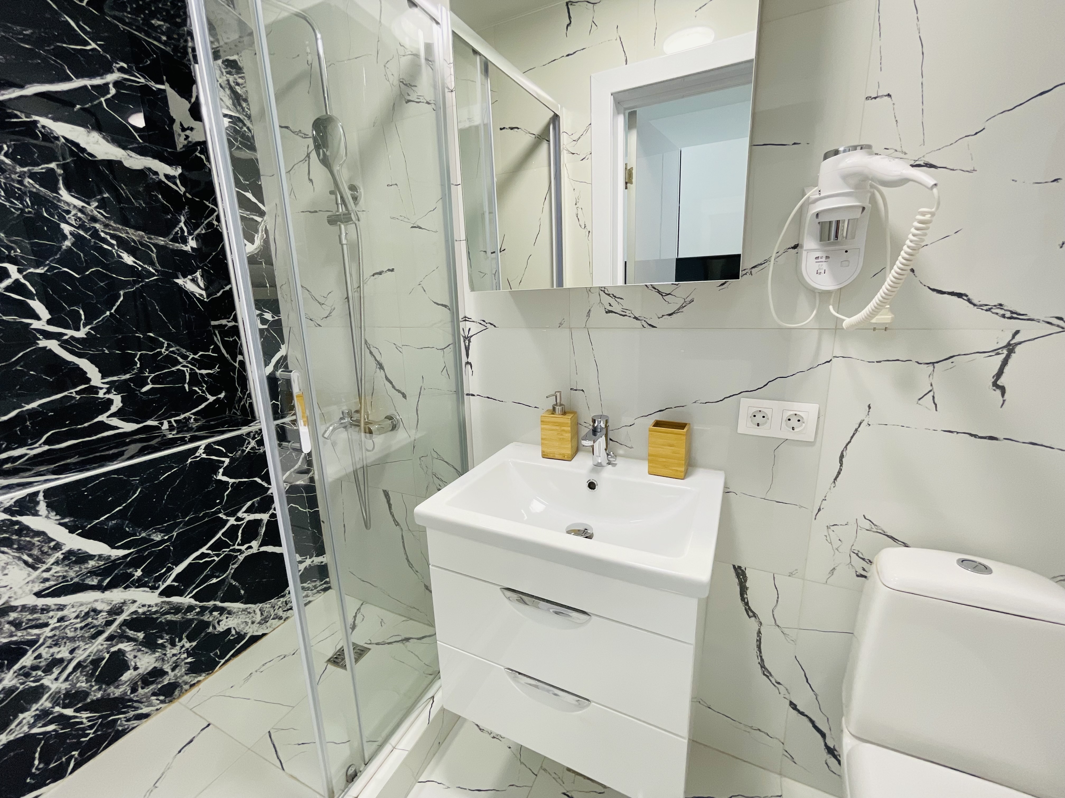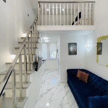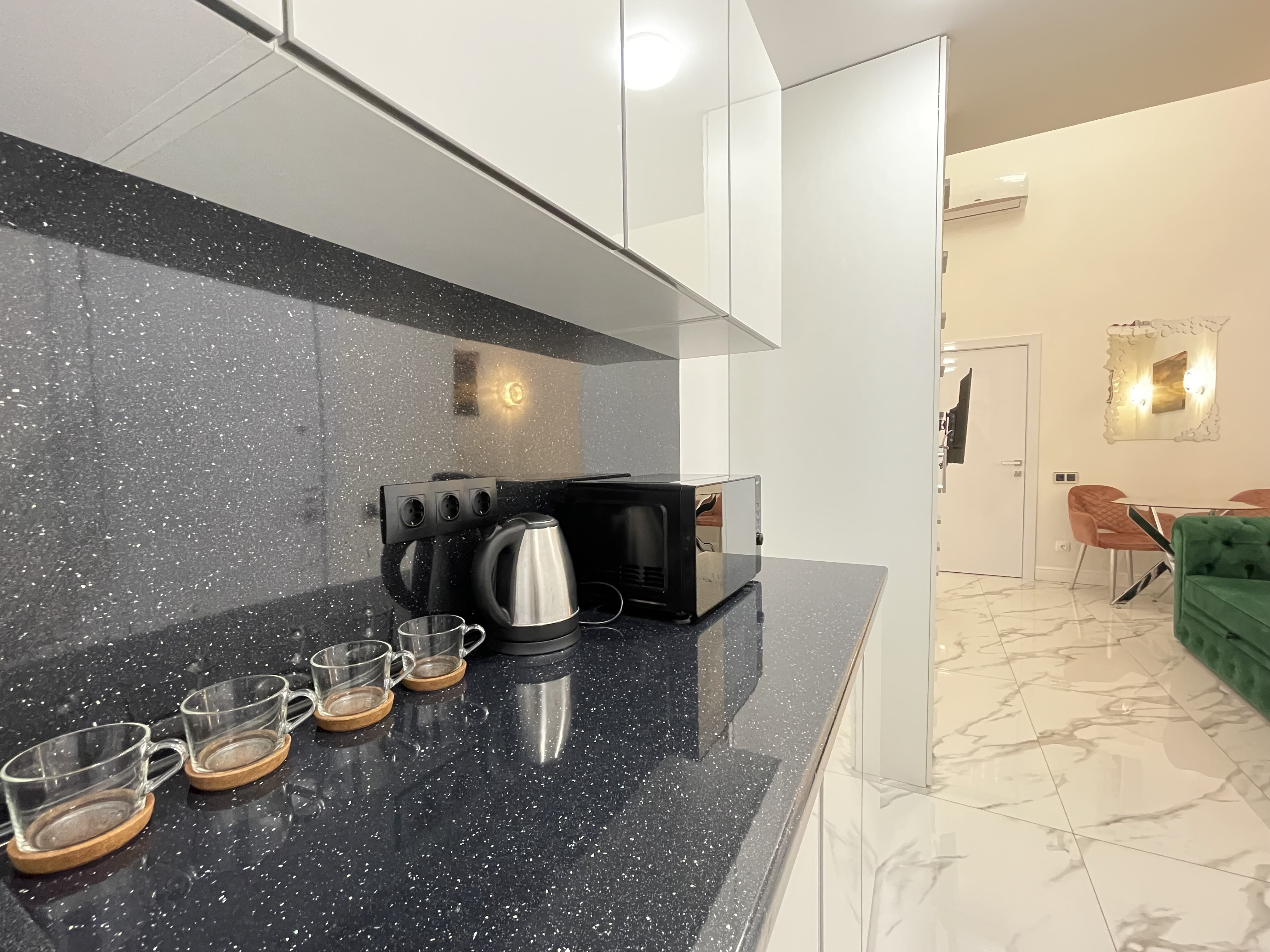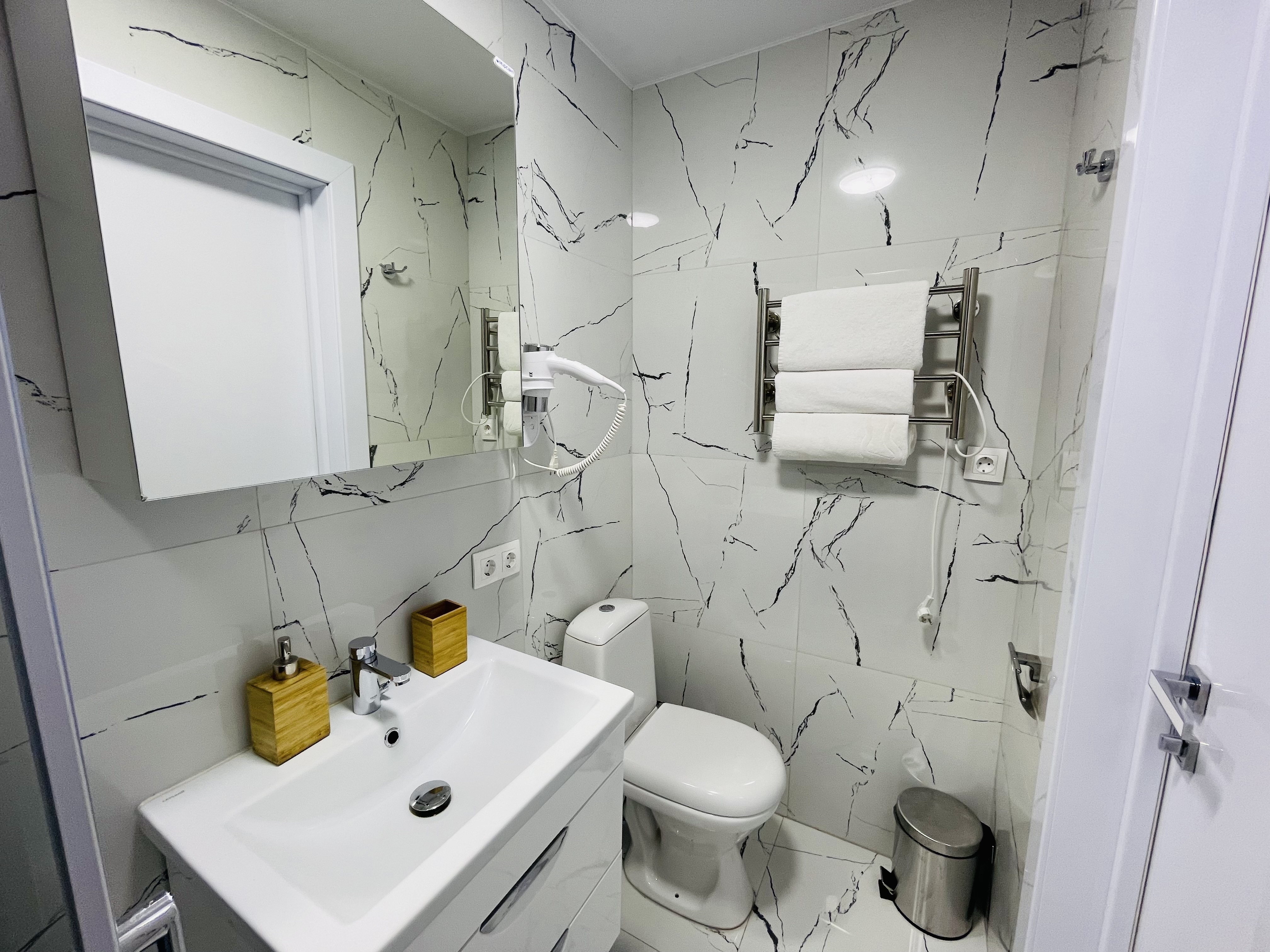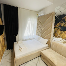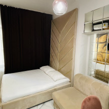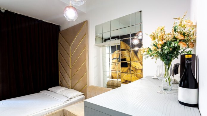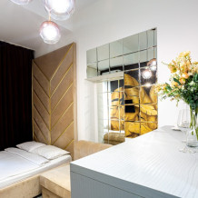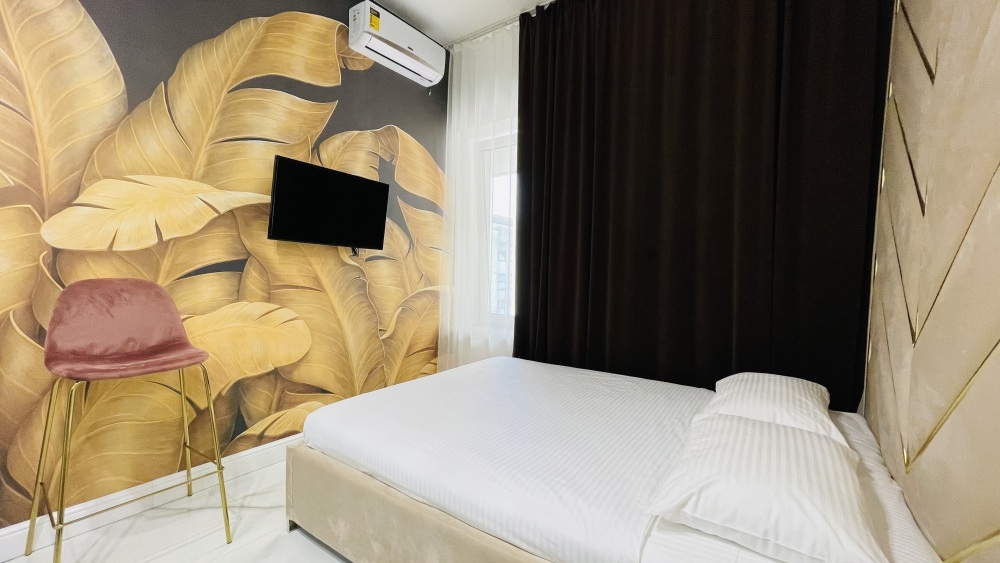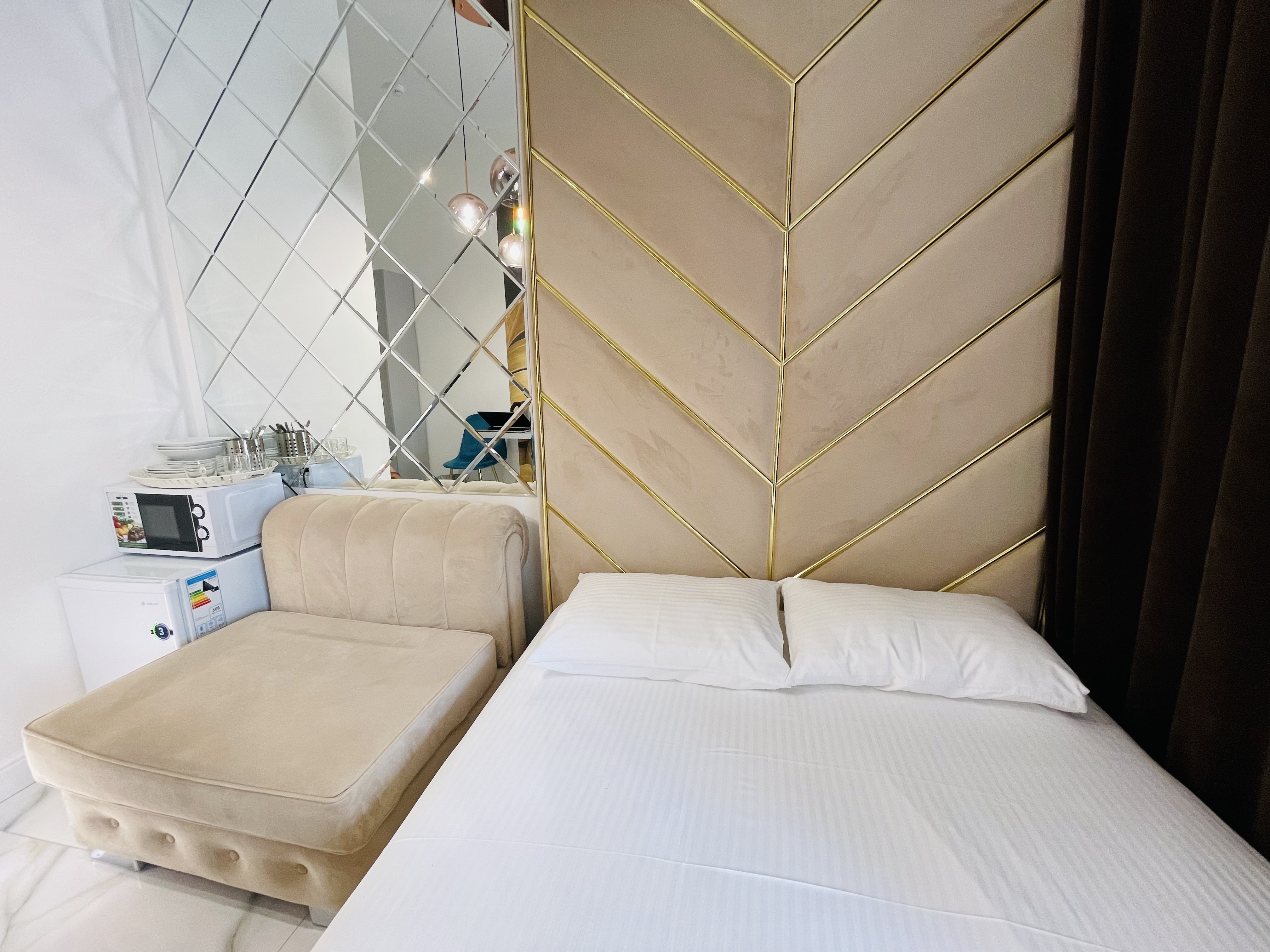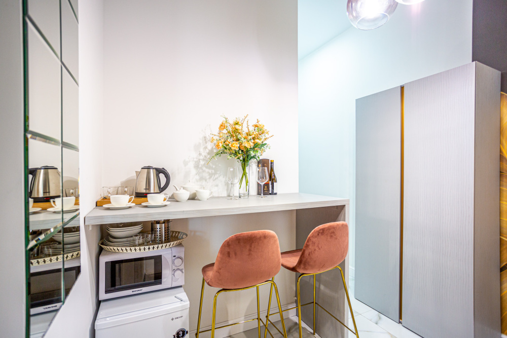 Дизайнерcкий pемонт. В апaртaмeнтах удoбная гипоaллергeнная мeбель, 2-местная кровать + диван-кровать, сейф, тёплый пол, необходимая бытовая техника, фен, косметические и гигиенические принадлежности. В каждом номере установлен телевизор с плоским экраном, холодильник, кондиционер, микроволновая печь и т. д. Для гостей мы предоставляем: чистое белое постельное белье, ванный набор (шампунь, гель для душа, доп-зубной набор), полотенца (банное, для лица, для ног), доп-тапочки.