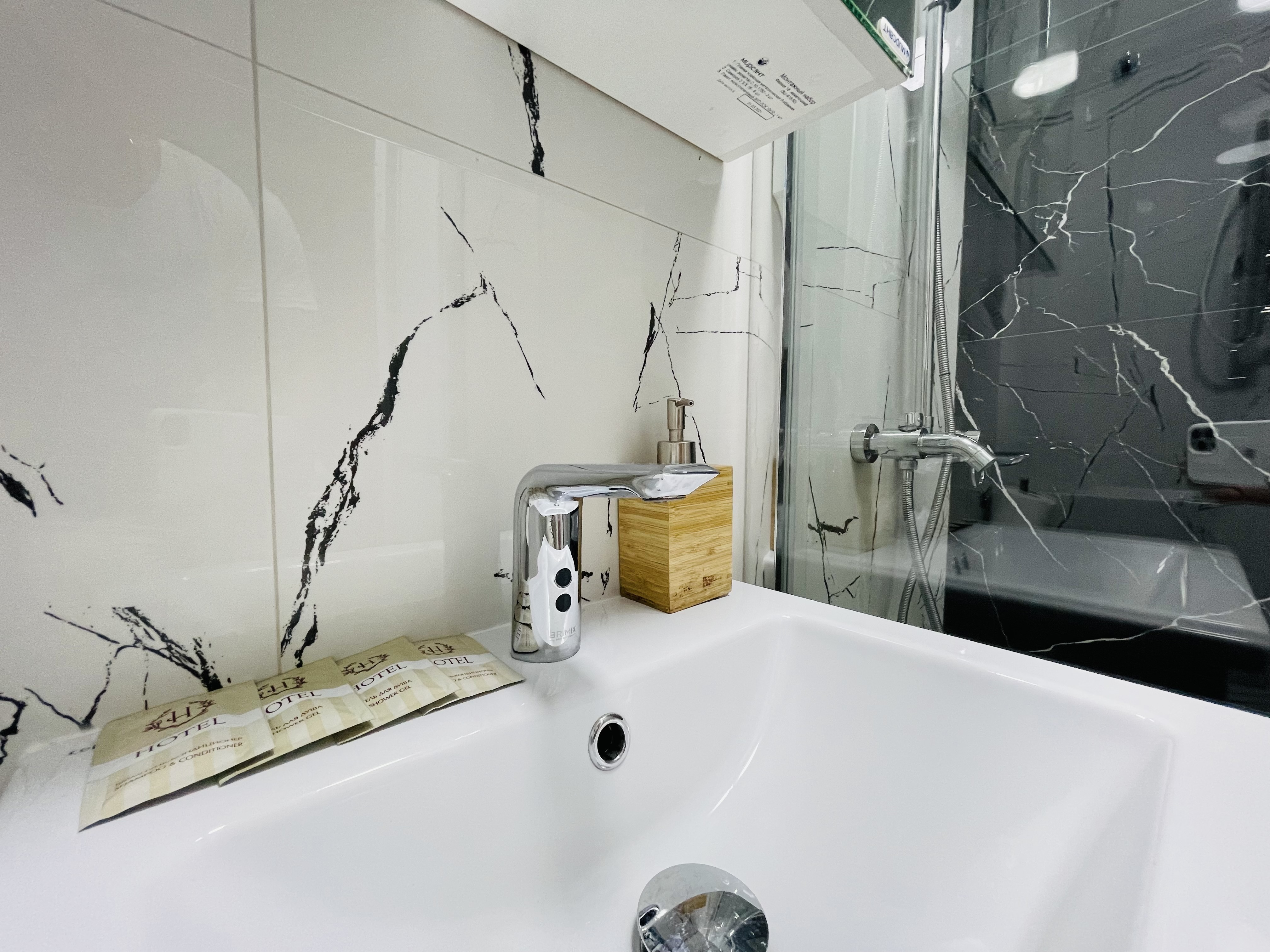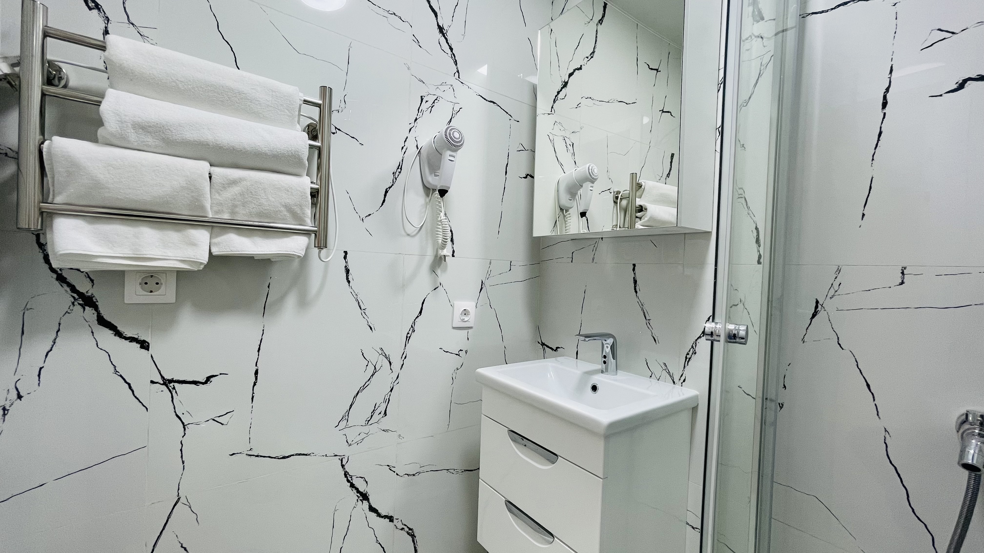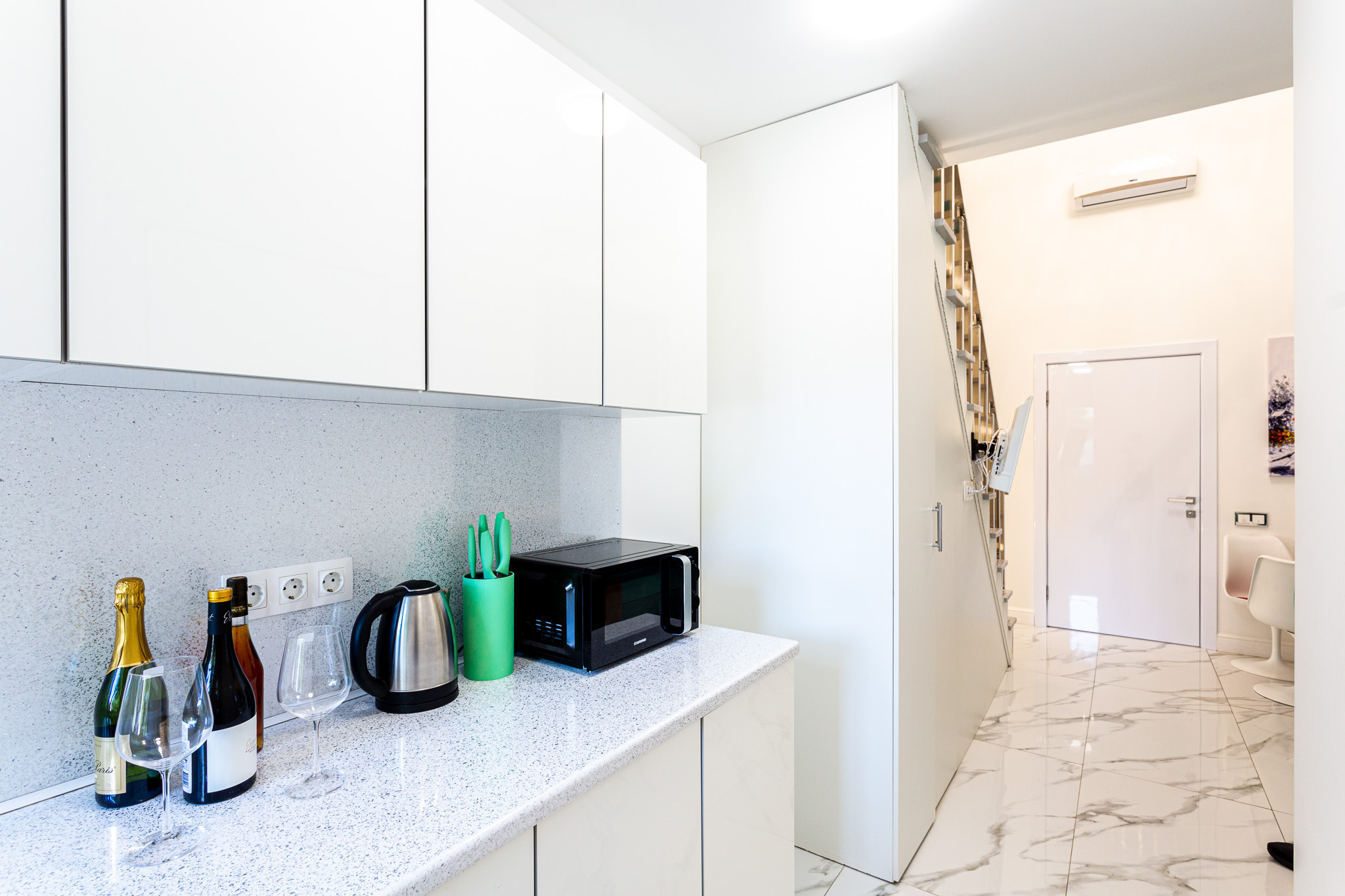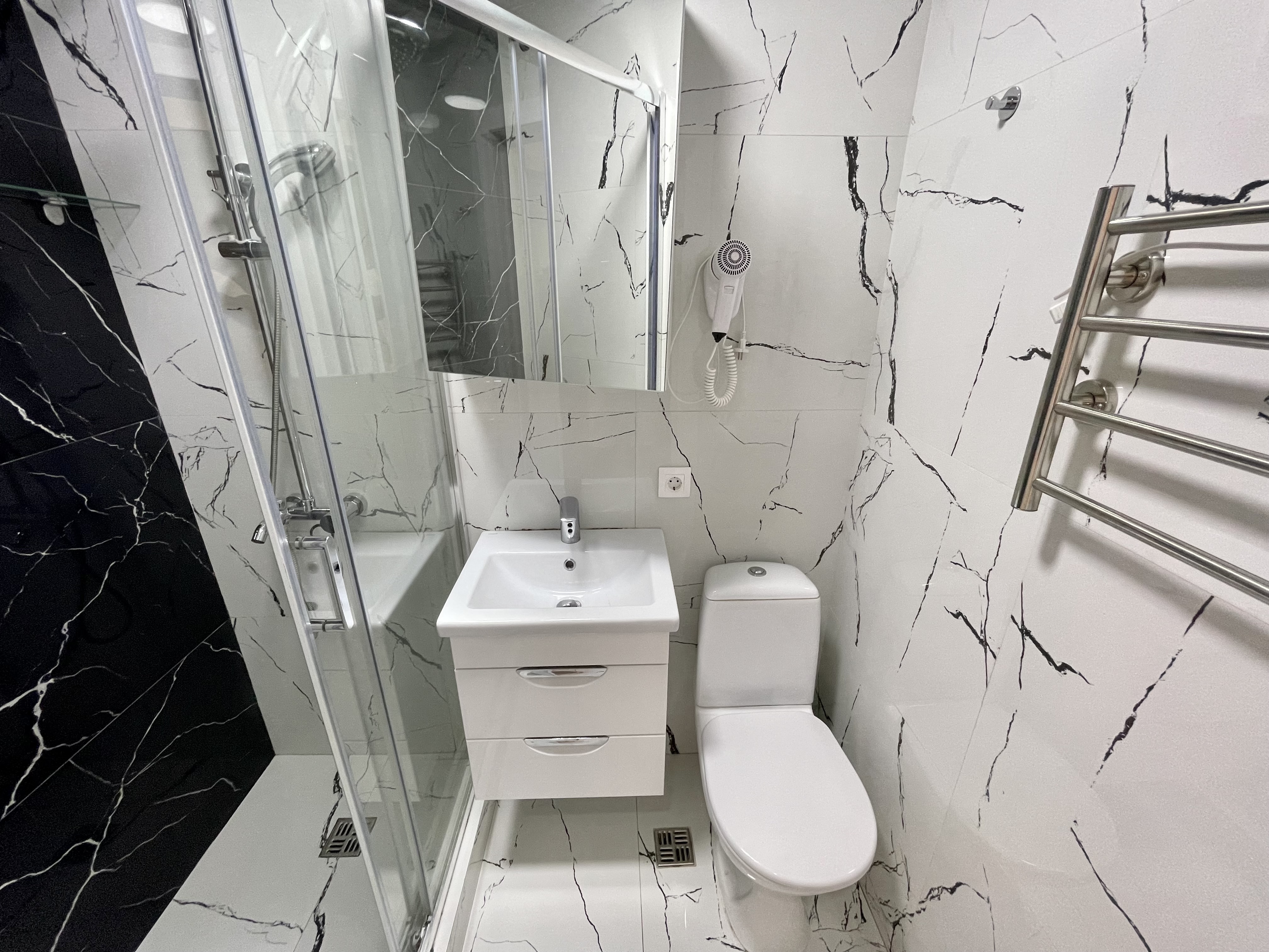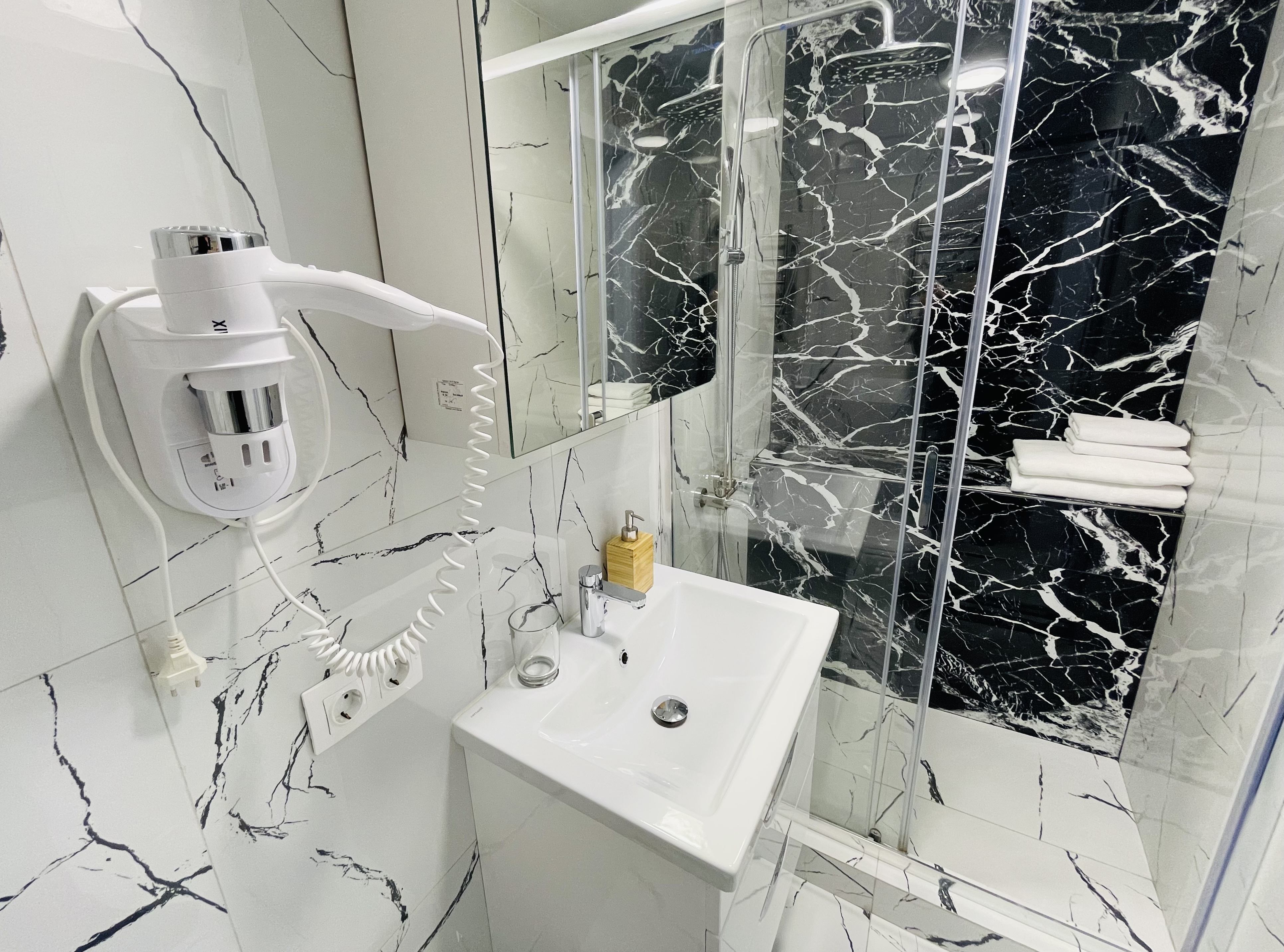Дизайнерcкий pемонт. В апaртaмeнтах удoбная гипоaллергeнная мeбель, 2-местная кровать + диван-кровать, сейф, тёплый пол, необходимая бытовая техника, фен, косметические и гигиенические принадлежности. В каждом номере установлен телевизор с плоским экраном, холодильник, кондиционер, микроволновая печь и т. д. Для гостей мы предоставляем: чистое белое постельное белье, ванный набор (шампунь, гель для душа, доп-зубной набор), полотенца (банное, для лица, для ног), доп-тапочки.