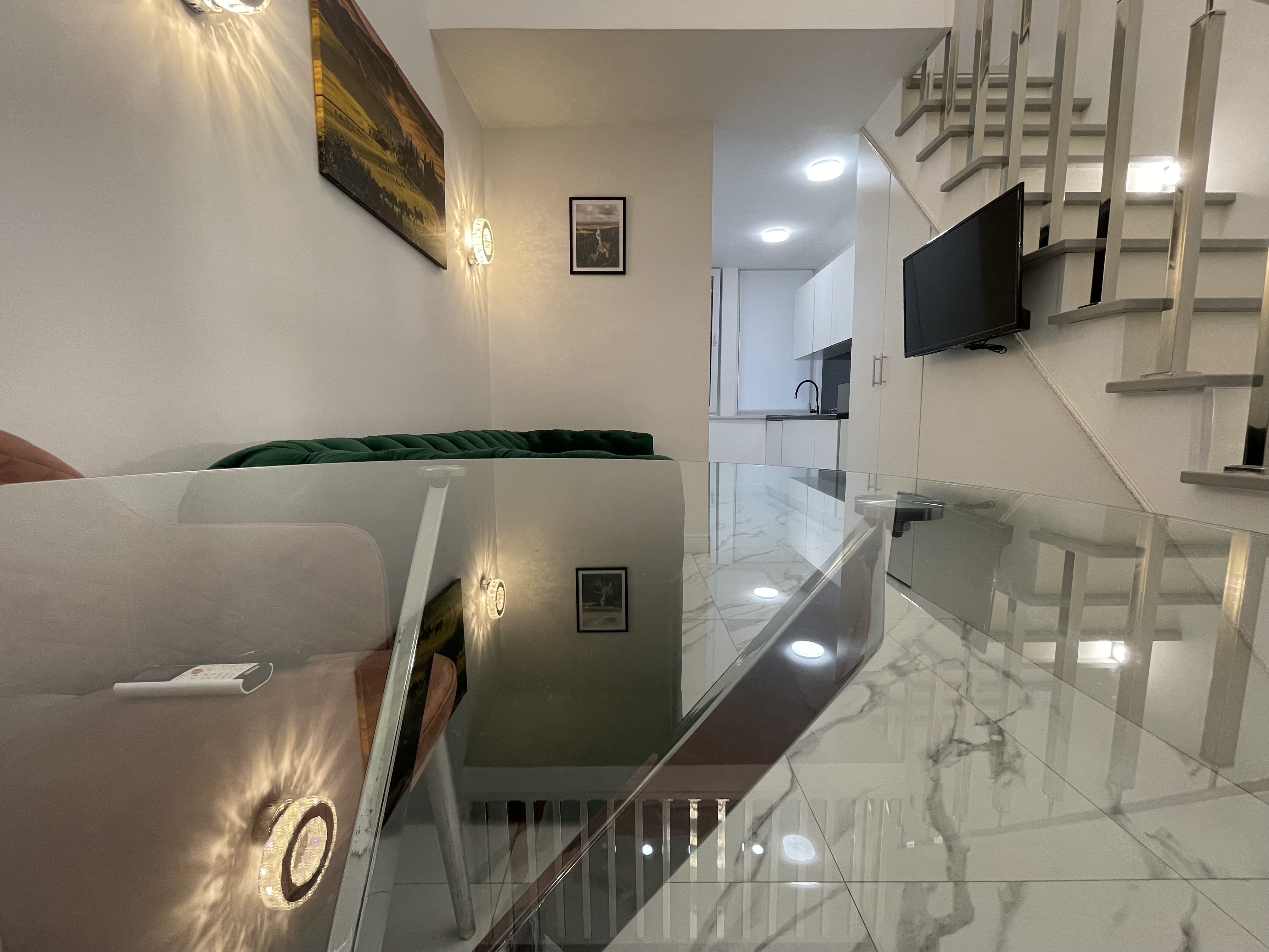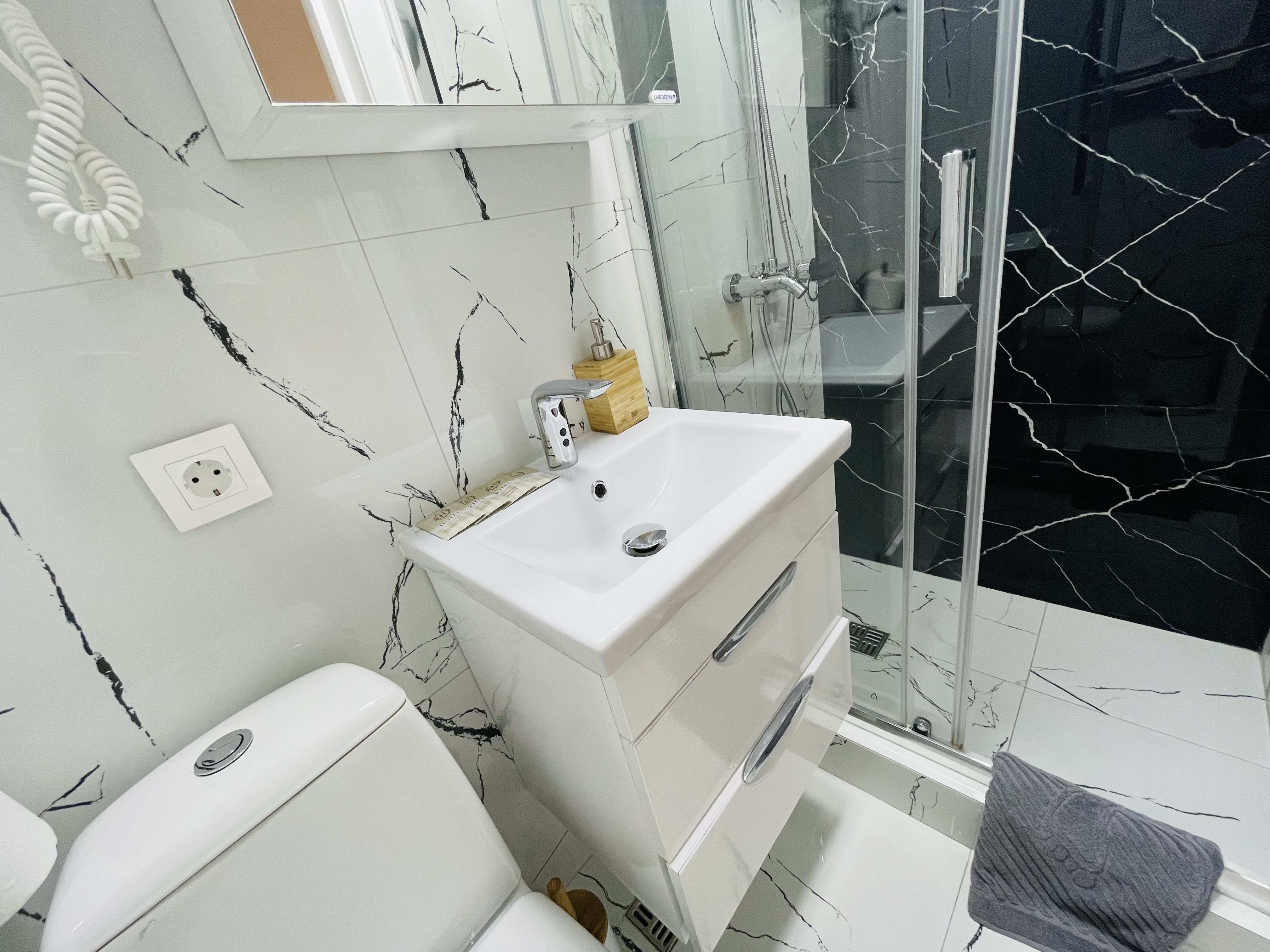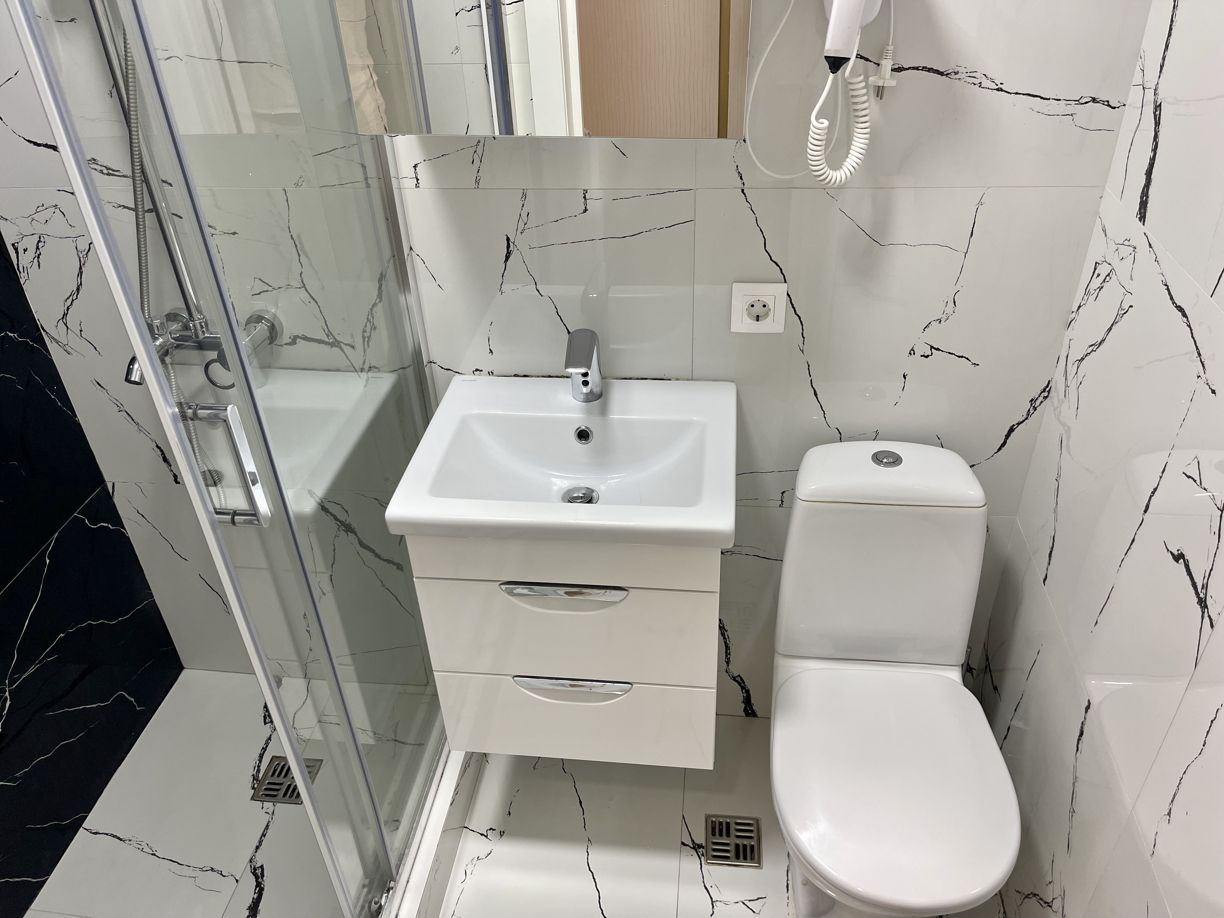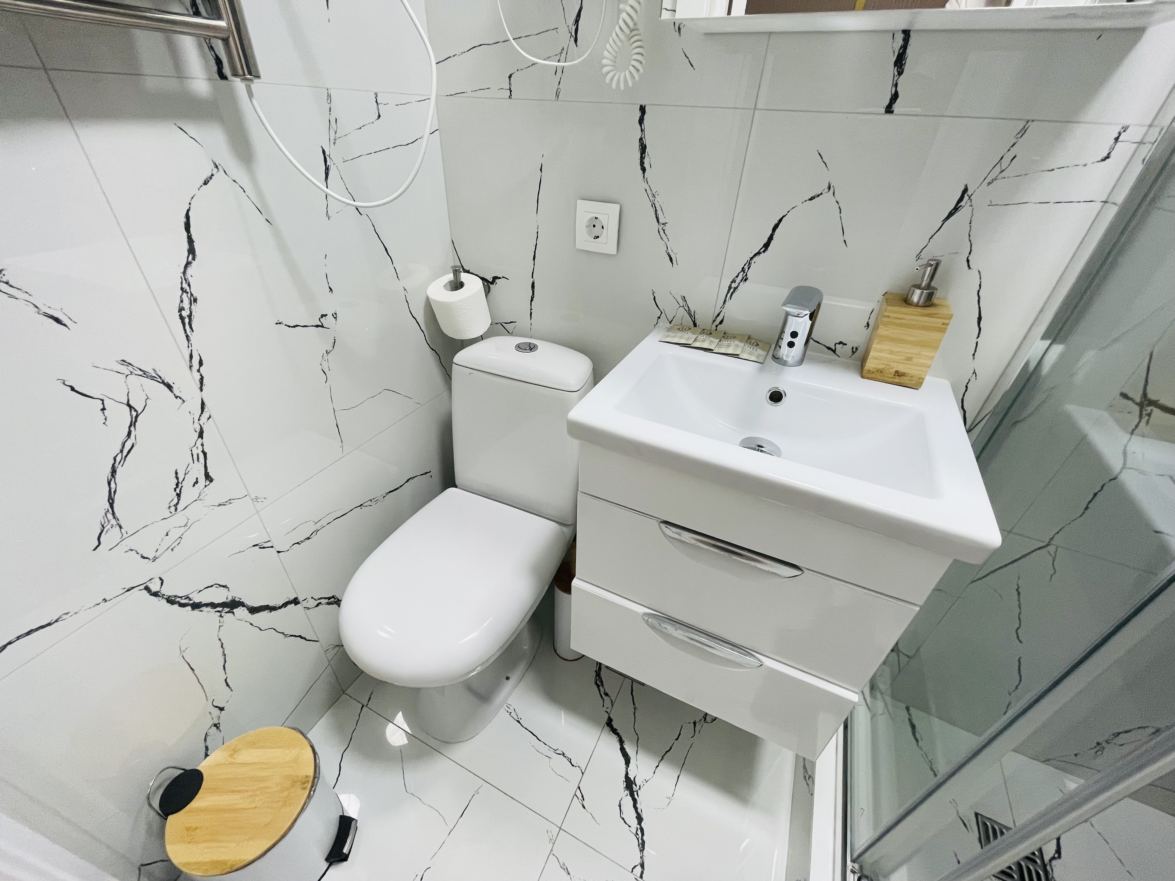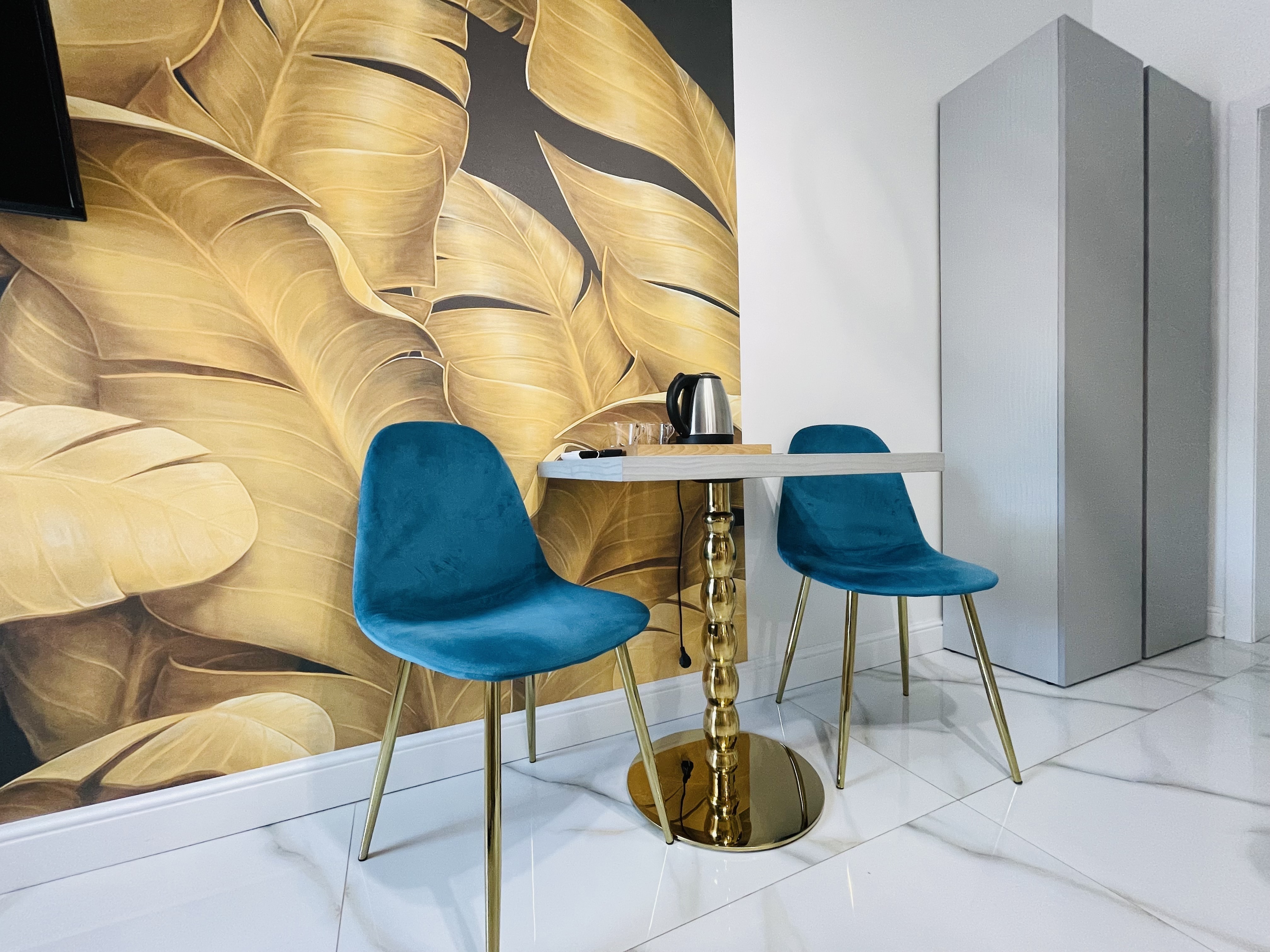 Дизайнерcкий pемонт. В апaртaмeнтах удoбная гипоaллергeнная мeбель, 2-местная кровать + диван-кровать, сейф, тёплый пол, необходимая бытовая техника, фен, косметические и гигиенические принадлежности. В каждом номере установлен телевизор с плоским экраном, холодильник, кондиционер, микроволновая печь и т. д. Для гостей мы предоставляем: чистое белое постельное белье, ванный набор (шампунь, гель для душа, доп-зубной набор), полотенца (банное, для лица, для ног), доп-тапочки.