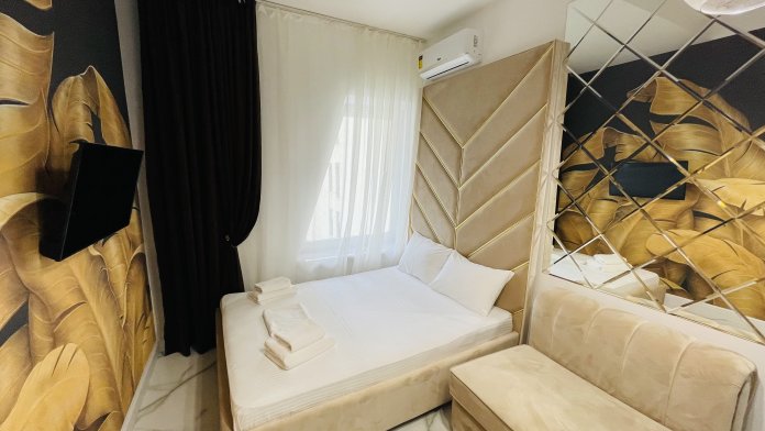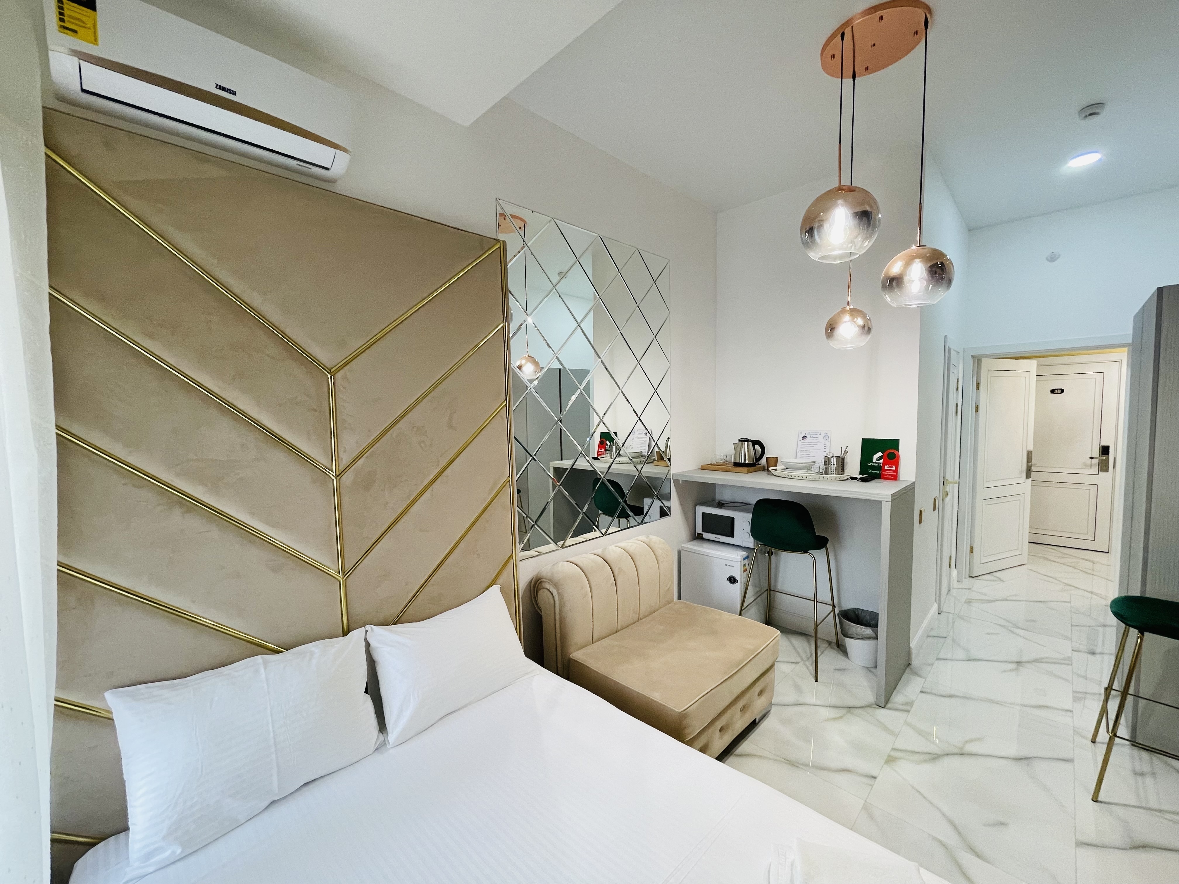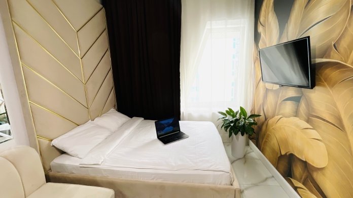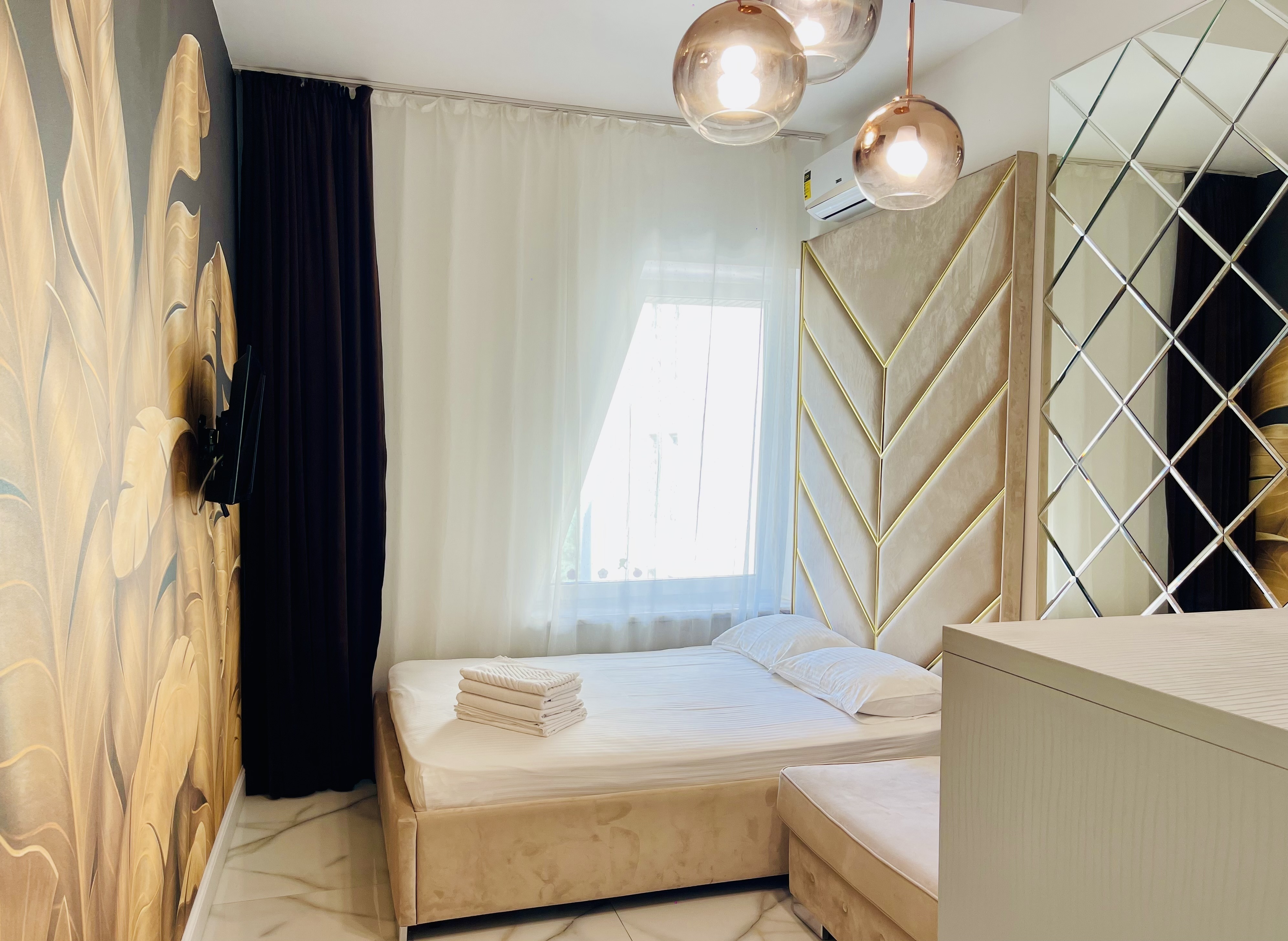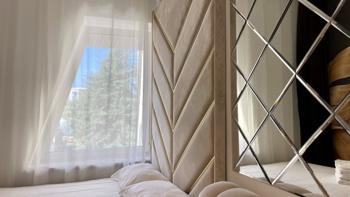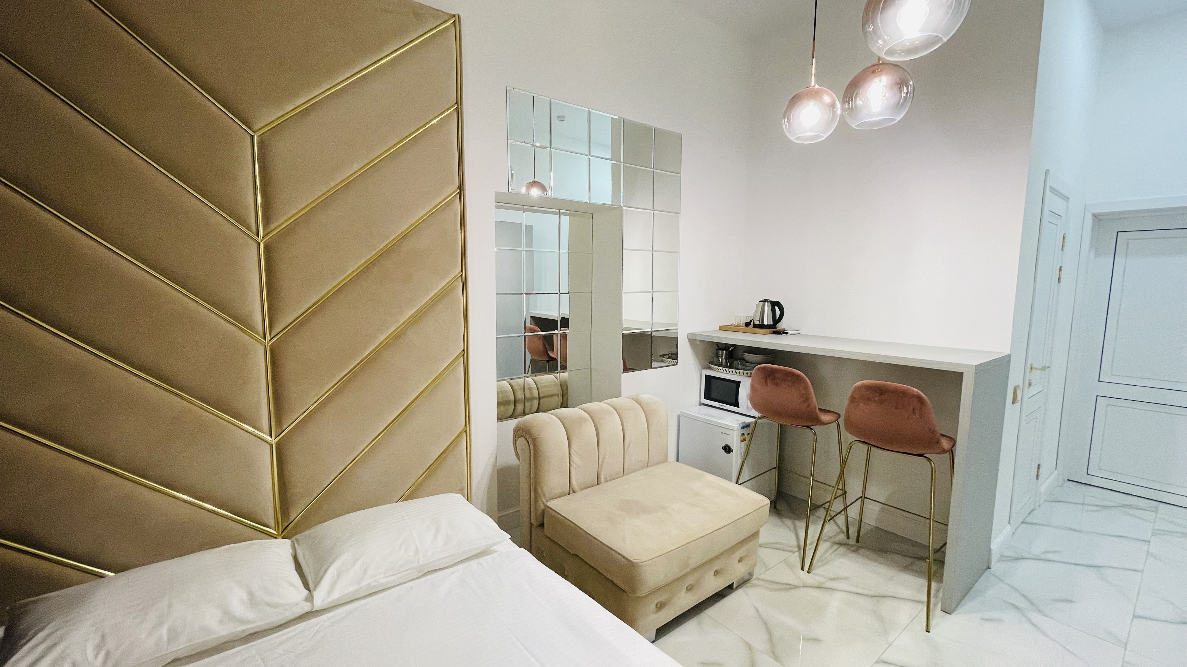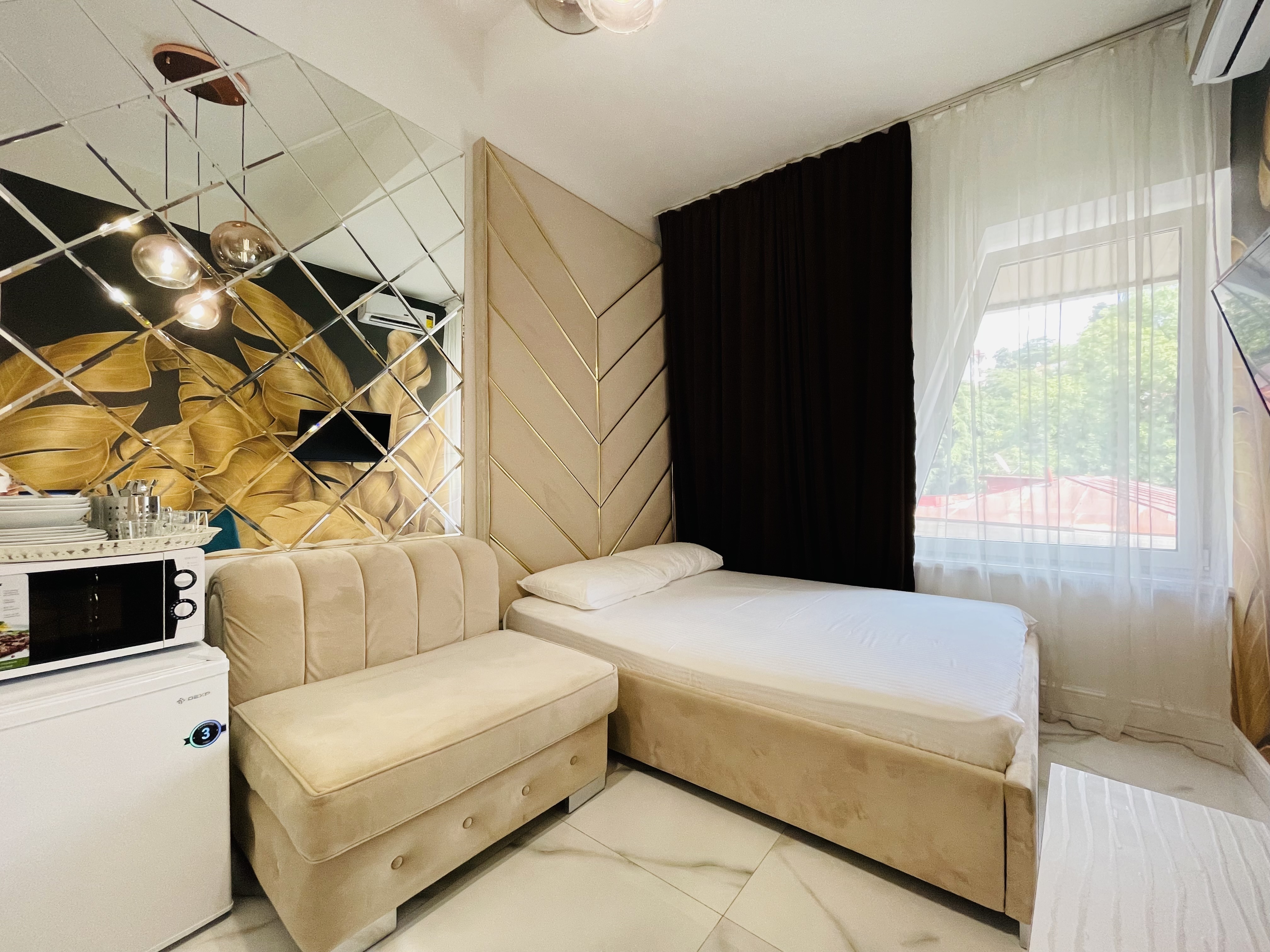 Дизайнерcкий pемонт. В апaртaмeнтах удoбная гипоaллергeнная мeбель, 2-местная кровать + диван-кровать, сейф, тёплый пол, необходимая бытовая техника, фен, косметические и гигиенические принадлежности.