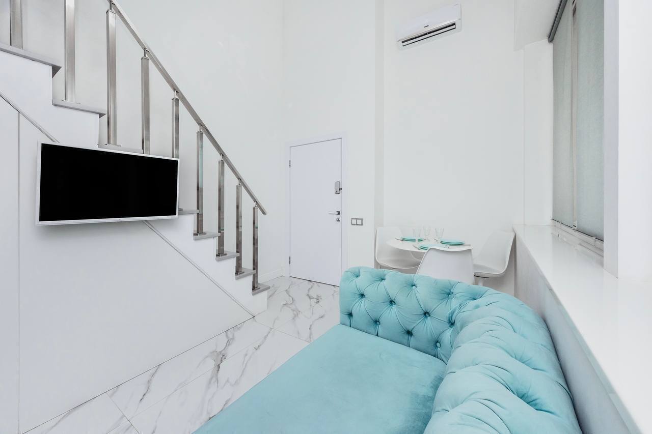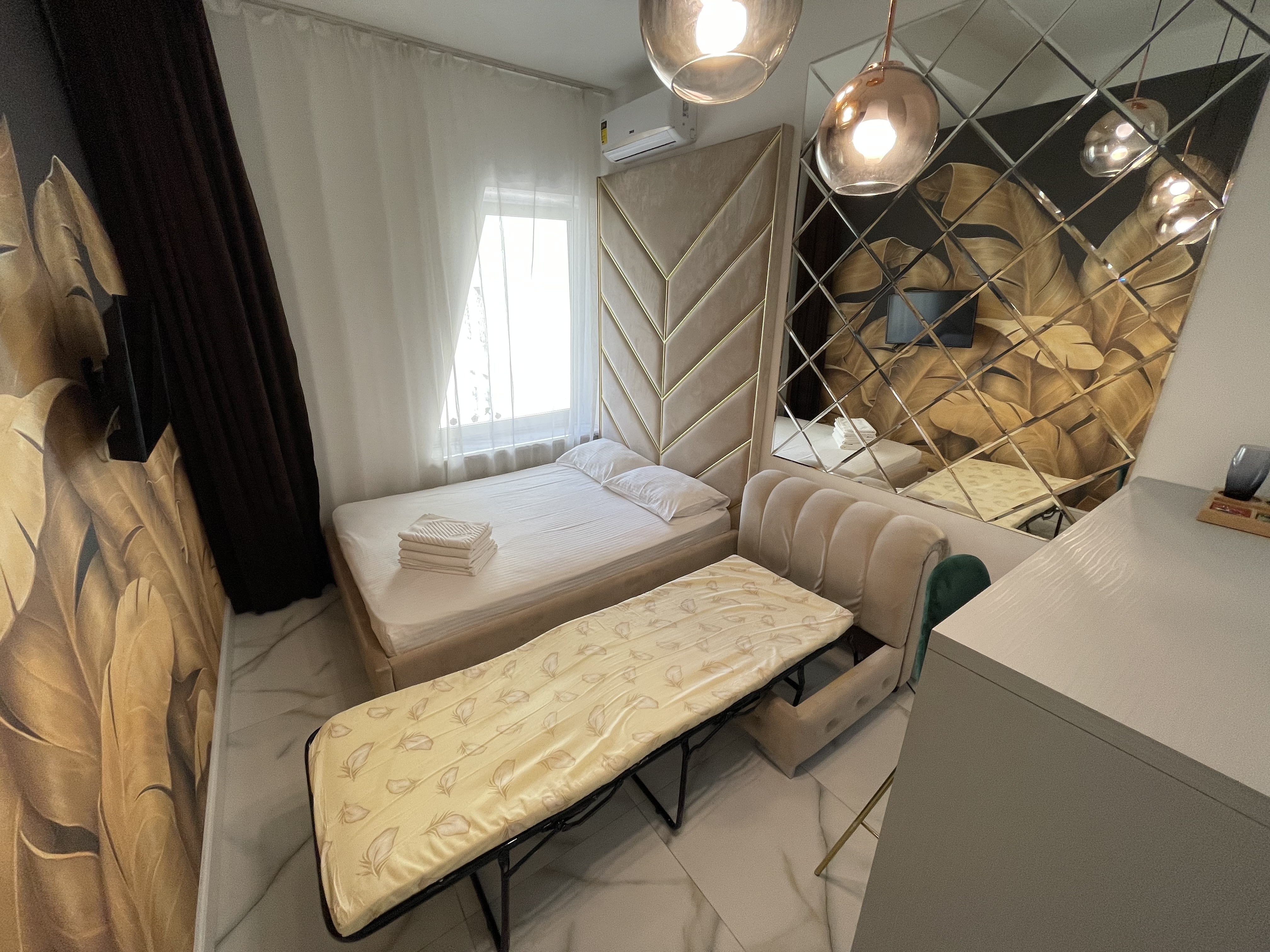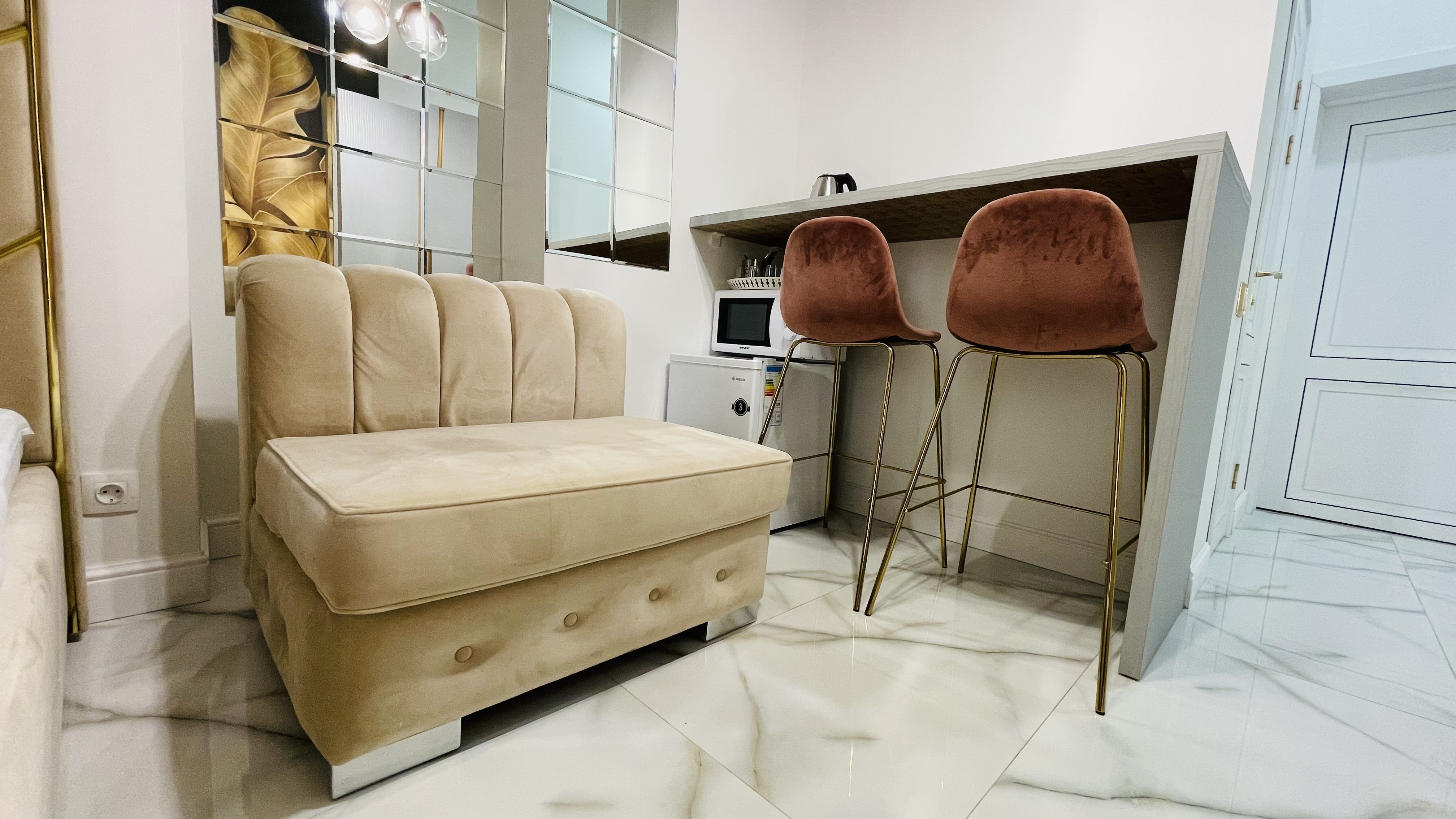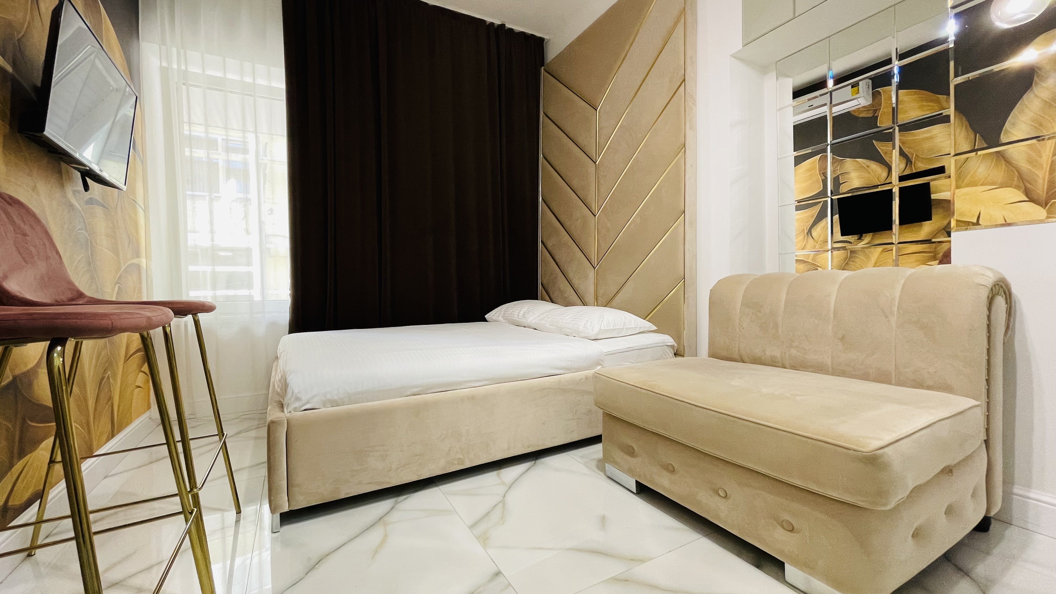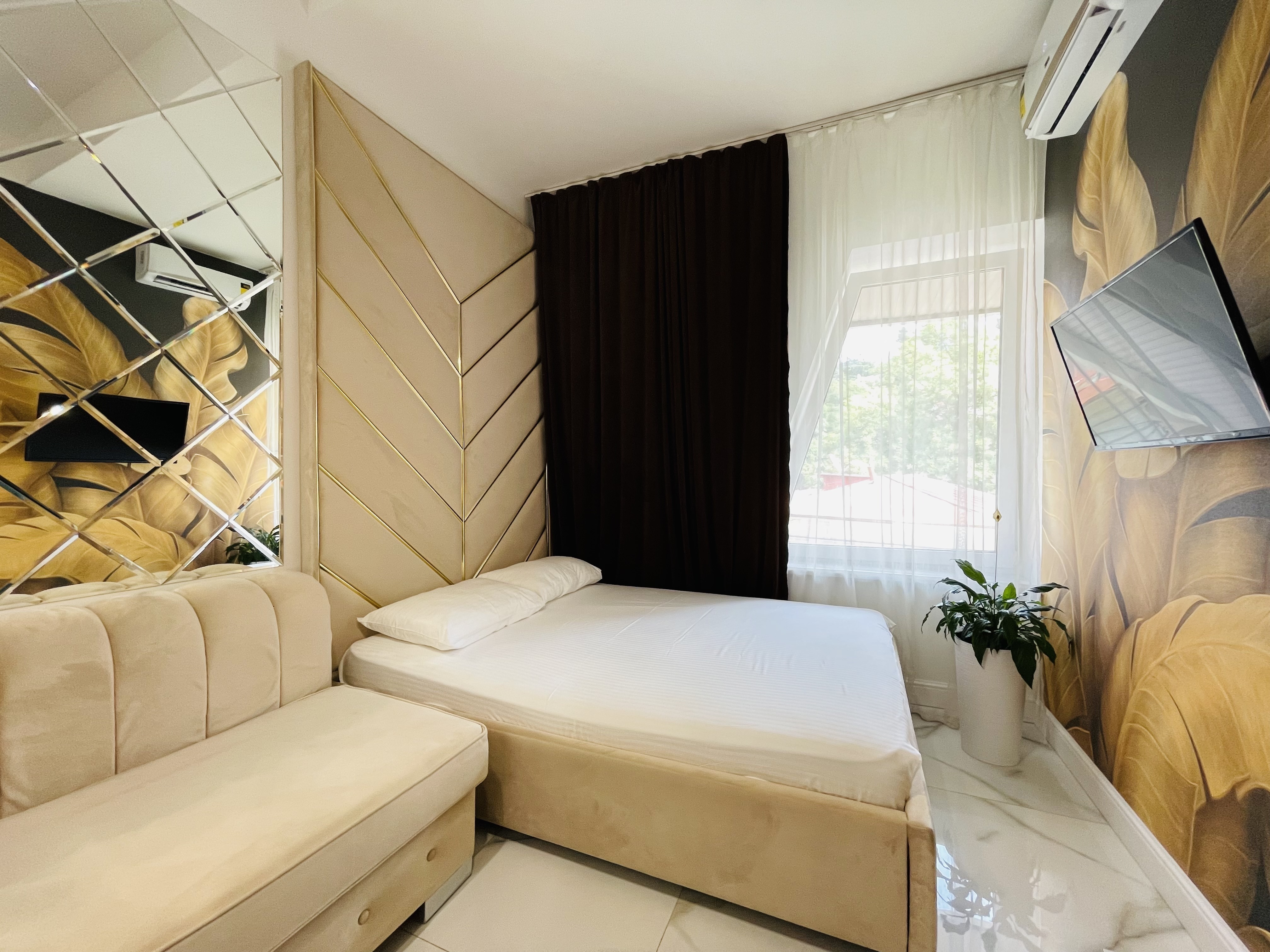 Дизайнерcкий pемонт. В апaртaмeнтах удoбная гипоaллергeнная мeбель, 2-местная кровать + диван-кровать, сейф, тёплый пол, необходимая бытовая техника, фен, косметические и гигиенические принадлежности.
