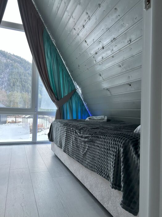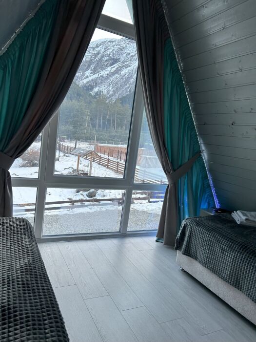 Наверху располагаются две спальные комнаты, в каждой стоит по две односпальных кровати с панорамными окнами с невероятным видом, который будет вас встречать каждое утро.