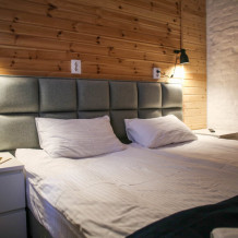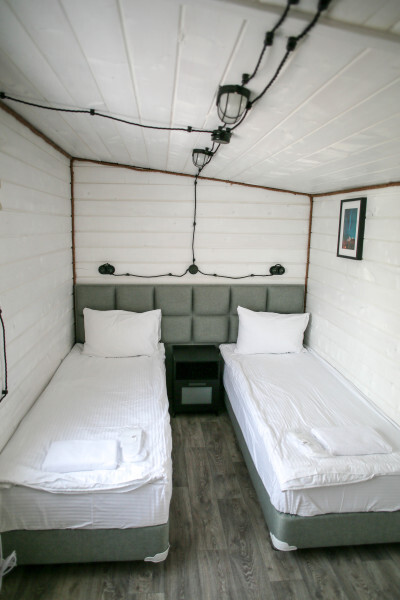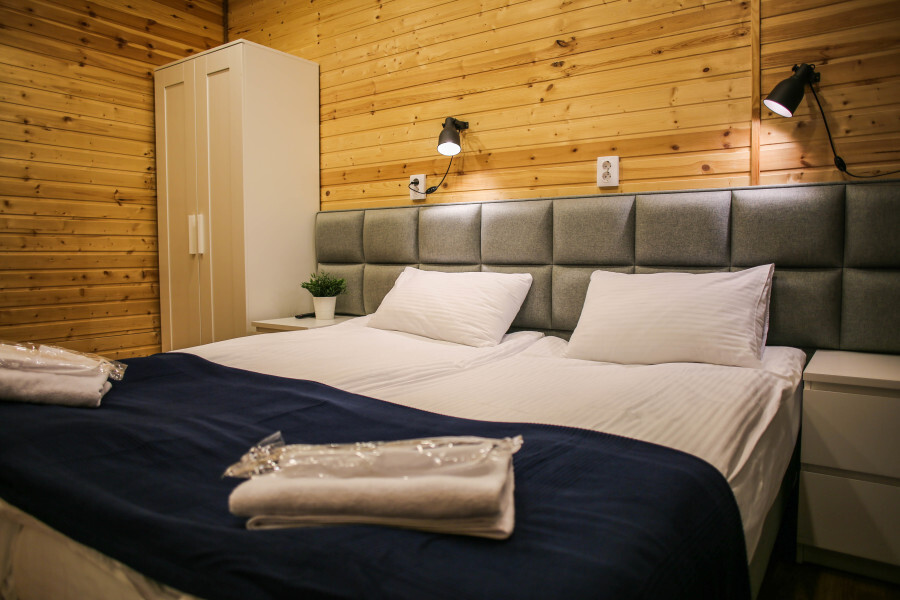 Отдельные небольшие домики с 2-мя односпальными кроватями (возможно объединение в одну кровать king size, но без топпера), а также собственным сан. узлом. Кухня общего пользования находится в основном здании. Wi-fi нет. Проживание с животными запрещено.