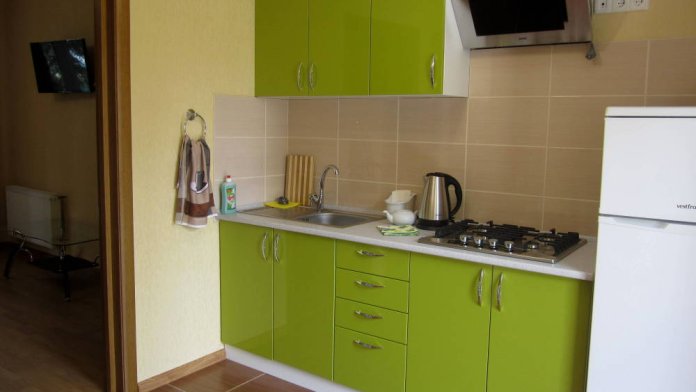 Оборудована кухня для приготовления еды (набор посуды, чайник, холодильник, микроволновка).