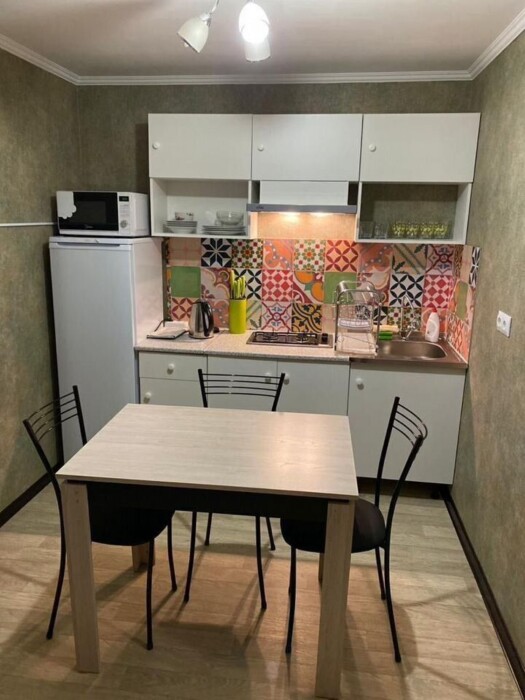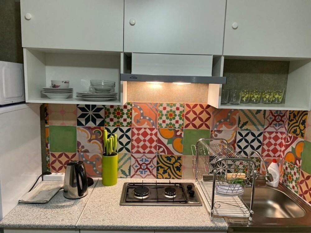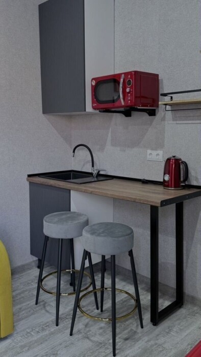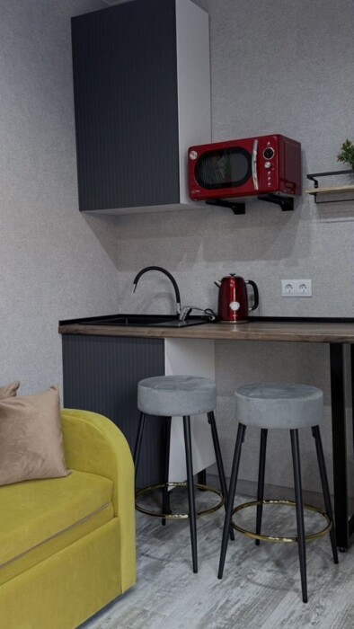 Мини-кухня, оборудована всем необходимым: микроволновая печь, чайник, холодильник.