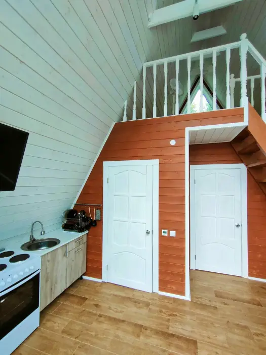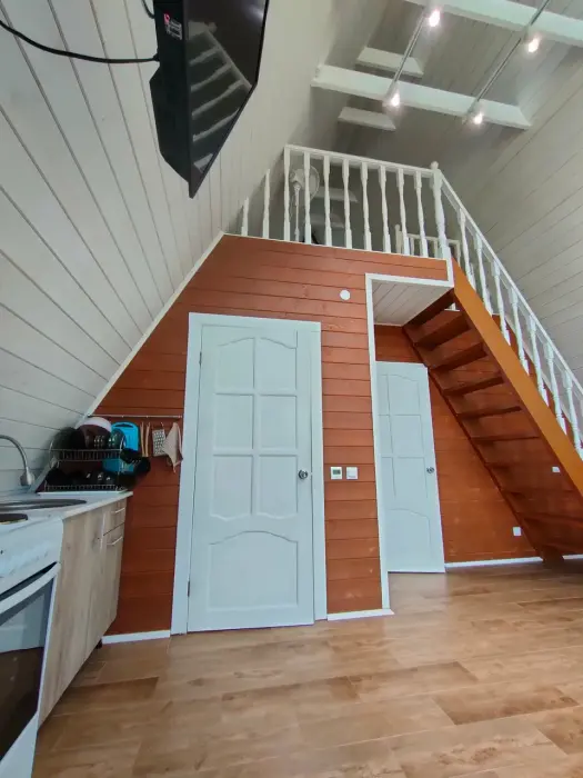 В лофте (второй этаж) двуспальная кровать. Электротитан на 100л. Своя скважина на воду глубиной 75 м со станцией умягчения и очистки, воду можно пить из под крана.