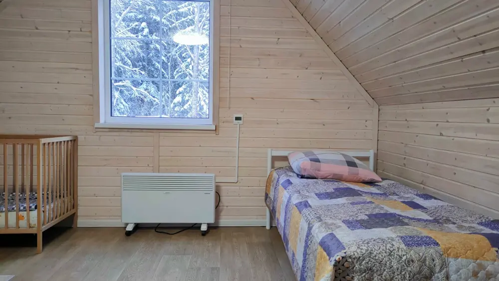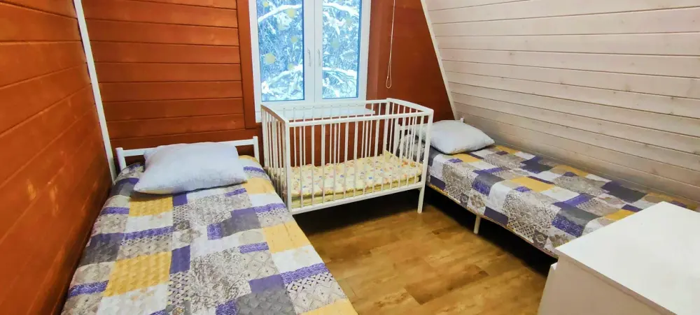 На втором этаже расположена спальня, две односпальные и одна двуспальная кровати, детская кроватка.