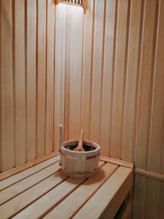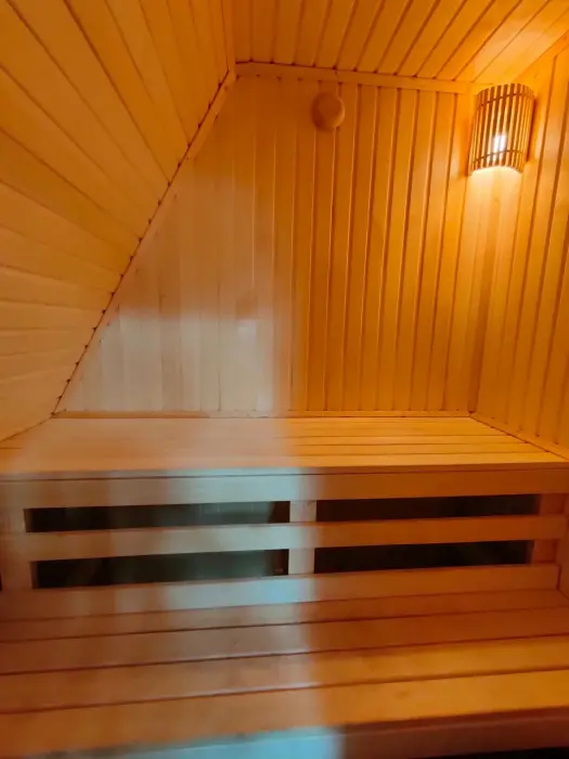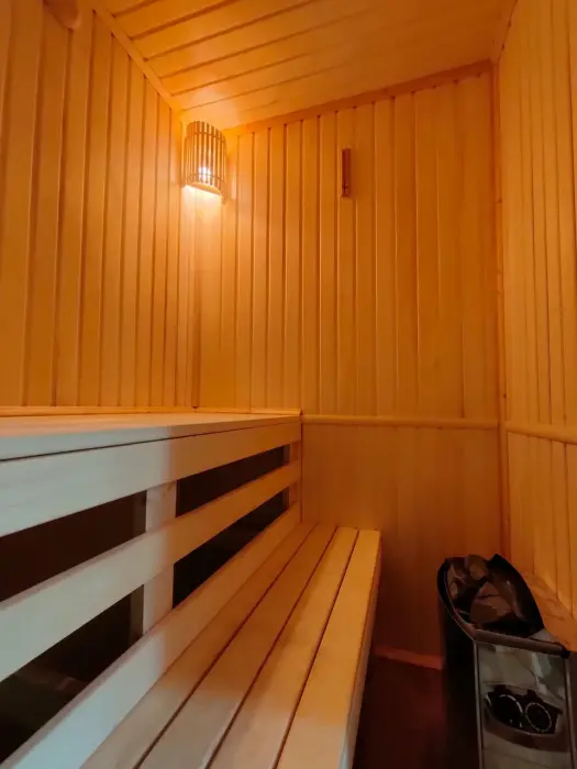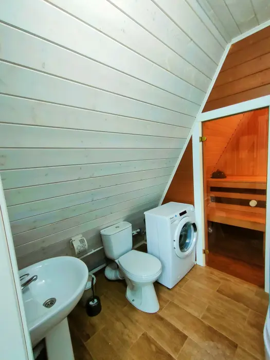 За счёт большего размера на первом этаже вместилась финская сауна и отдельная спальная комната.