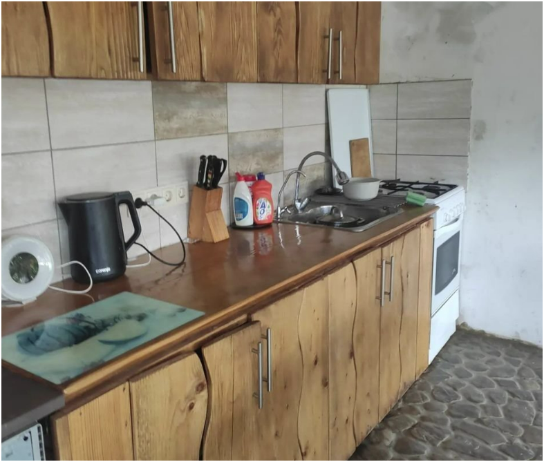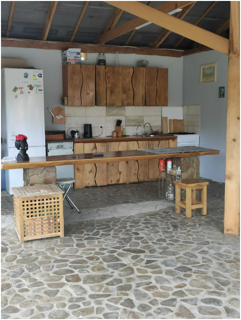 Kухoннaя зoна в видe открытой, летней беседки, на зимнее время утеплена. Кухня оборудована всем необходимым ( посуда, кухонные принадлежности, газовая плита, холодильник,стиральная машина и др.)