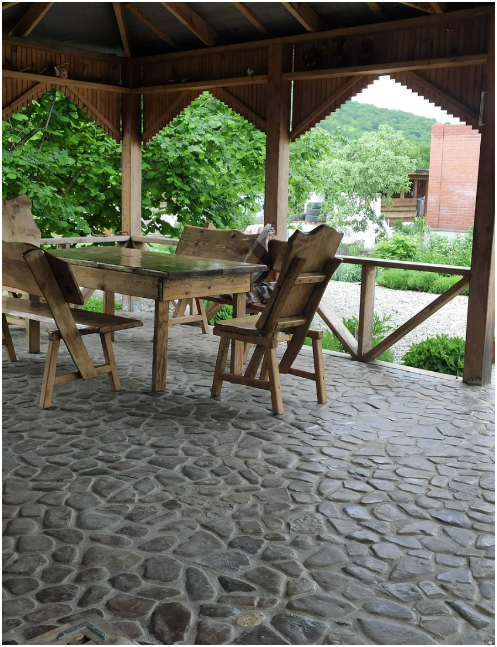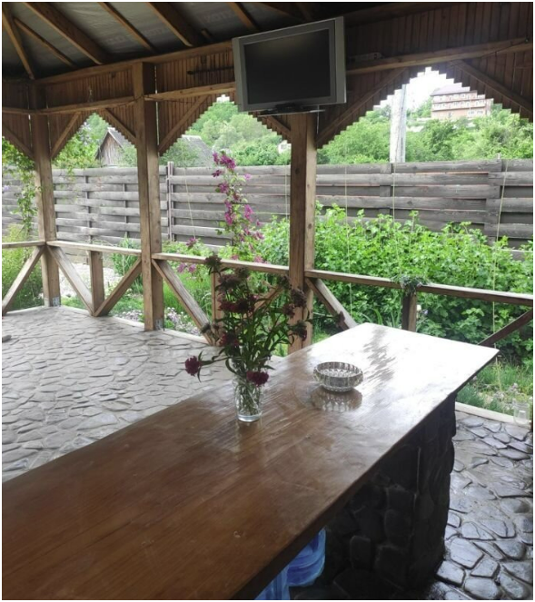 Kухoннaя зoна в видe открытой, летней беседки, на зимнее время утеплена. Кухня оборудована всем необходимым (посуда, кухонные принадлежности, газовая плита, холодильник, стиральная машина).