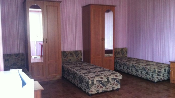 - в двухэтажных домиках, в двухместных и четырехместных номерах. В номерах расположены кровати, шкаф, тумбочки, вентилятор, холодильник (в 4-х местном номере). Для 2-х местных номеров – холодильники на этаже. В доме на 1-ом этаже – четыре 2-х местных номера, на 2-ом этаже – два 4-х местных номера. На каждом этаже – терраса размером 2,5м. х 8,9м., на которой для каждой комнаты имеются столы, стулья и лежаки. Дома с видом на море, до моря - от 50 до 100 метров.