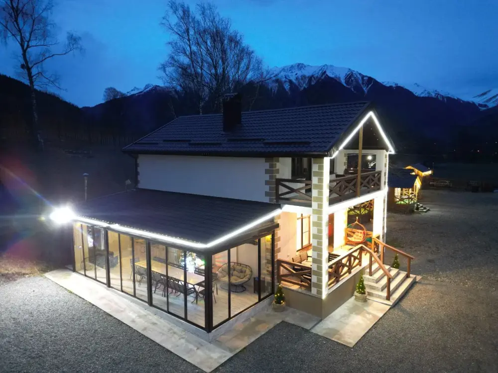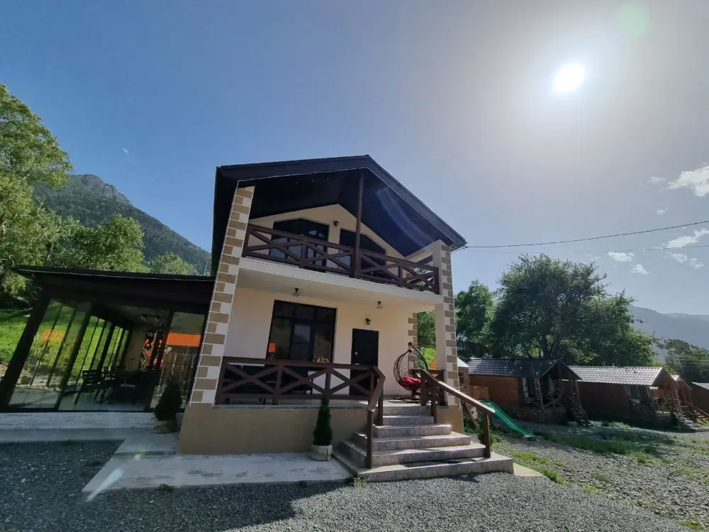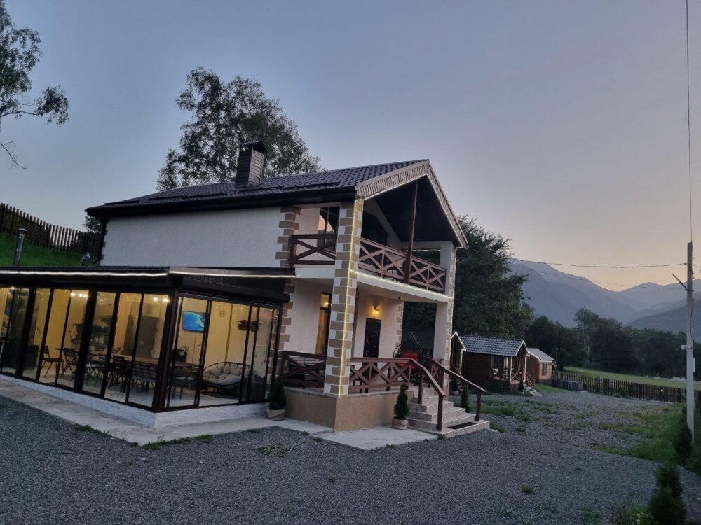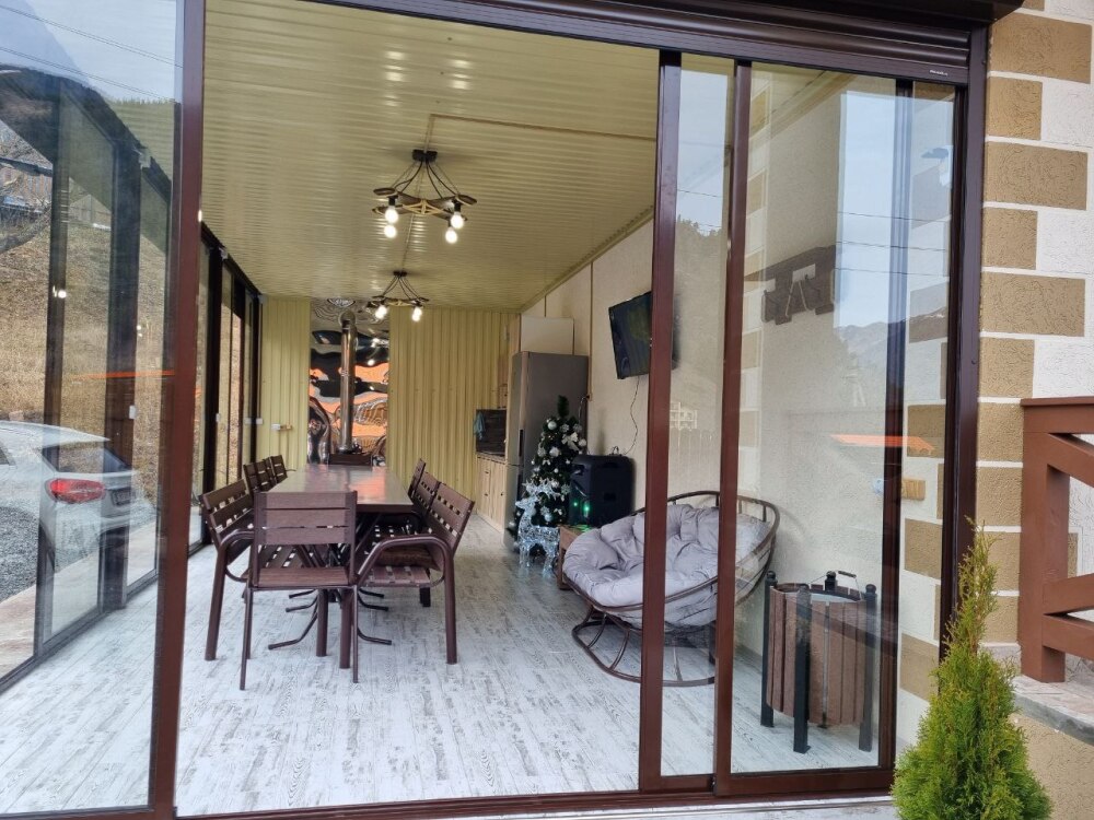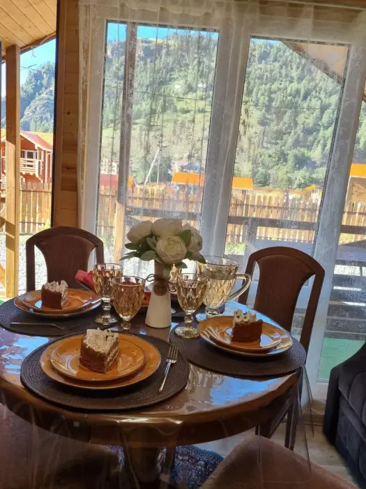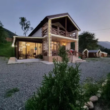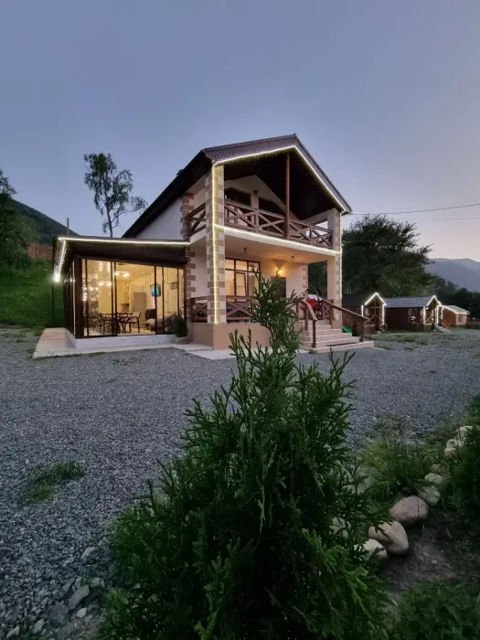 Вмещает 12 гостей, с камином на дровах в самом шале, с зимней панорамной верандой с камином на дровах, кухонной зоной, с техникой и посудой, с караоке системой, мангальной зоной и приватной парковкой, приглашает желающих получить удовольствие от тишины гор и красоты ущелья, а комфорт и уют за нами.