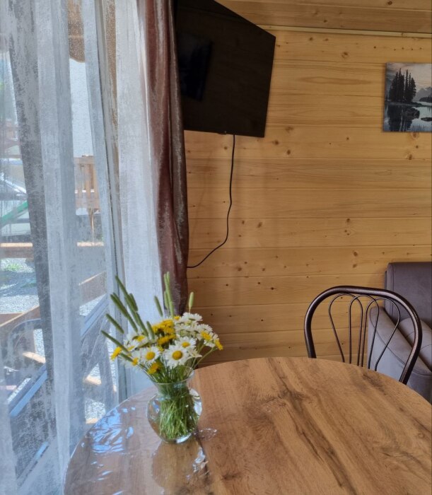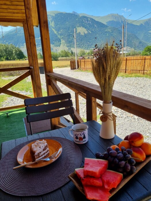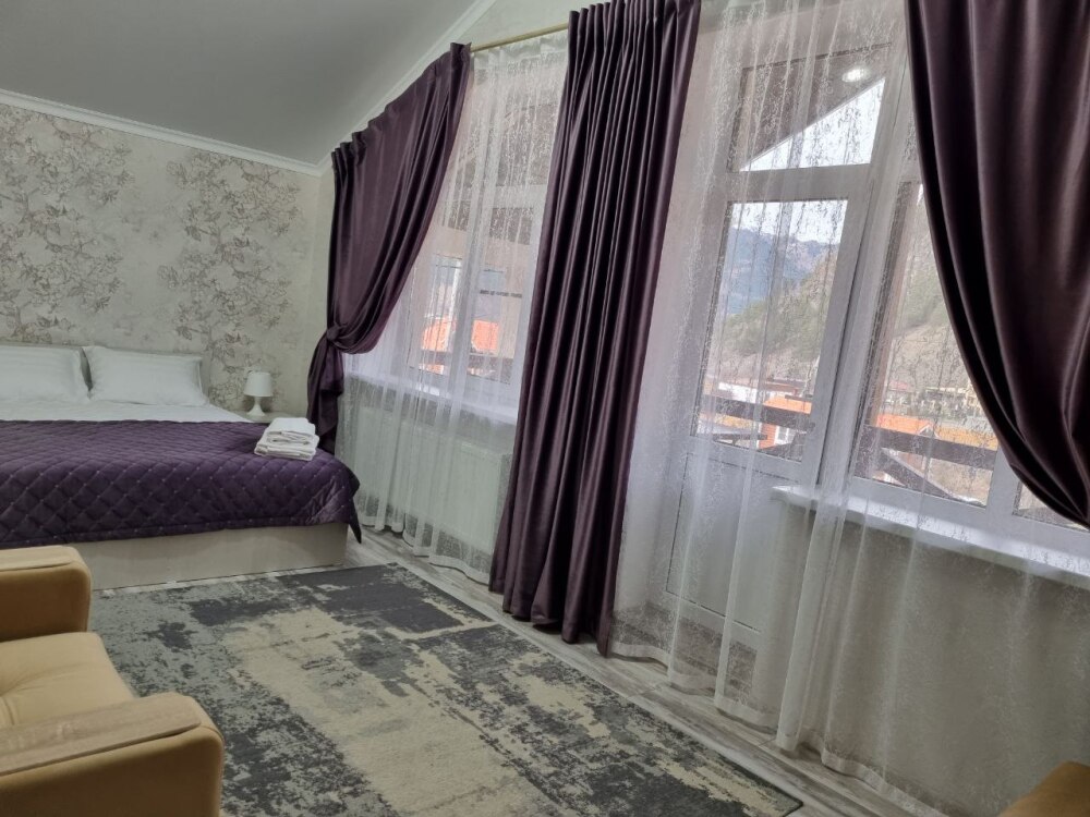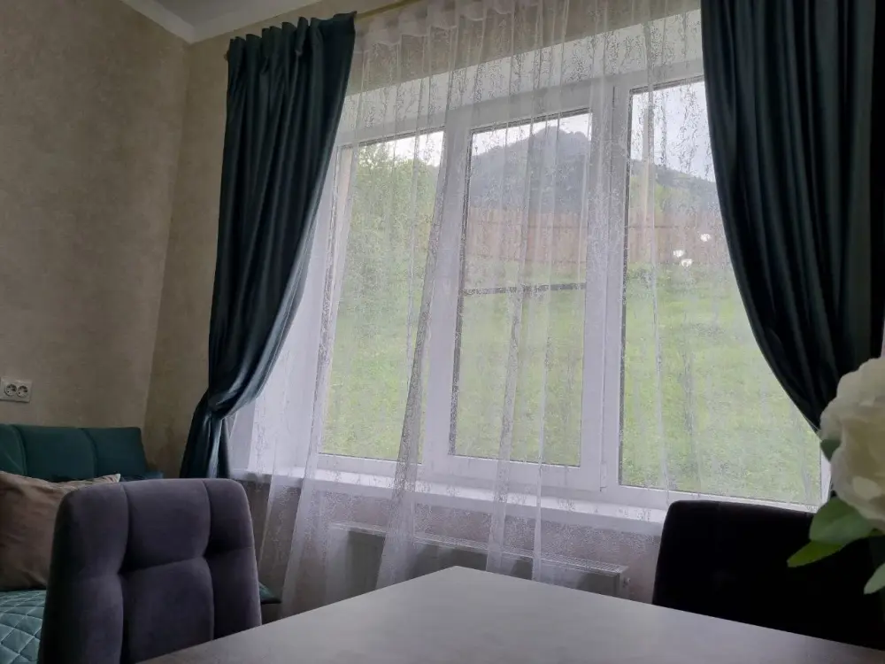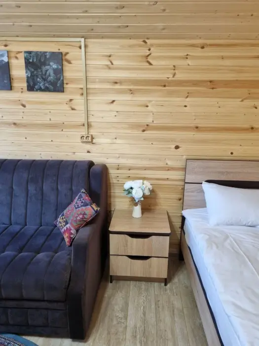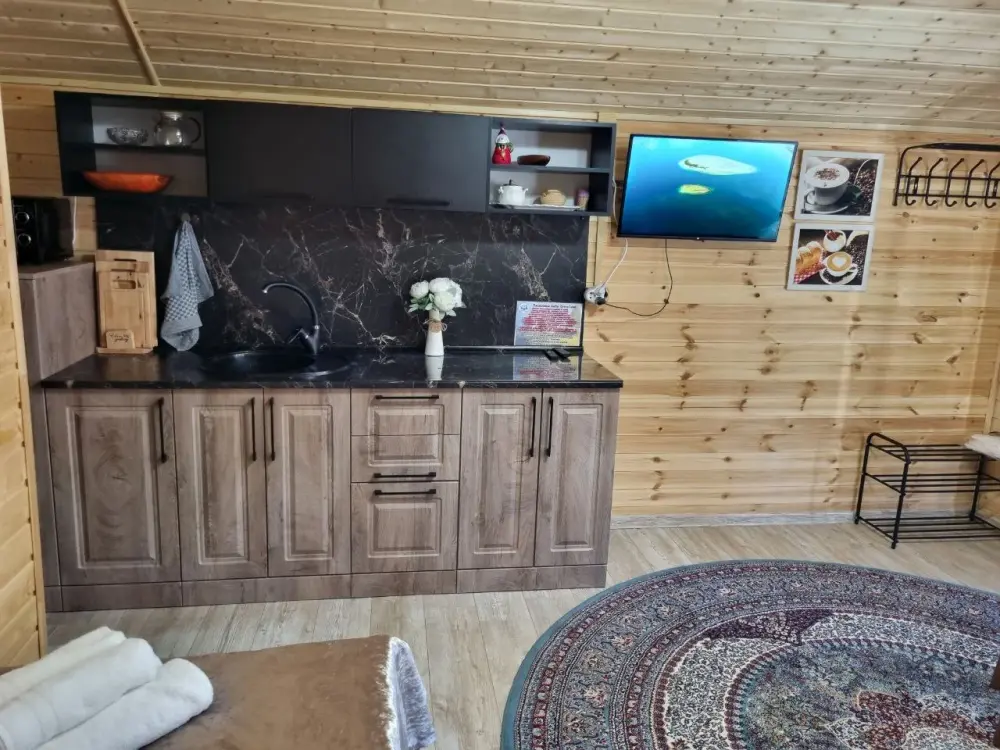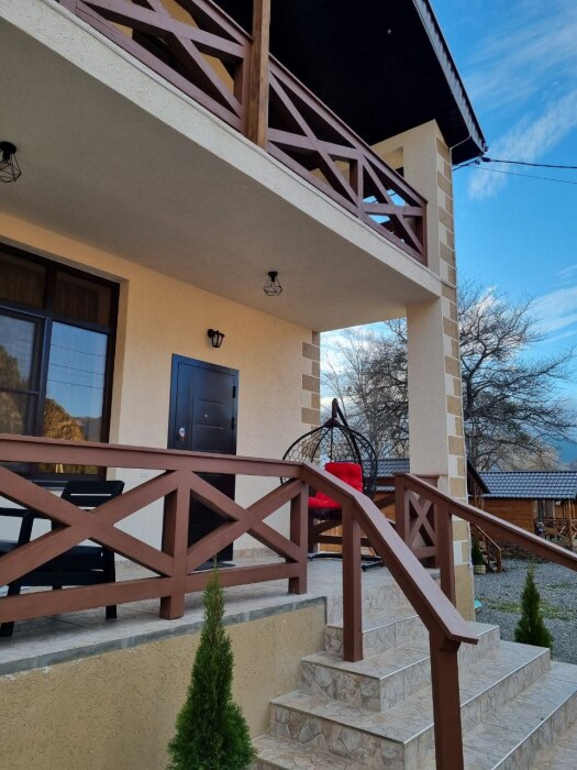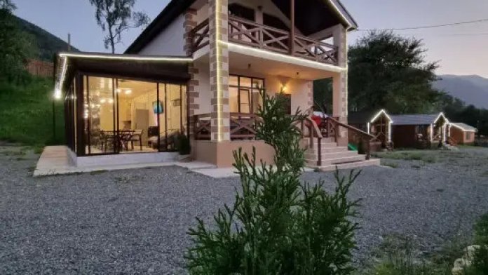Вмещает 12 гостей, с камином на дровах в самом шале, с зимней панорамной верандой с камином на дровах, кухонной зоной, с техникой и посудой, с караоке системой, мангальной зоной и приватной парковкой, приглашает желающих получить удовольствие от тишины гор и красоты ущелья, а комфорт и уют за нами.