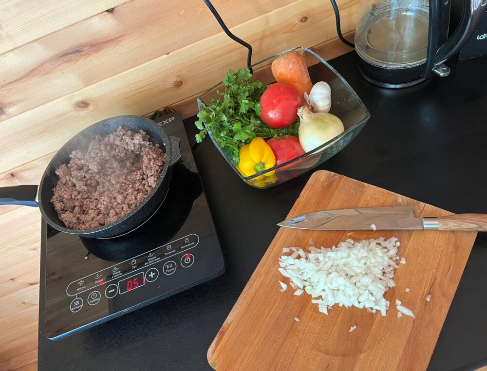 Наши дома оснащены всей необходимой техникой, посудой для длительного комфортного проживания и отдыха: телевизор, микроволновка, чайник, индукционная плита, холодильник, фен, утюг, сушилка, гладильная доска. А также : мангал, шампуры, решетки, казан.