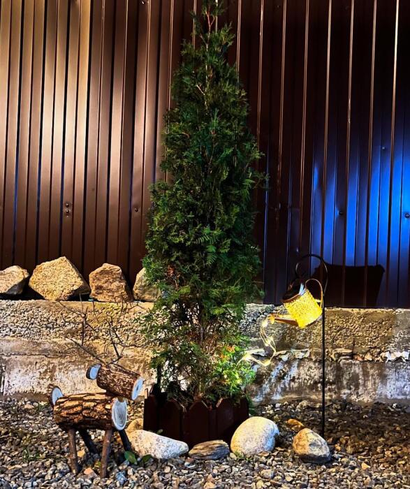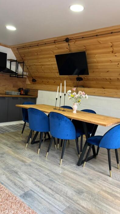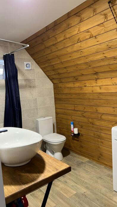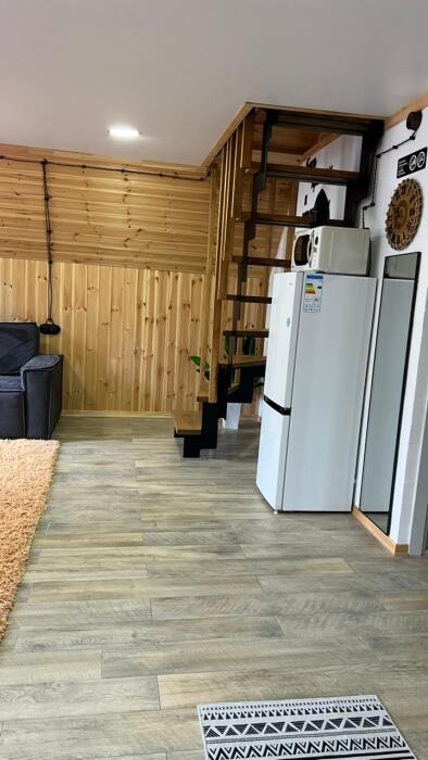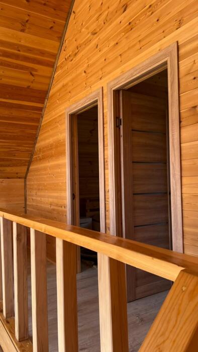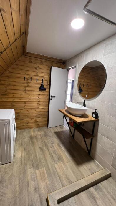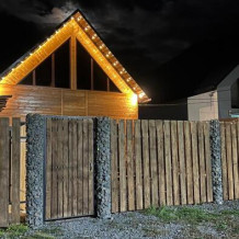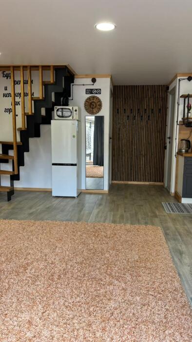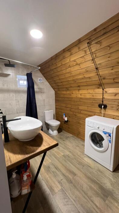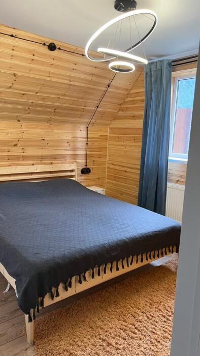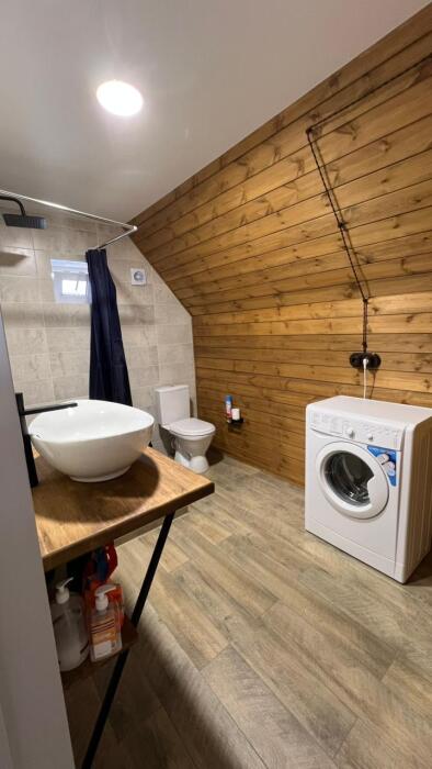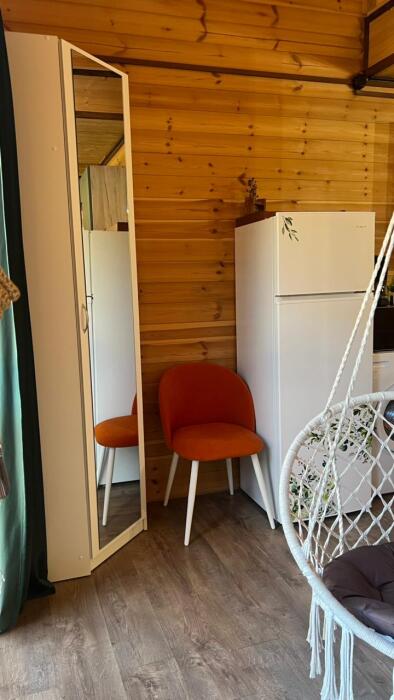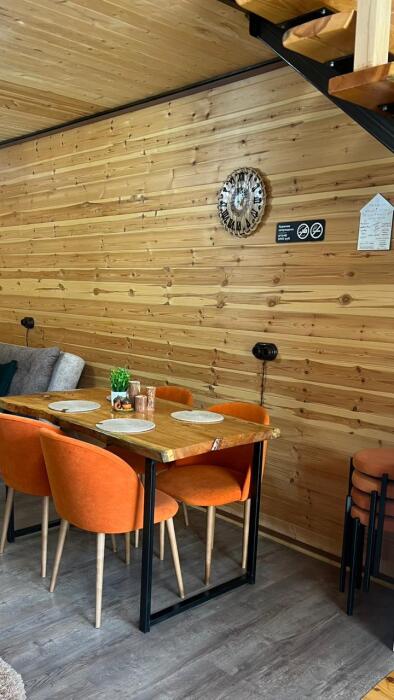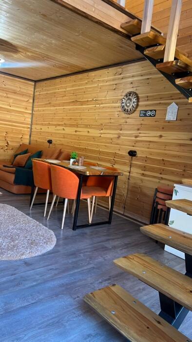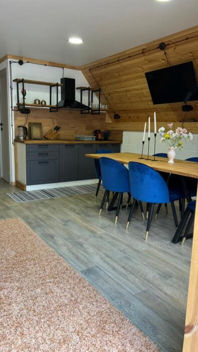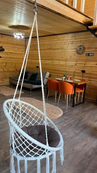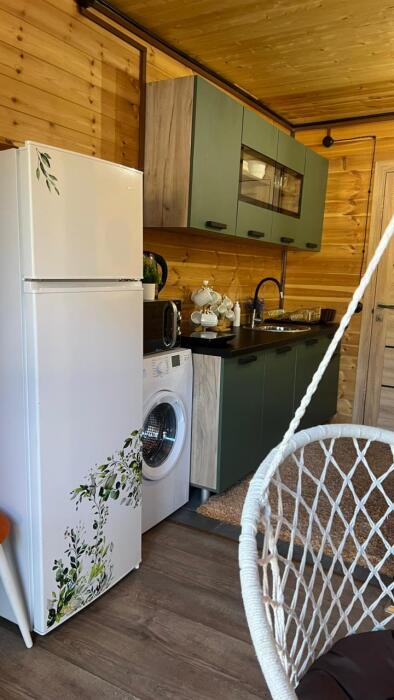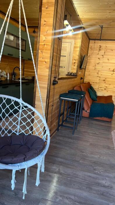 Очаровательный деревянный фасад, красиво оформленный сад с яркими цветами и ухоженной зеленью, создают неповторимую атмосферу уюта и гармонии. Внутри домика гостей ждет стильный и уютно обставленный интерьер, где каждая деталь продумана до мелочей. Просторная спальня с удобной кроватью, уютная гостиная с мягкими диванами и камином, полностью оборудованная кухня с современной бытовой техникой.