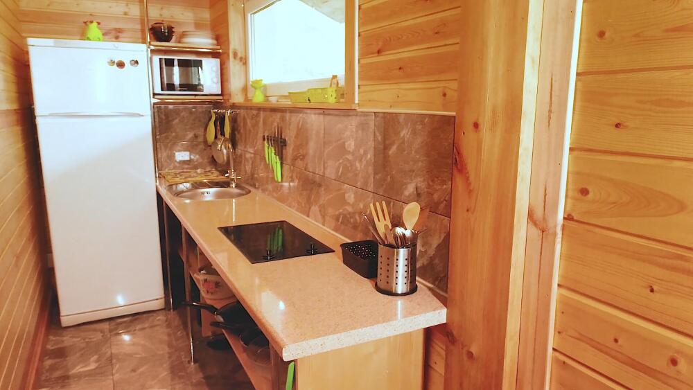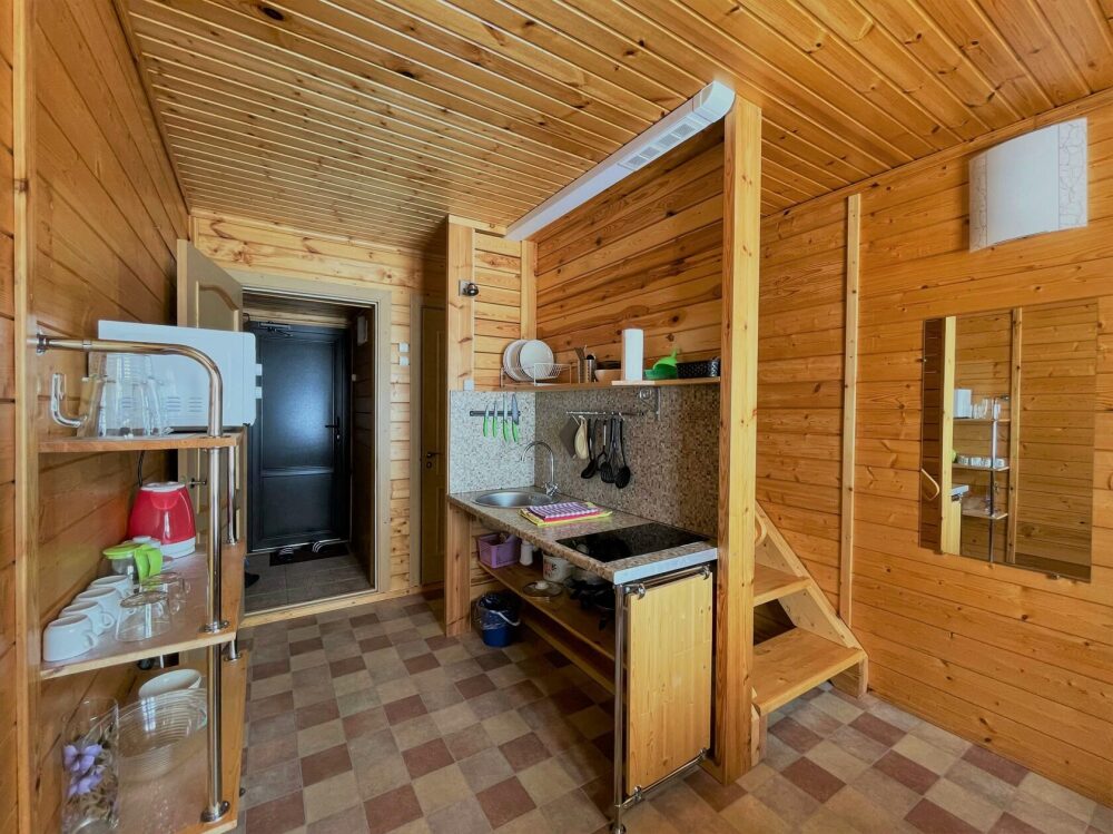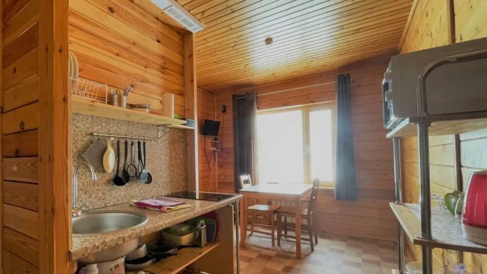 В кухне-гостиной имеется холодильник, электрическая варочная панель, чайник, микроволновая печь, обеденная зона, посуда для приготовления и сервировки.