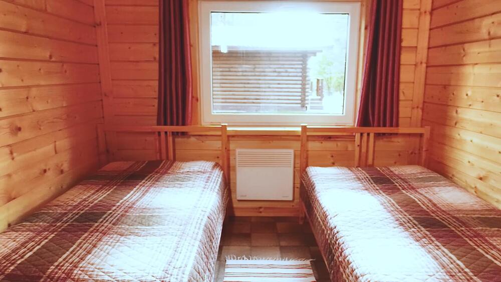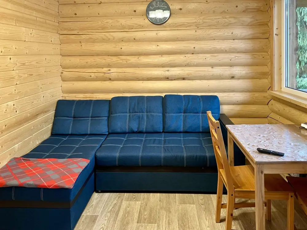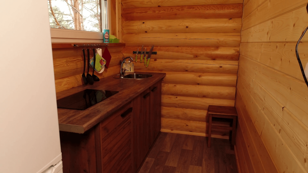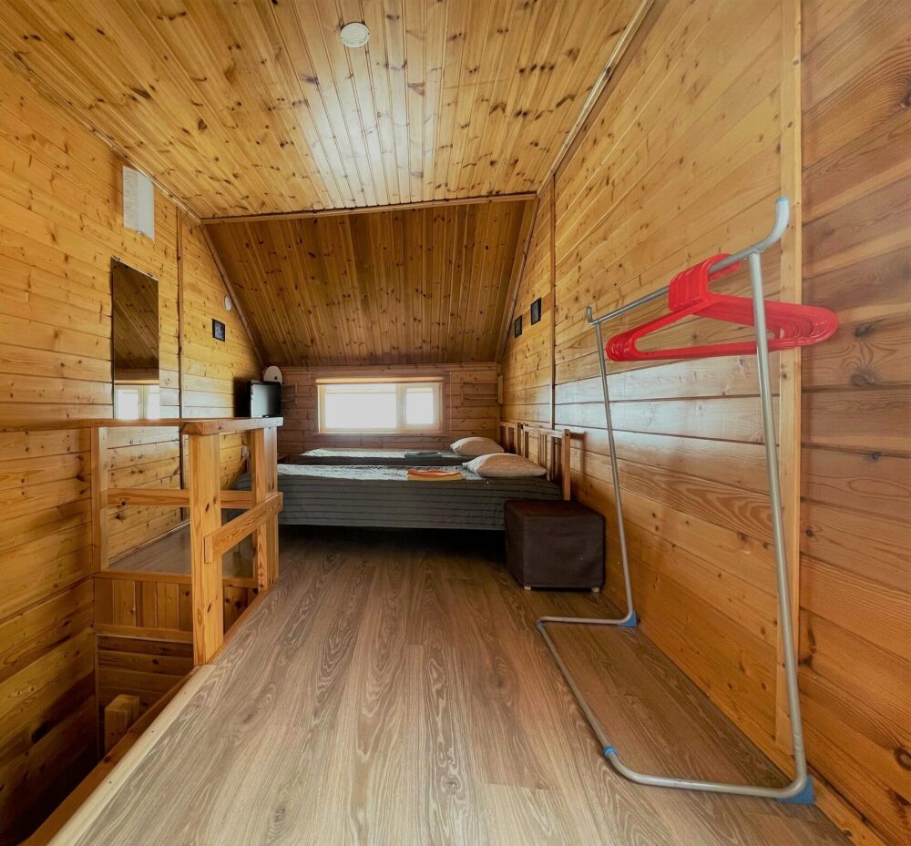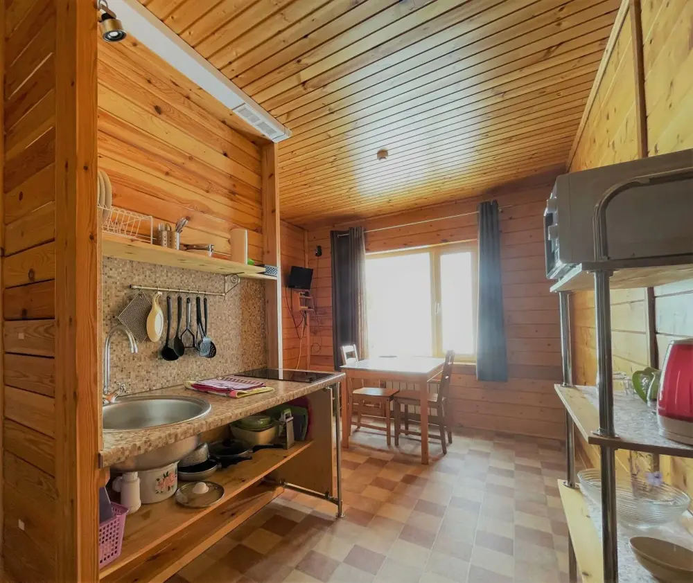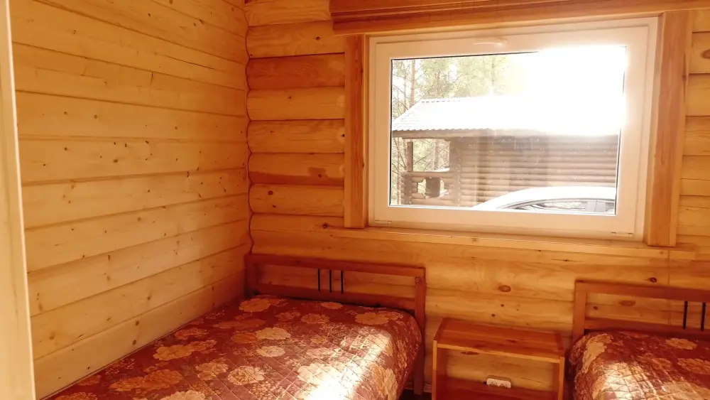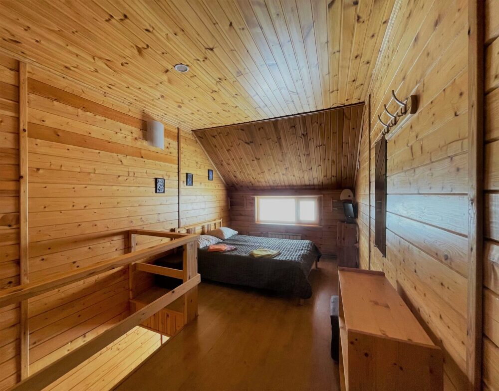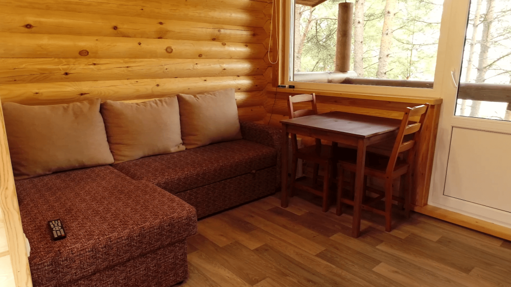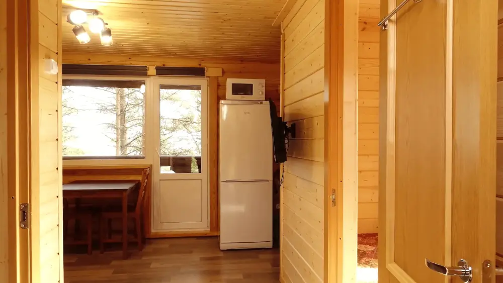Коттедж оборудован кухней-гостиной, отдельной спальней с двумя 1,5-спальными кроватями, собственной ванной комнатой с тёплым полом и террасой с видом на озеро.