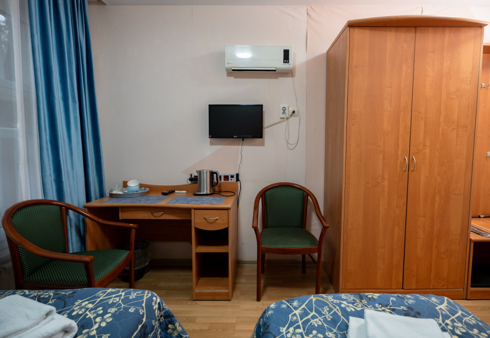 В номере есть всё для отдыха и быта: шкаф, телевизор, стол, стулья.