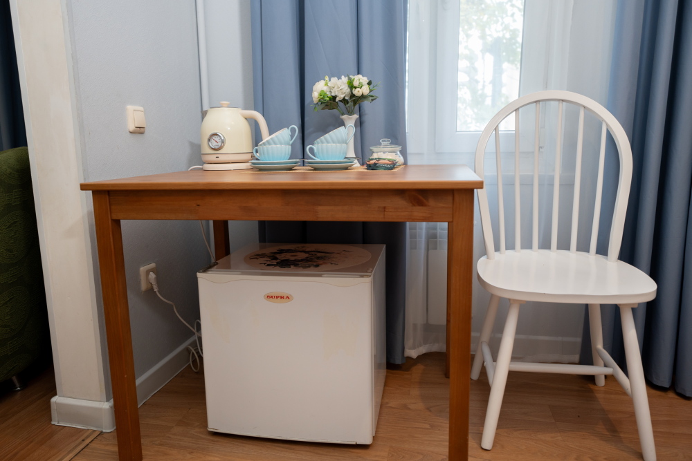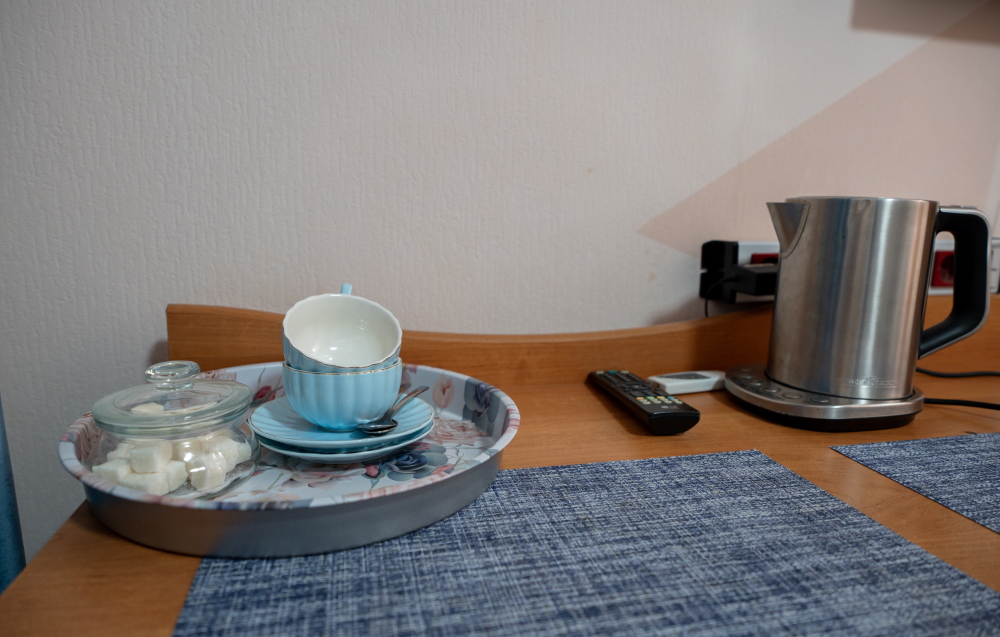 Чайная зона: электрический чайник, чай, сахар и чайная пара позволят в любой момент приготовить горячий напиток, не выходя из комнаты.
