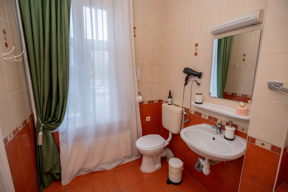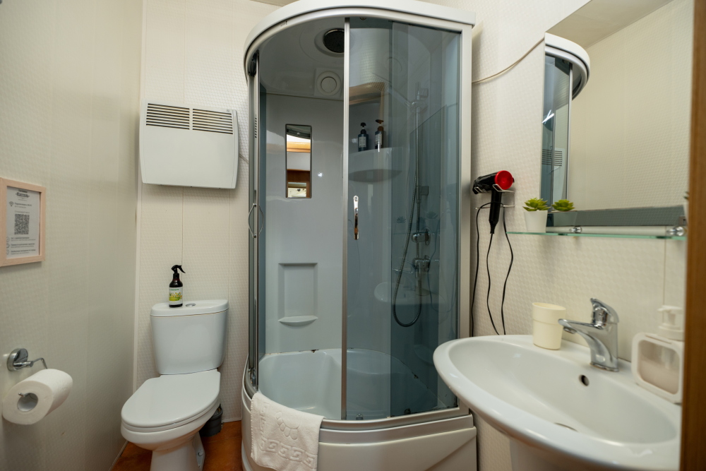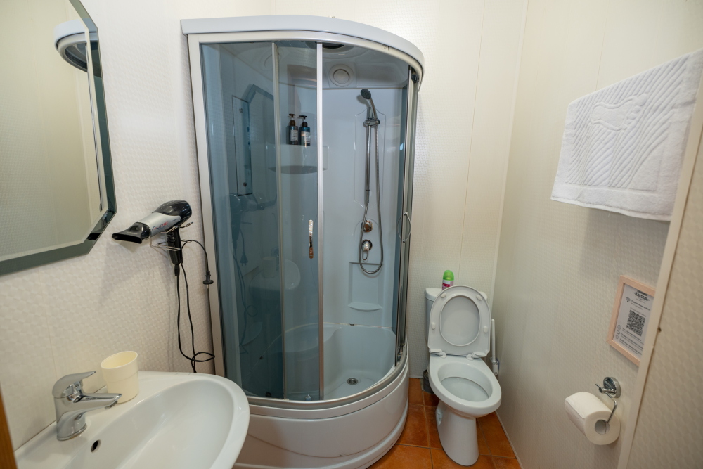Санузел: чистый и современный санузел с душевой кабиной общий на два номера и находится прямо рядом с Вашей комнатой.