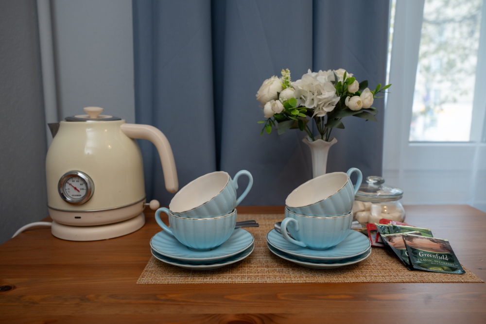 Чайная зона: электрический чайник, чай, сахар и чашки позволят в любой момент приготовить горячий напиток.