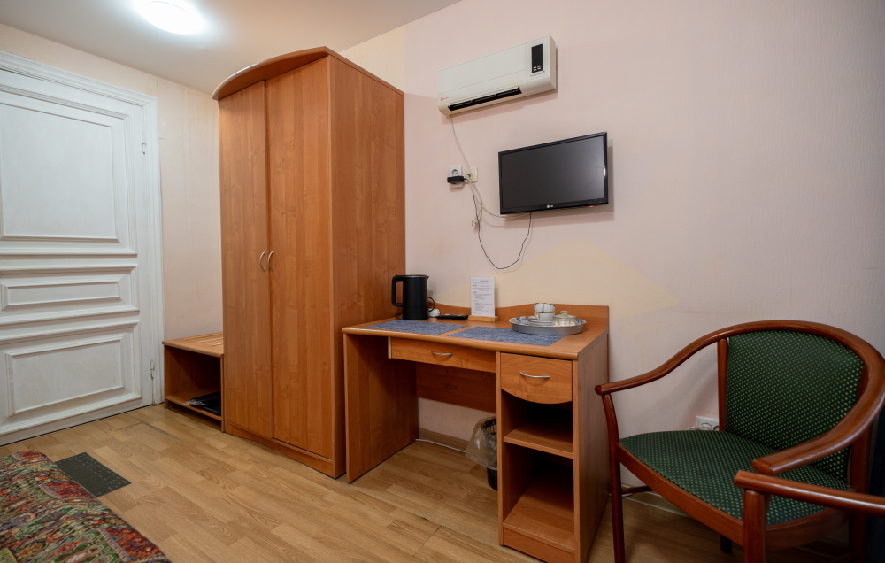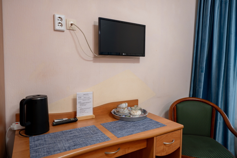 В номере есть всё для работы и отдыха: письменный стол, стул, шкаф, телевизор.