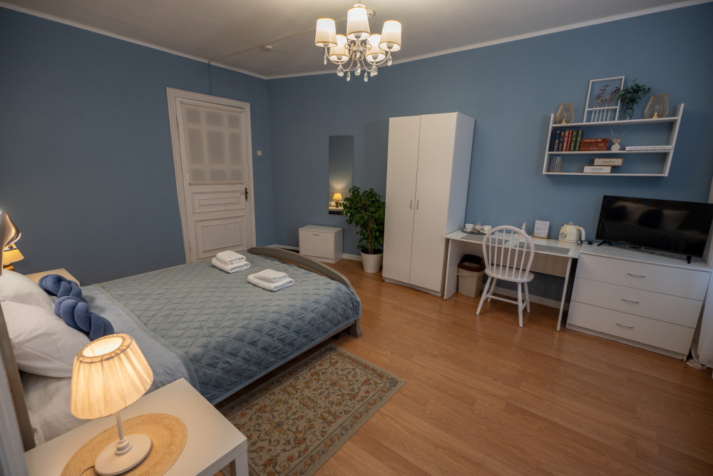 Всё необходимое под рукой: мы предусмотрели всё для Вашего удобства: платяной шкаф, письменный стол со стульями, телевизор, холодильник и электрический чайник с чайным набором (чай, сахар, чашки).