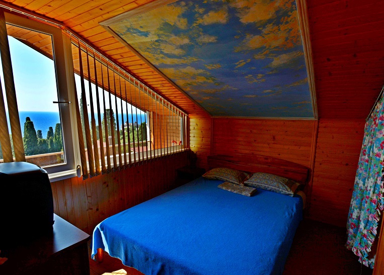 Это 3 этаж дома, там две комнаты, одна из них «проходная», этаж рассчитан на 5 чел. На этаже есть всё необходимое для комфортного отдыха: кухня, душ, туалет, Wi-Fi, TV, кондиционер… Есть большой балкон, с которого открывается панорамный вид на море.