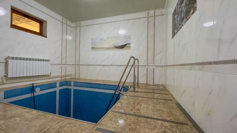 Баня на дровах с бассейном. Из бани выход к озеру, где можно искупаться.