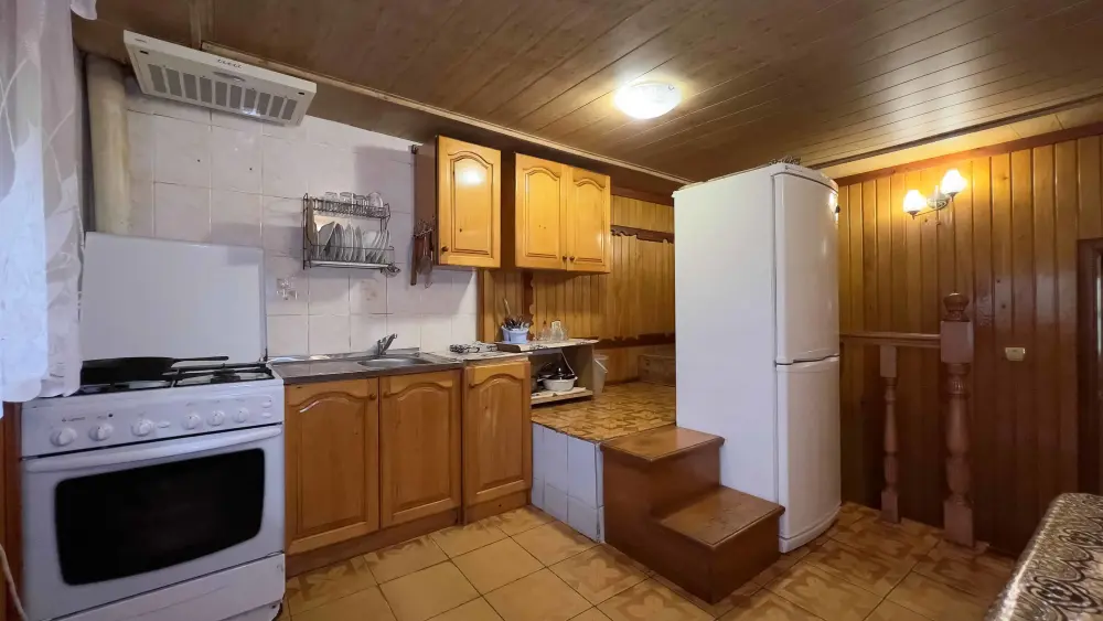 Есть все необходимое: плита, мангал, холодильник, посуда, полотенца, веники, фен, микроволновка, стиральная машина, чайник.