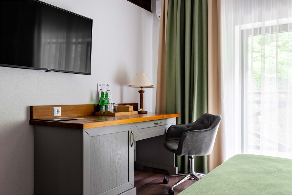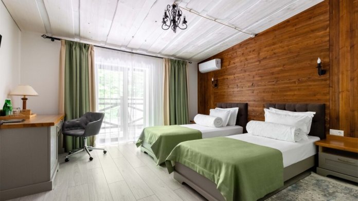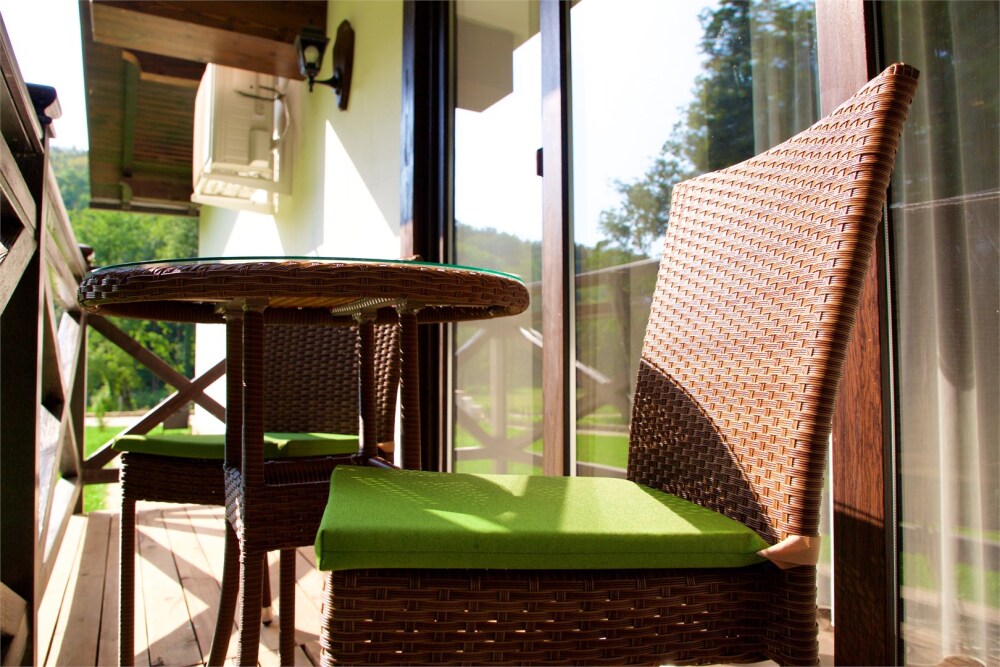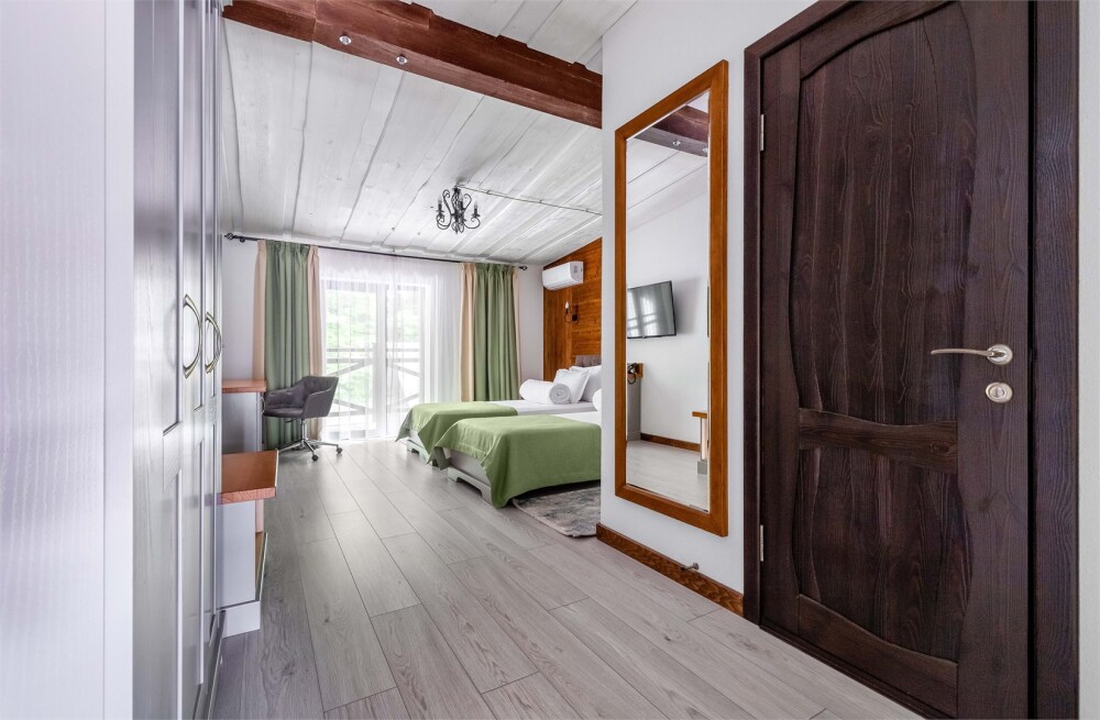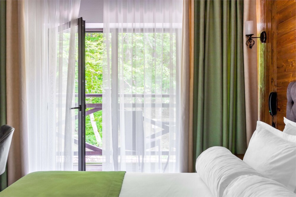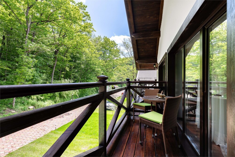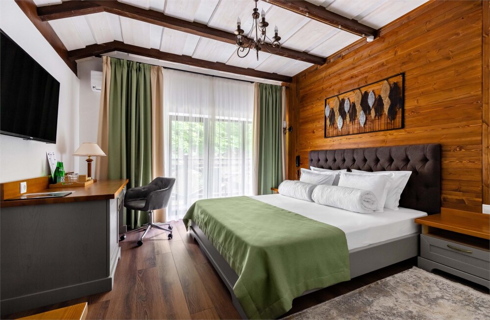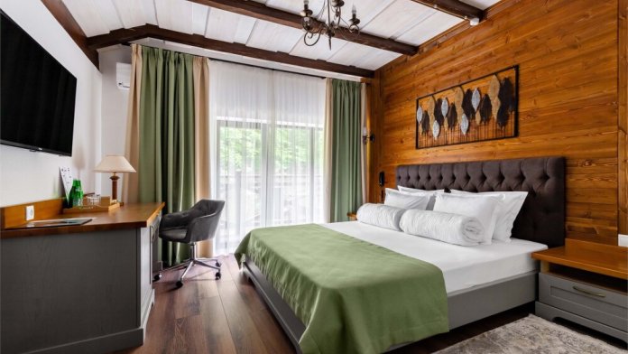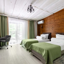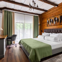В элегантном однокомнатном номере мебель и предметы интерьера выполнены из эко-материалов, а все ткани натуральные и приятные на ощупь. В каждом номере балкон с видом на великолепный лес.