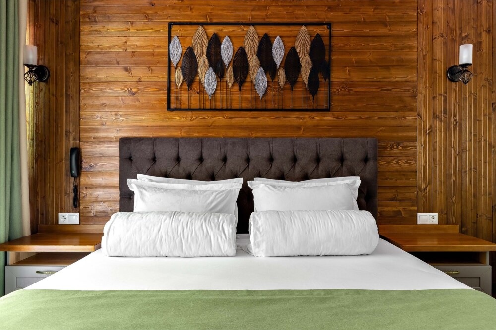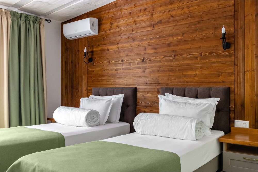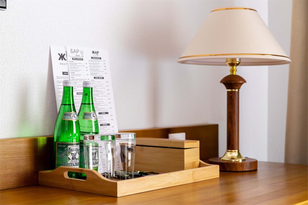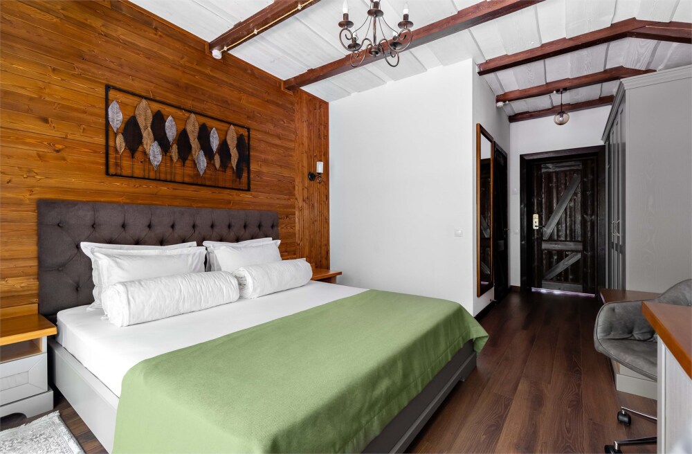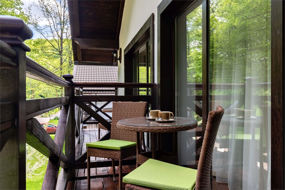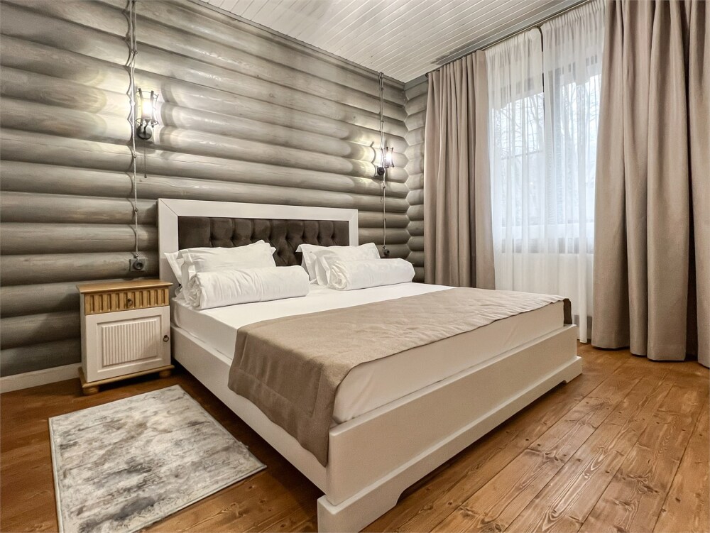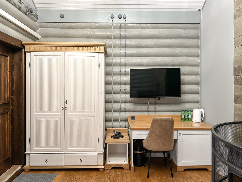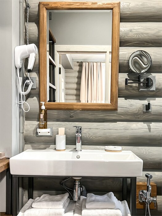 В элегантном однокомнатном номере мебель и предметы интерьера выполнены из эко-материалов, а все ткани натуральные и приятные на ощупь. В каждом номере балкон с видом на великолепный лес.