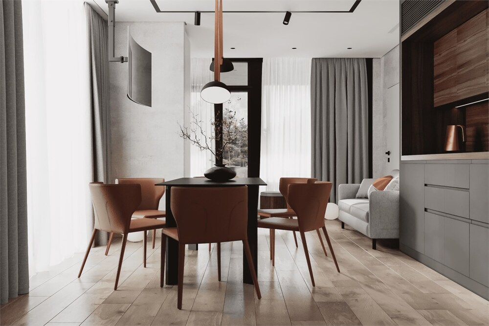 Из панорамных окон открываются живописные виды на хвойный лес и озеро.